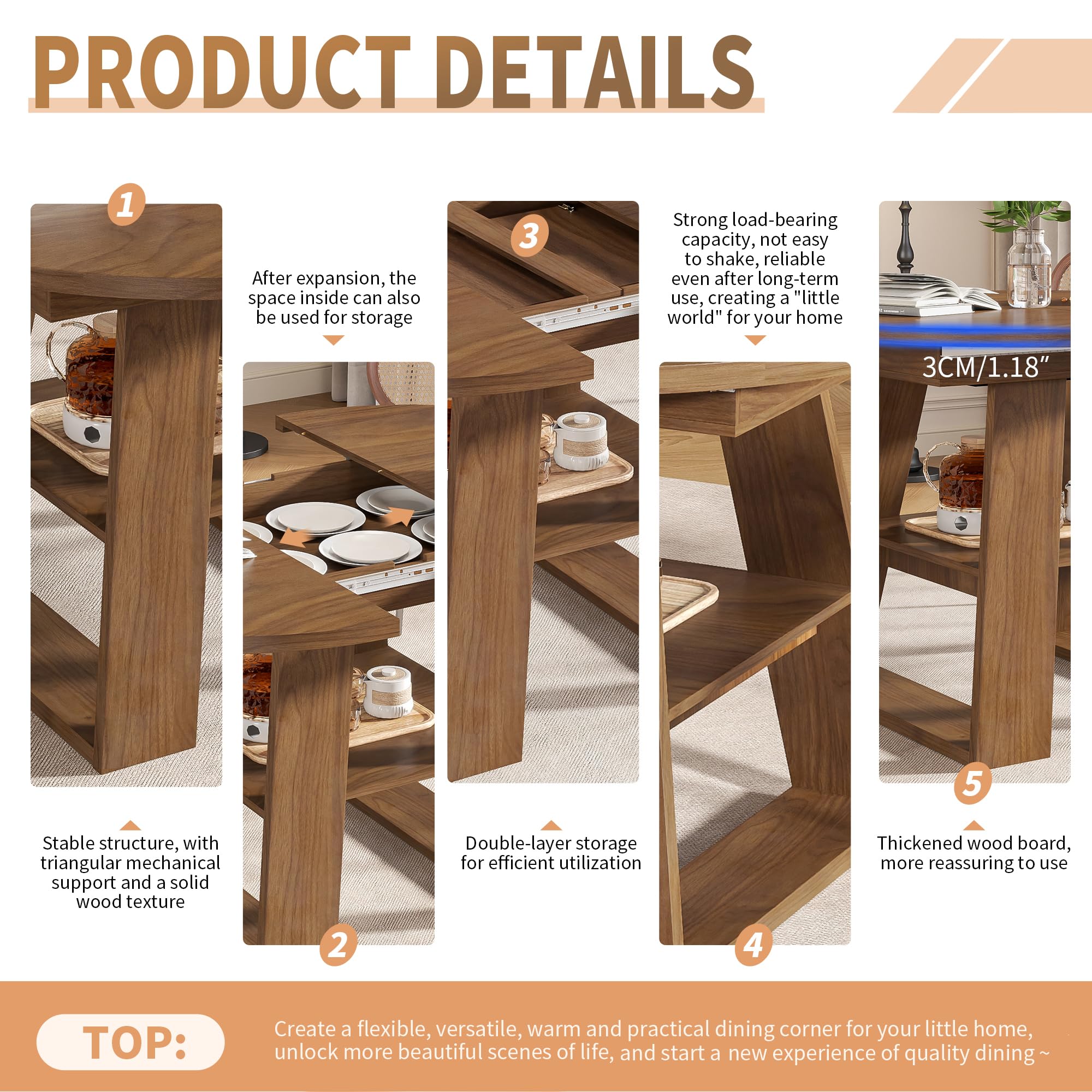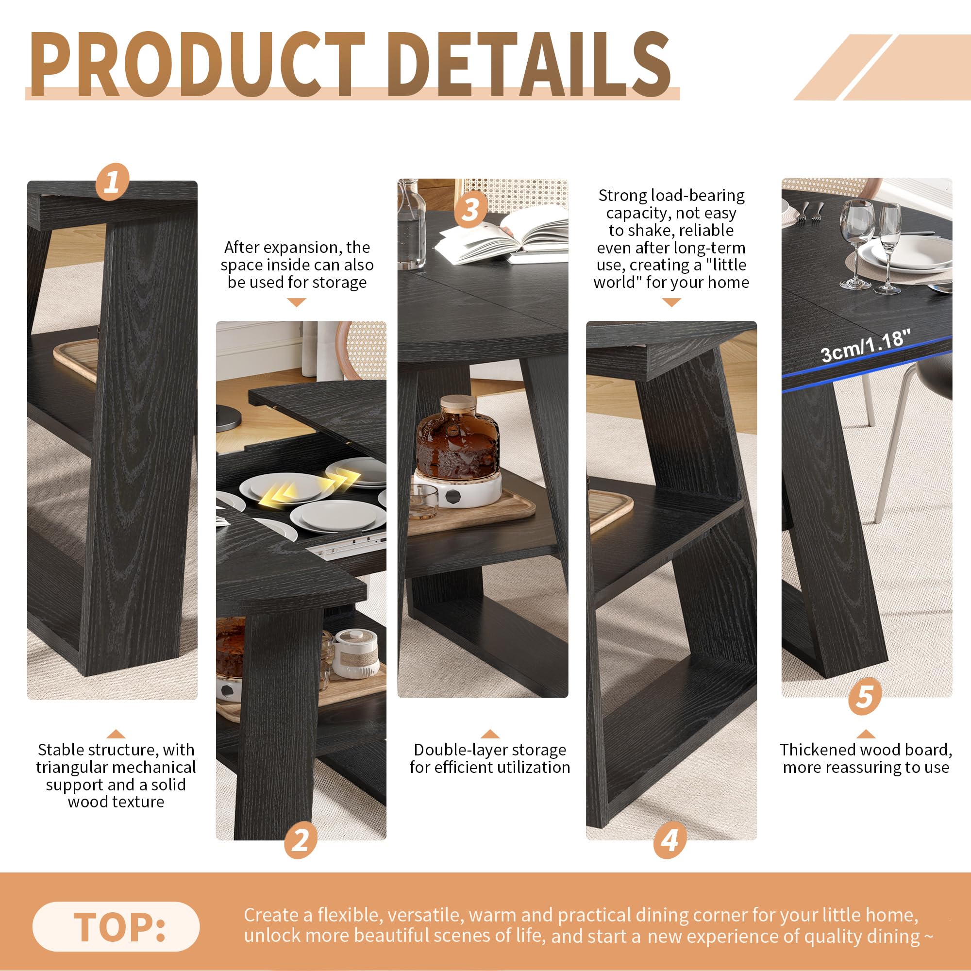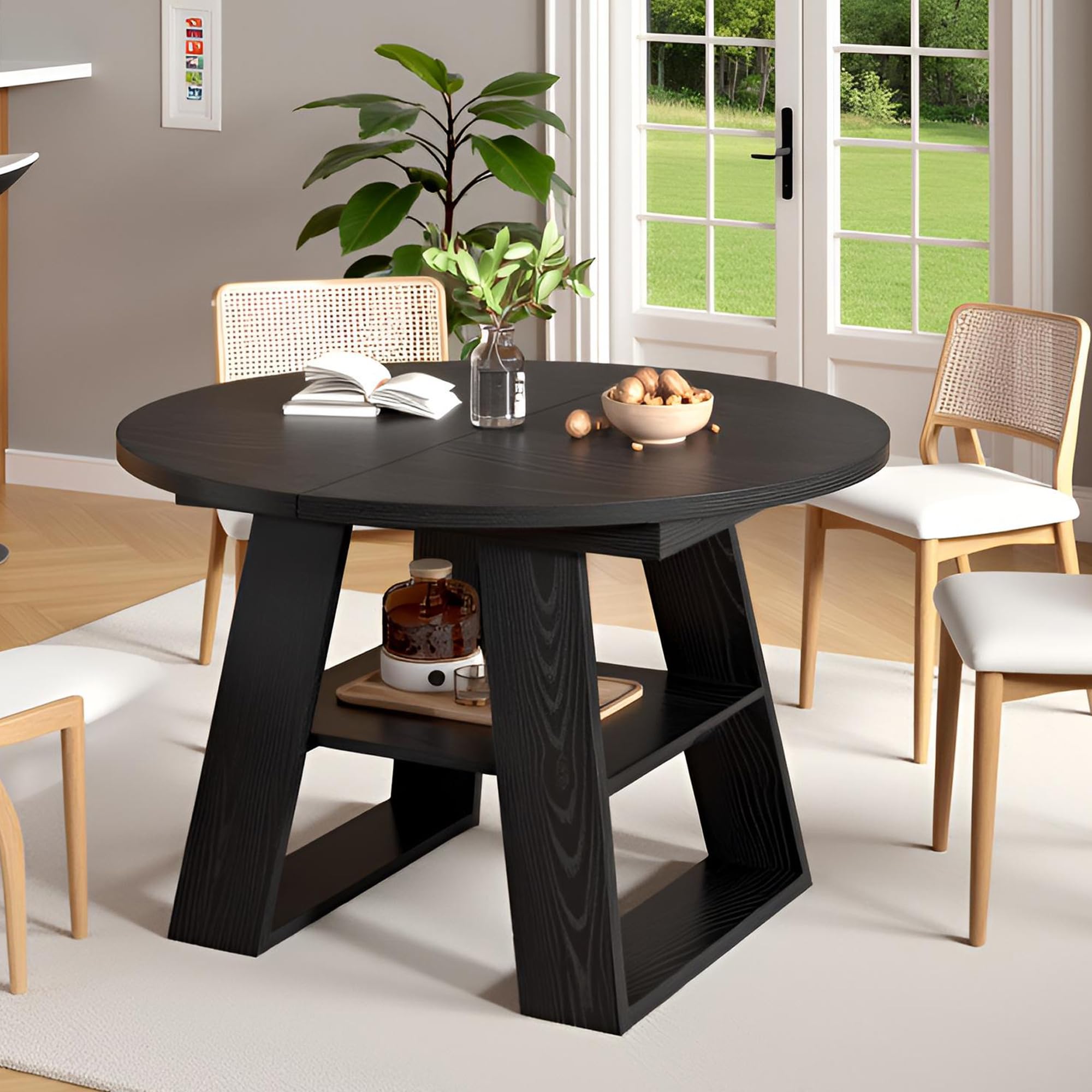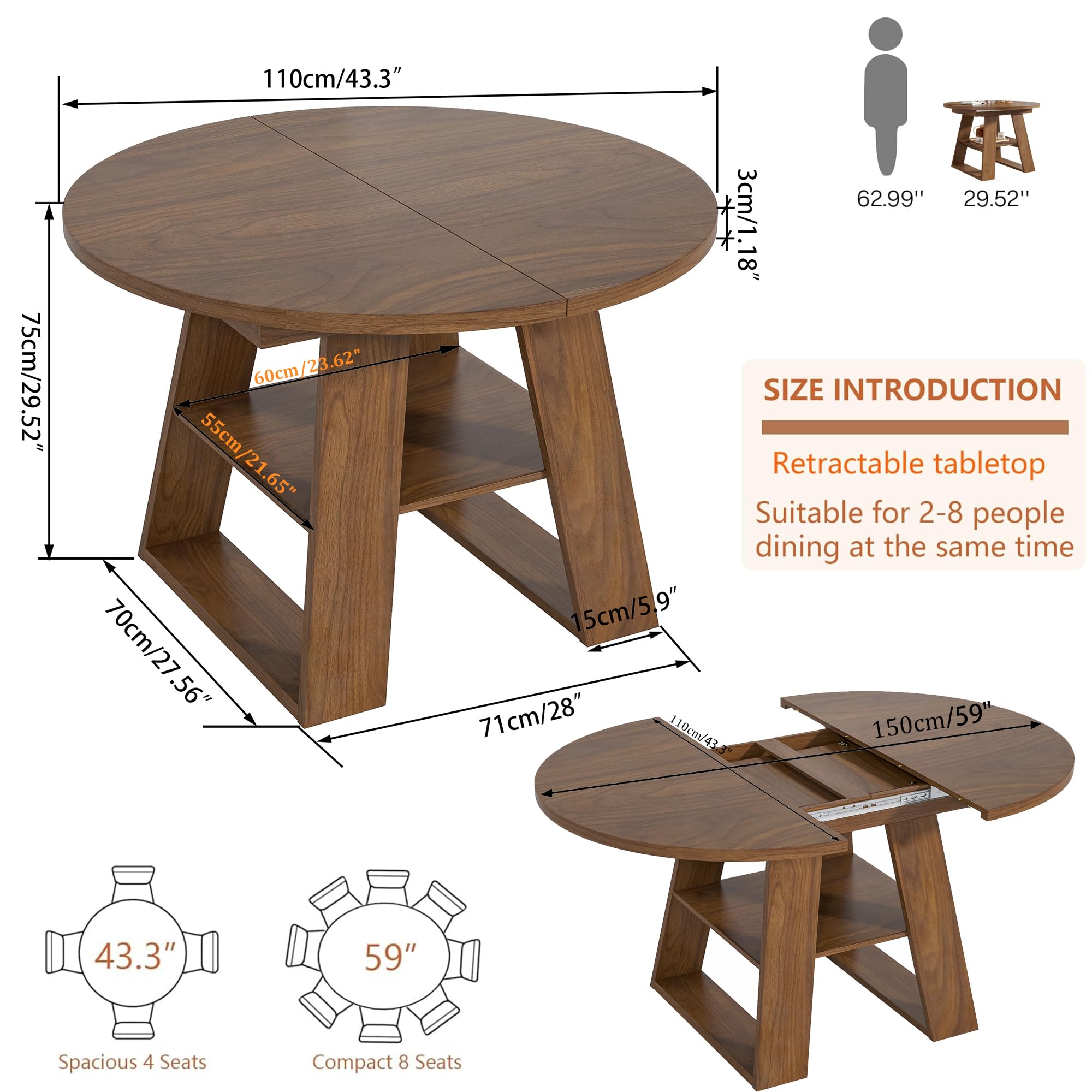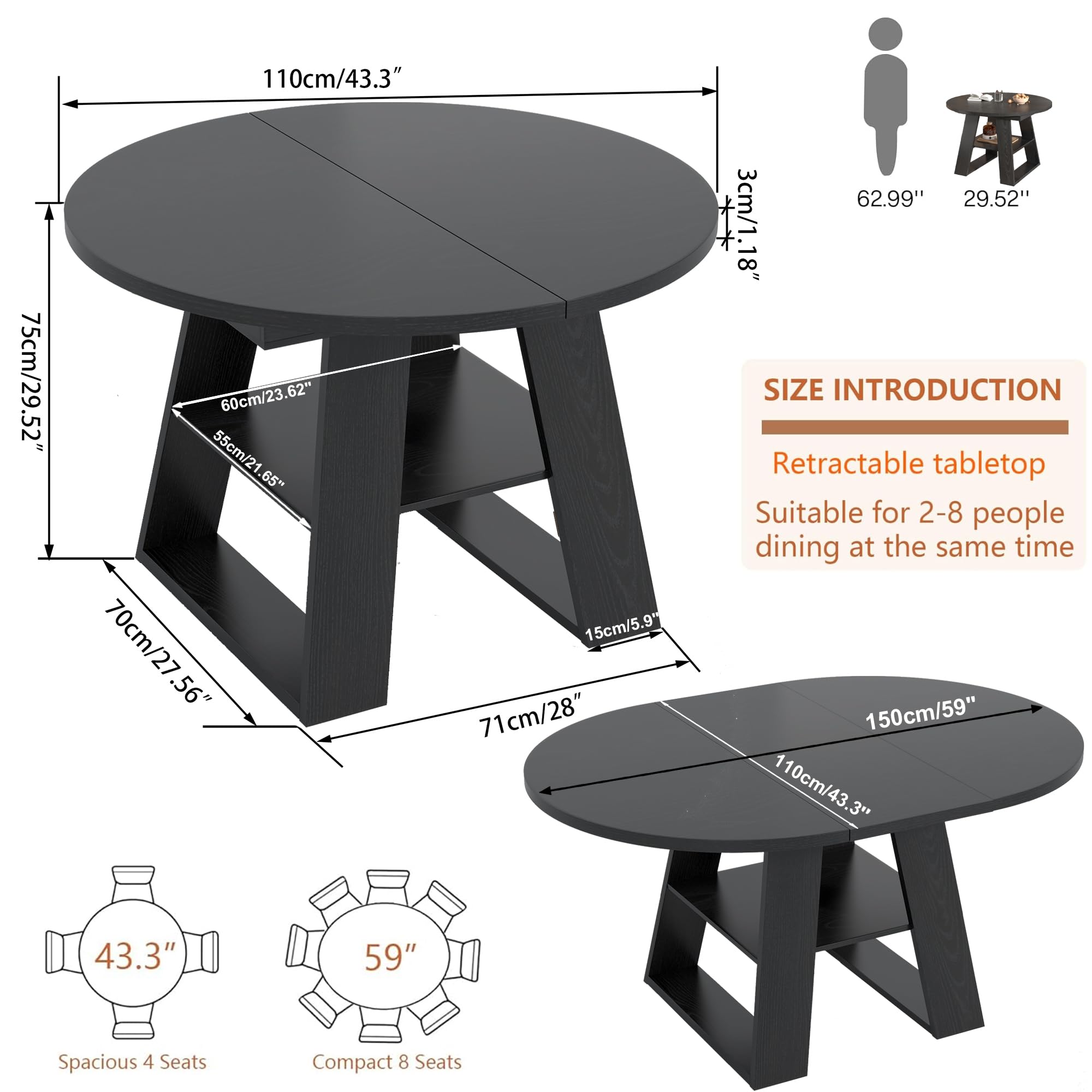 Retractable dining table for 4-8 people: Considering the use in different scenarios, the dining table adopts a retractable design and a smooth and silent rail. By assembling independent extension leaves in the middle of the dining table, it can be quickly and easily expanded from the original 43.3” round dining table to a 59” L x 43.3” W oval dining table. The extension leaves can be stored under the tabletop, making your space more flexible
