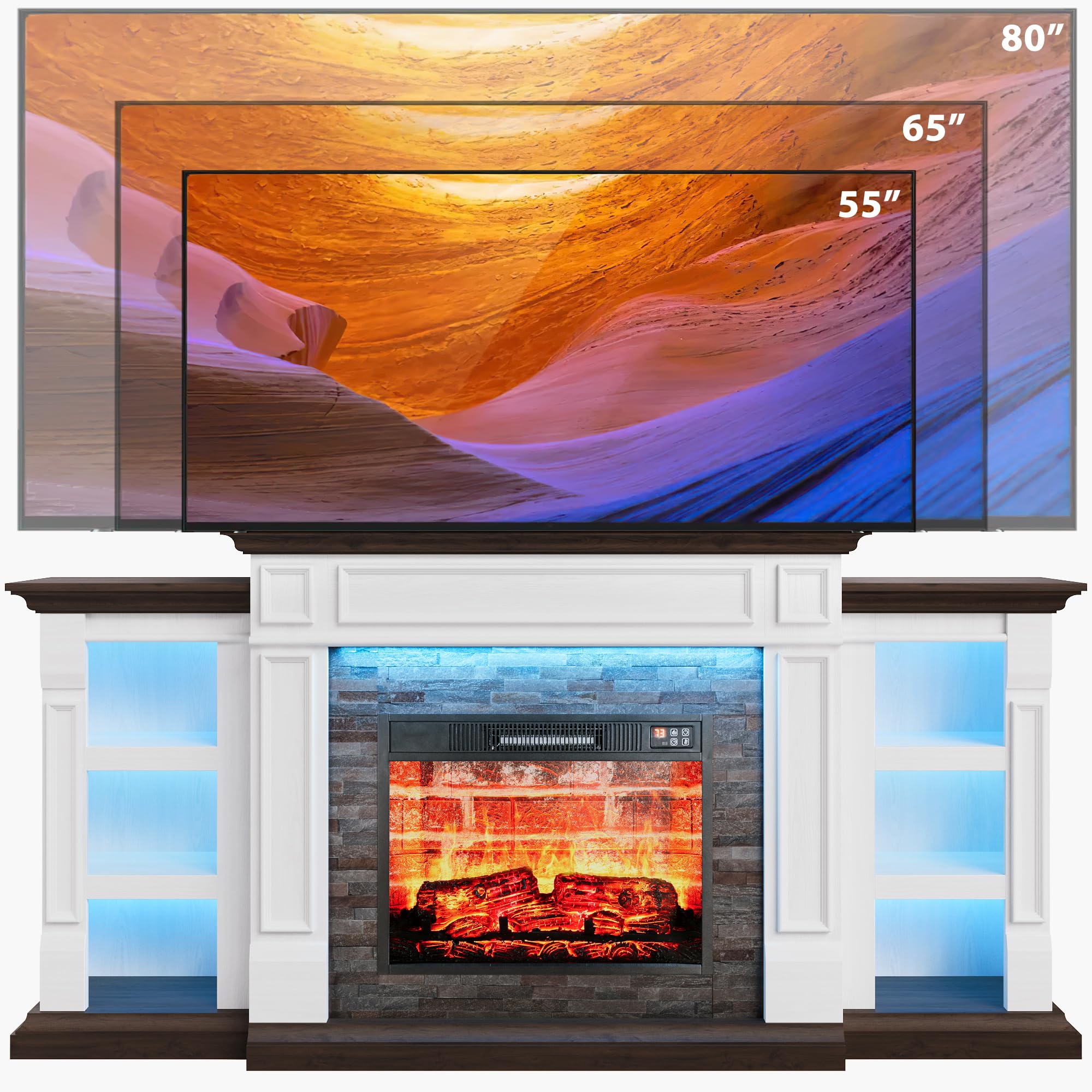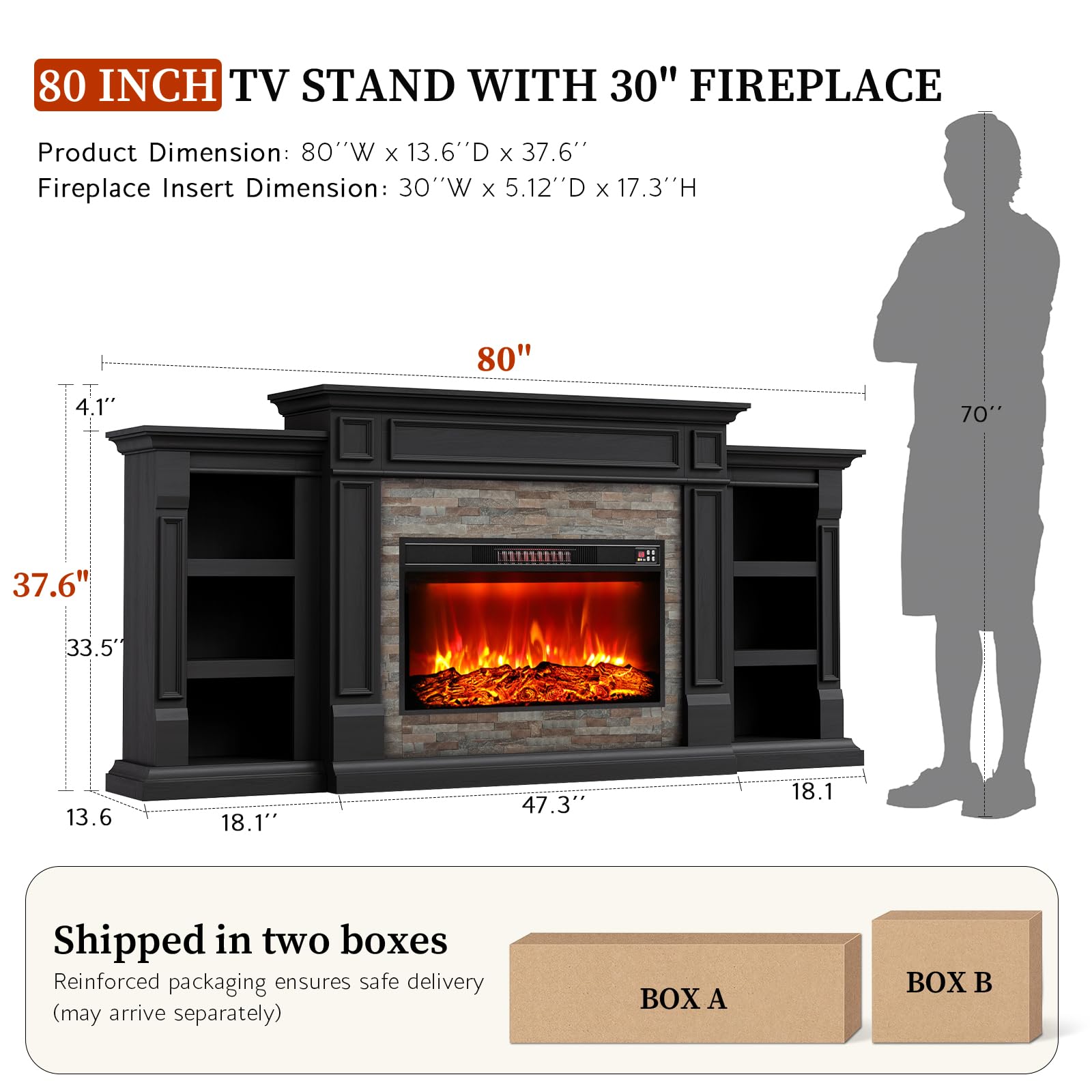 • 【Dimensions】The electric fireplace with mantel measures 13.6'' D x 80'' W x 37.6'' H, while the fireplace insert dimensions are 30'' W x 5.12'' D x 17.3'' H. This spacious design makes it a perfect addition to any living space, providing both functionality and style.