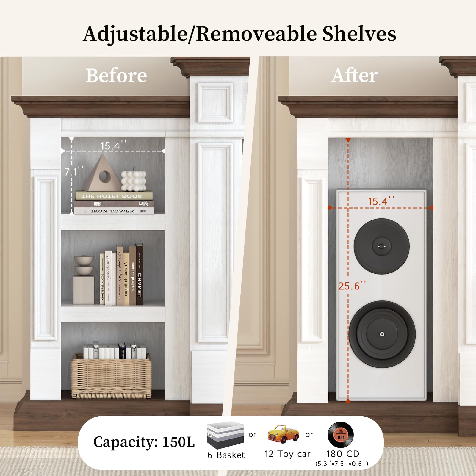 • 【Ample Storage Space】On either side of the electric fireplace, you’ll find three open shelves, perfect for storing CDs, remote controls, and other media or gaming devices. This thoughtful design not only keeps your essentials organized but also allows you to display your favorite decorations, enhancing your home decor.
