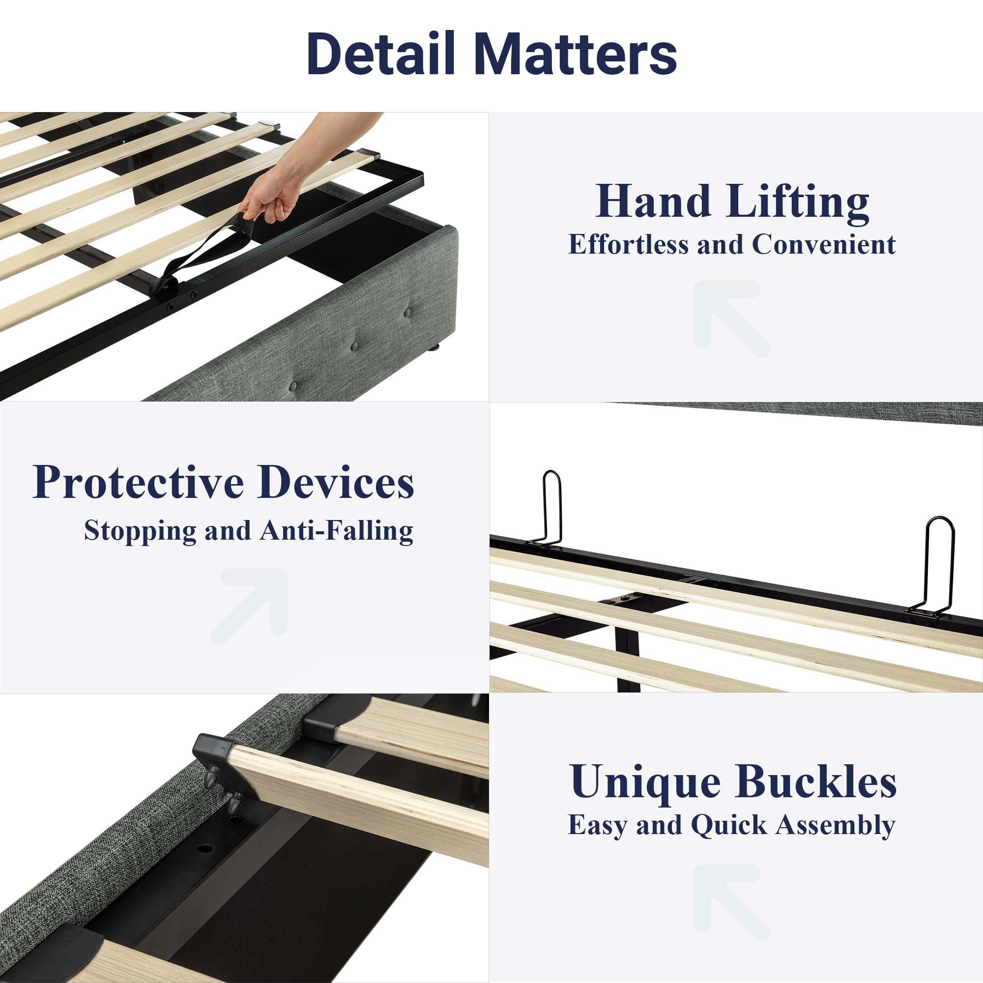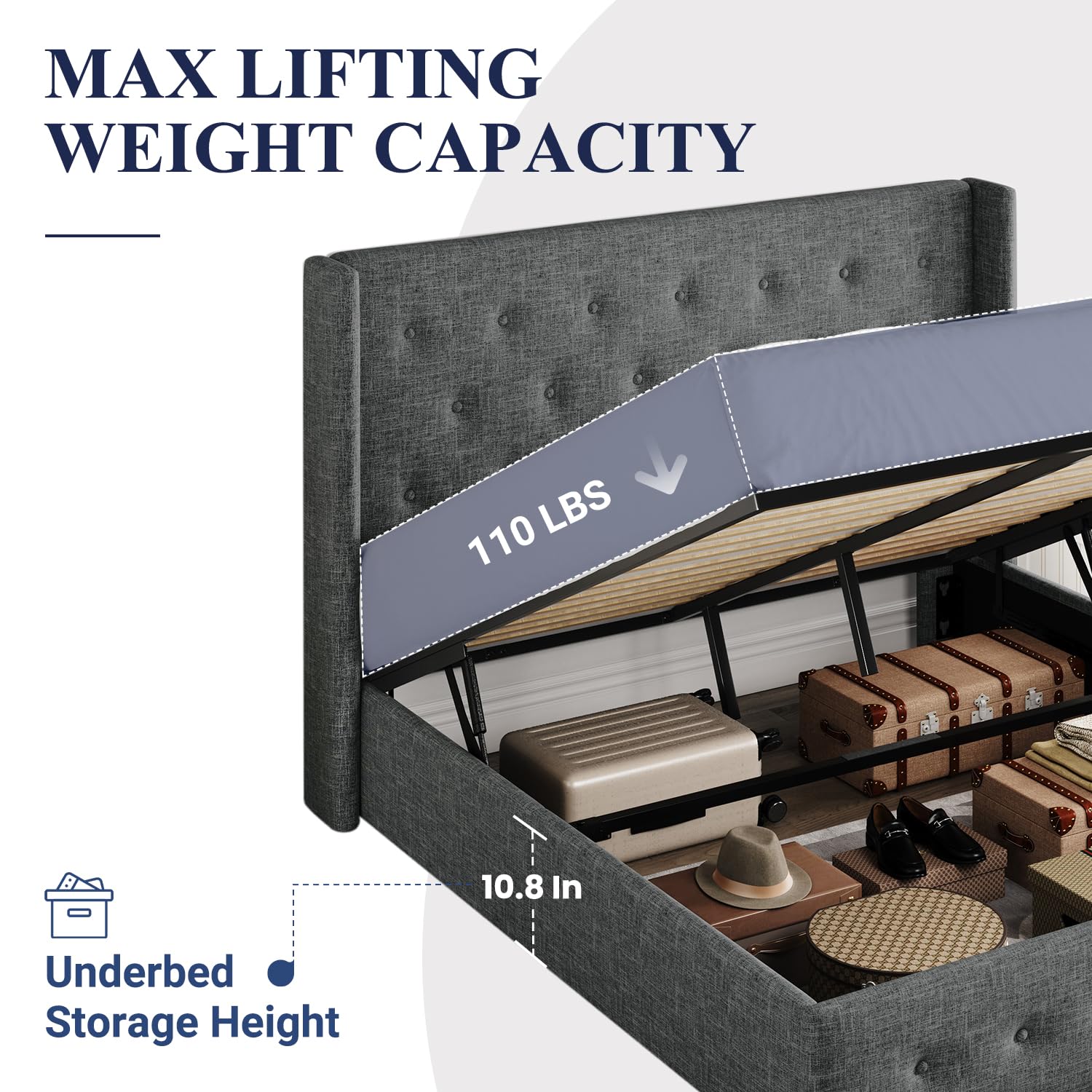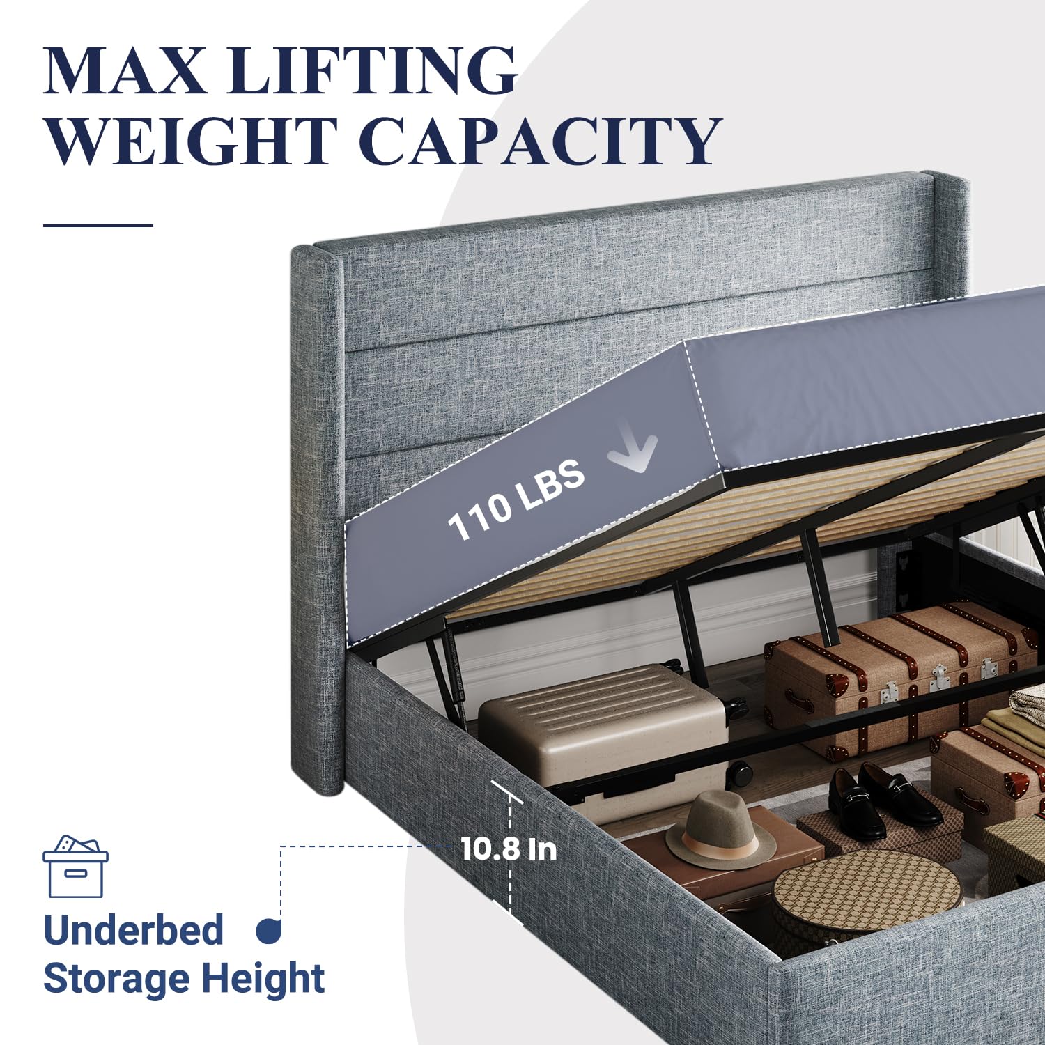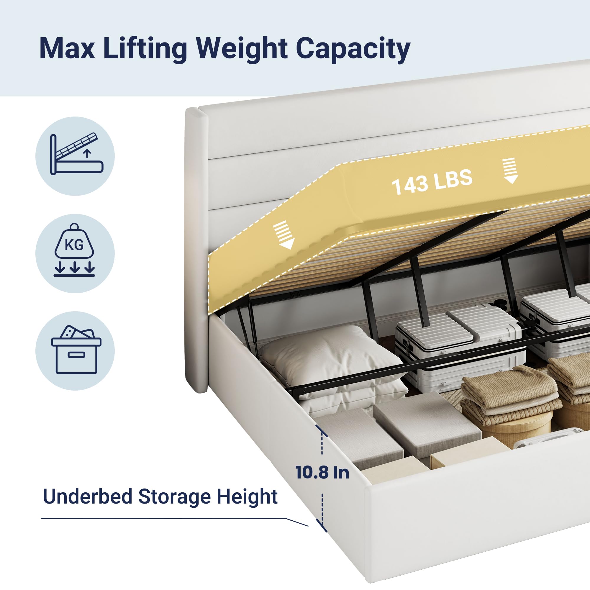 Space-Saving Storage: With its lifting up storage feature, this bed frame provides ample space to store extra bedding, clothing, shoes, and other items, especially helpful for smaller bedrooms or apartments where storage space is limited