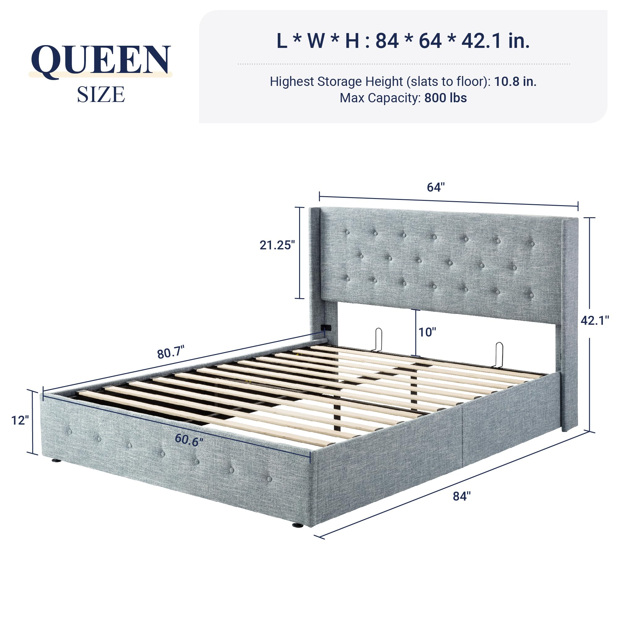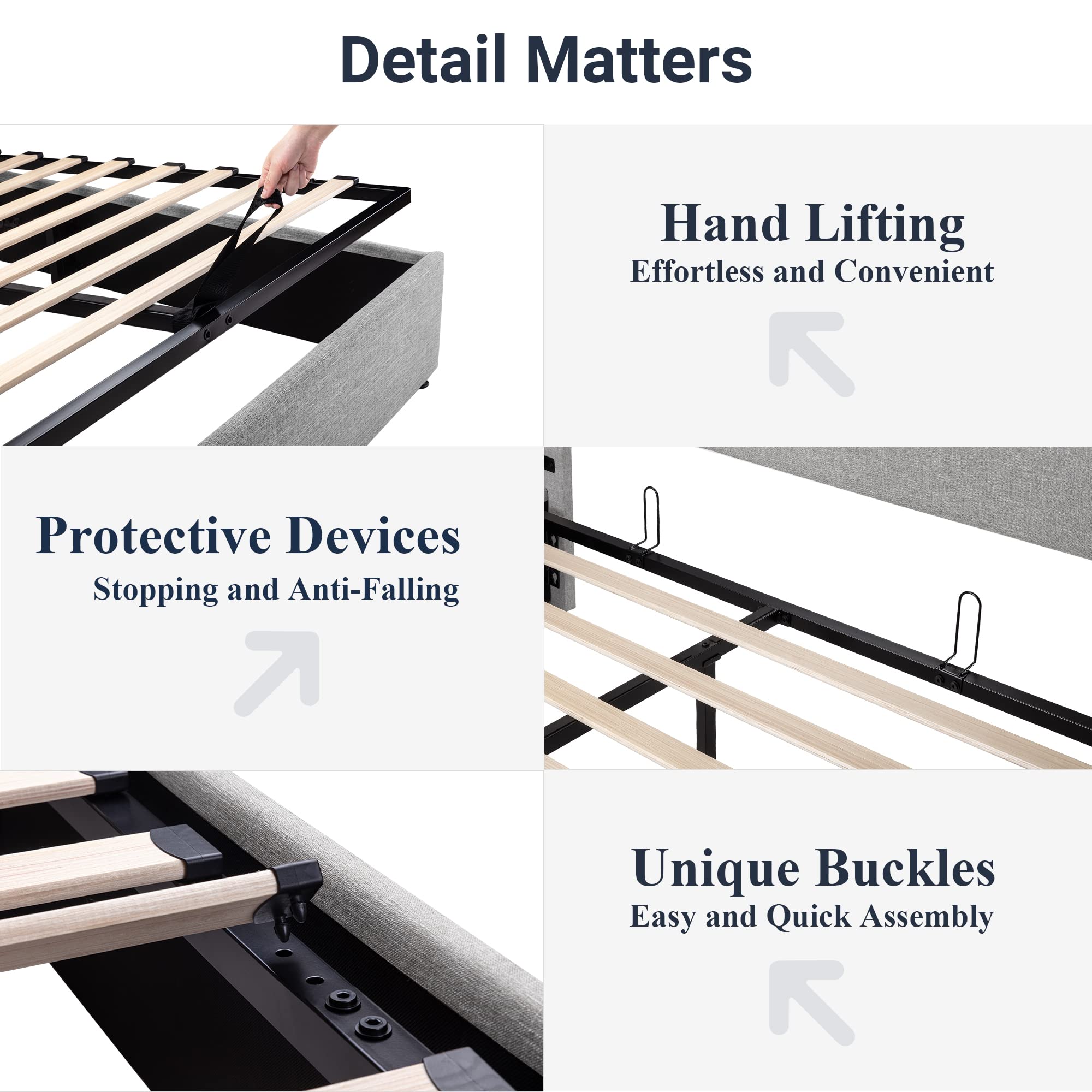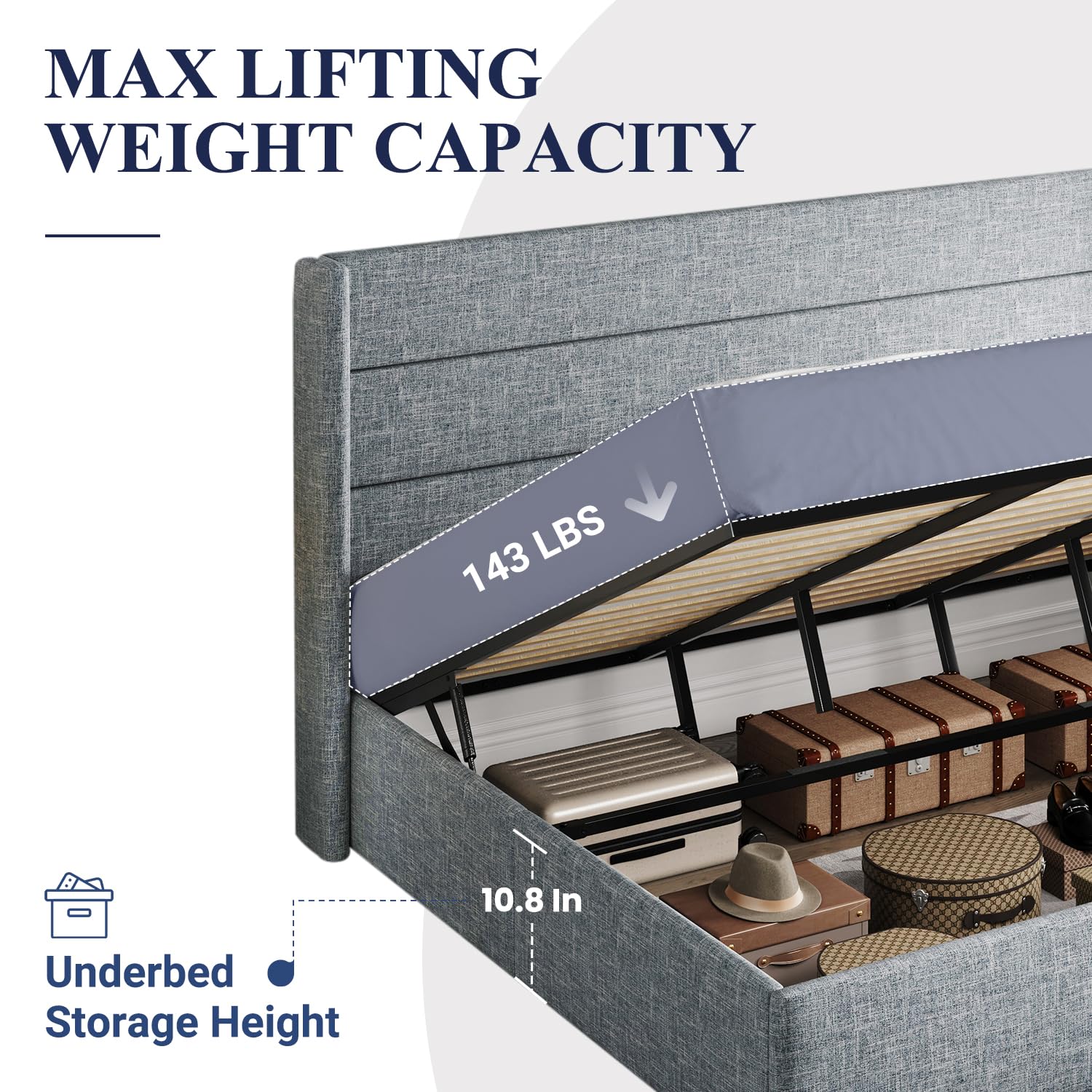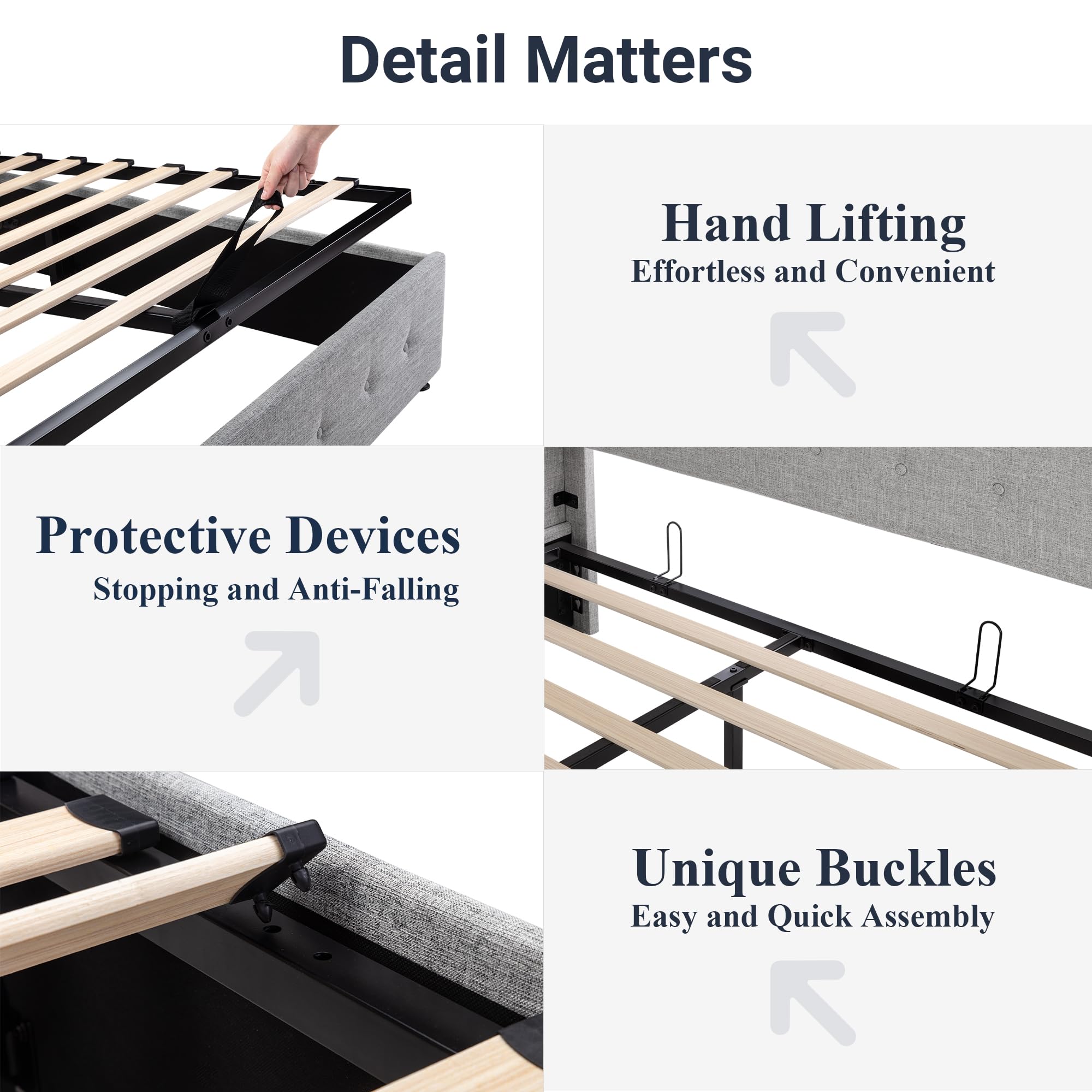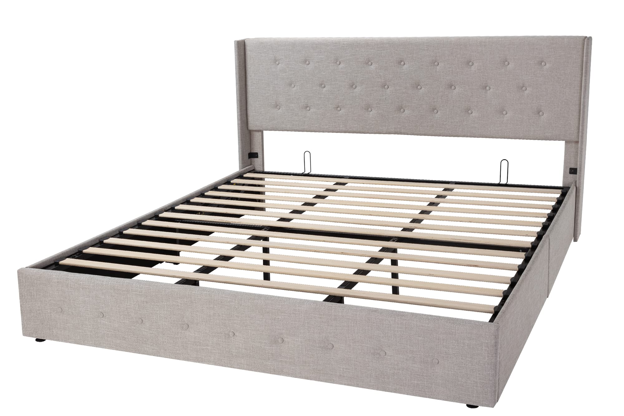 Space-Saving Storage: With its lifting up storage feature, this bed frame provides ample space to store extra bedding, clothing, shoes, and other items, especially helpful for smaller bedrooms or apartments where storage space is limited