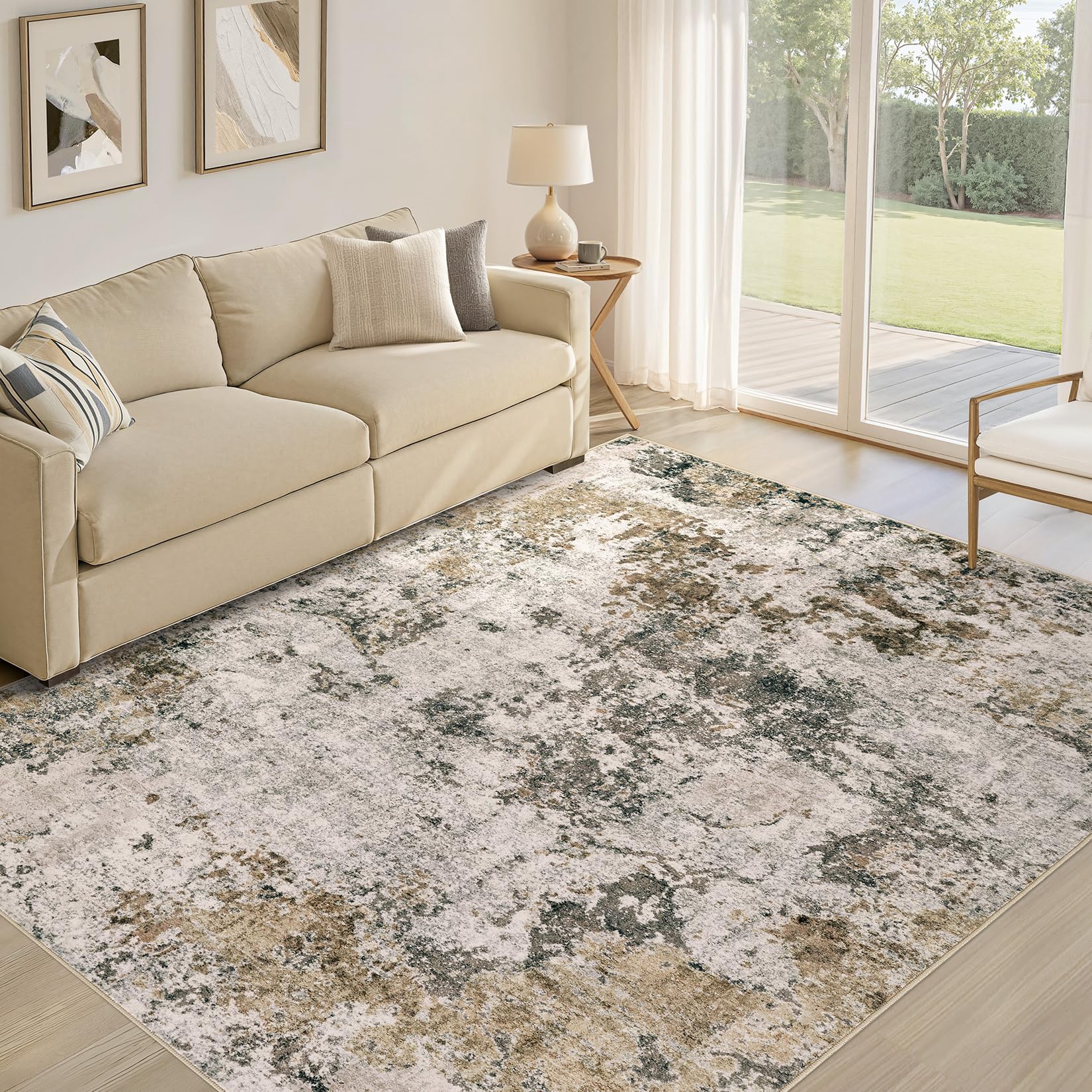 Area Rugs for Living Room: 12x15 Abstract Washable Rug Modern Neutral Large Soft Stain Resistant Non-Slip Backing Machine Table for Bedroom Dining Room Indoor Home Office Carpet - Gold Brown