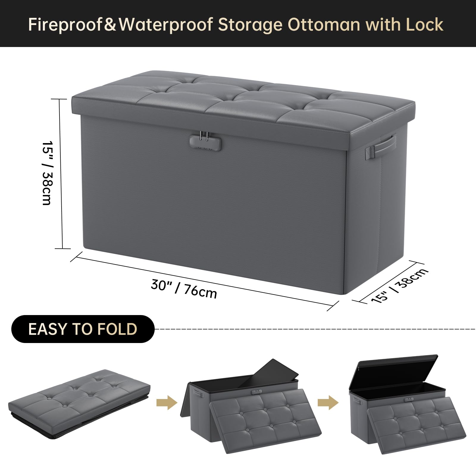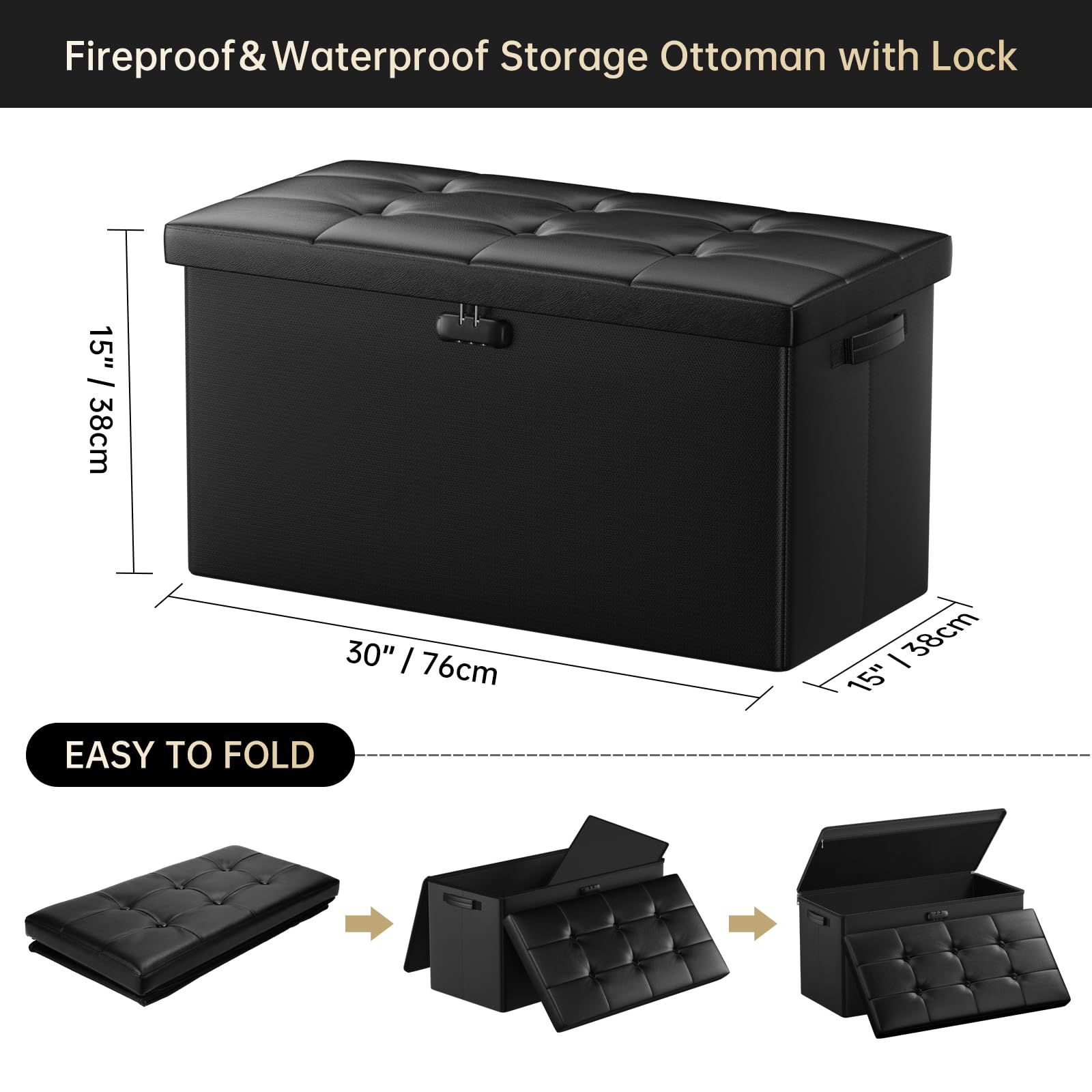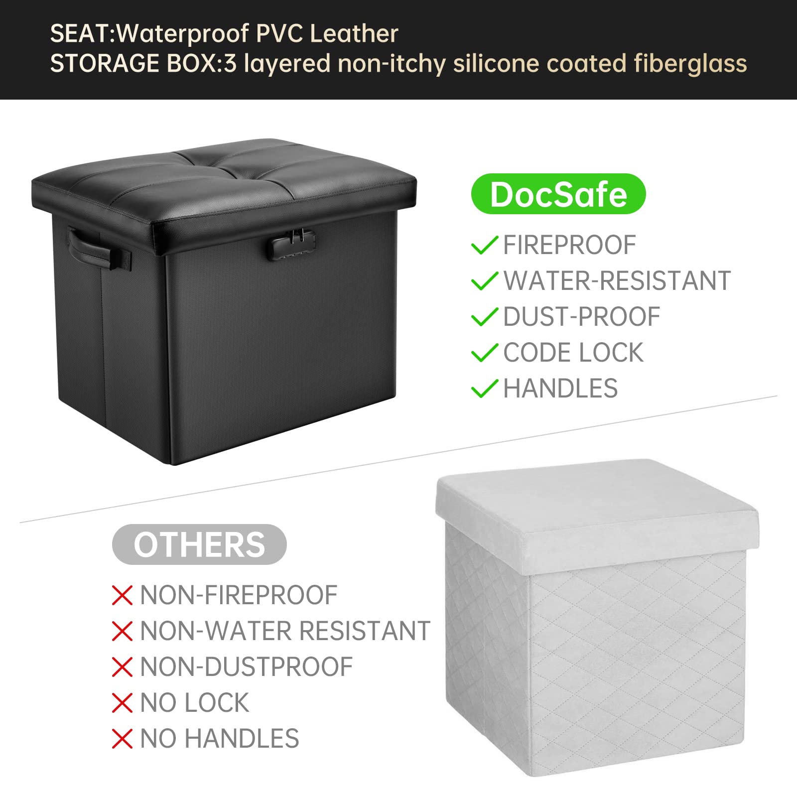 DocSafe Storage Ottoman with Lock,Fireproof Folding Ottoman Foot Rest Stool Storage Chest with Storage Safe for Important Documents,Waterproof 17 Inches Short Ottoman Foot Stool with Handles,Black