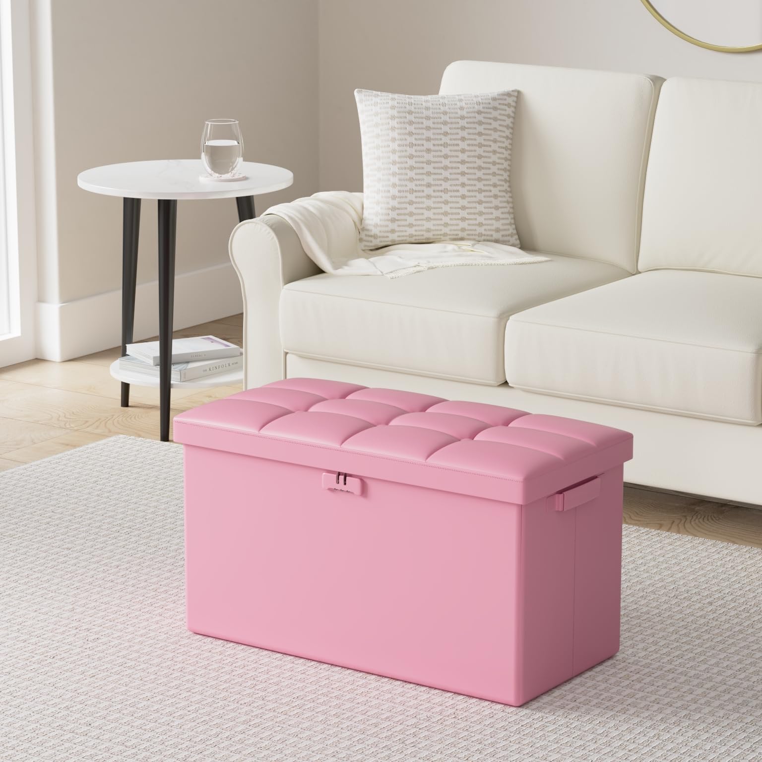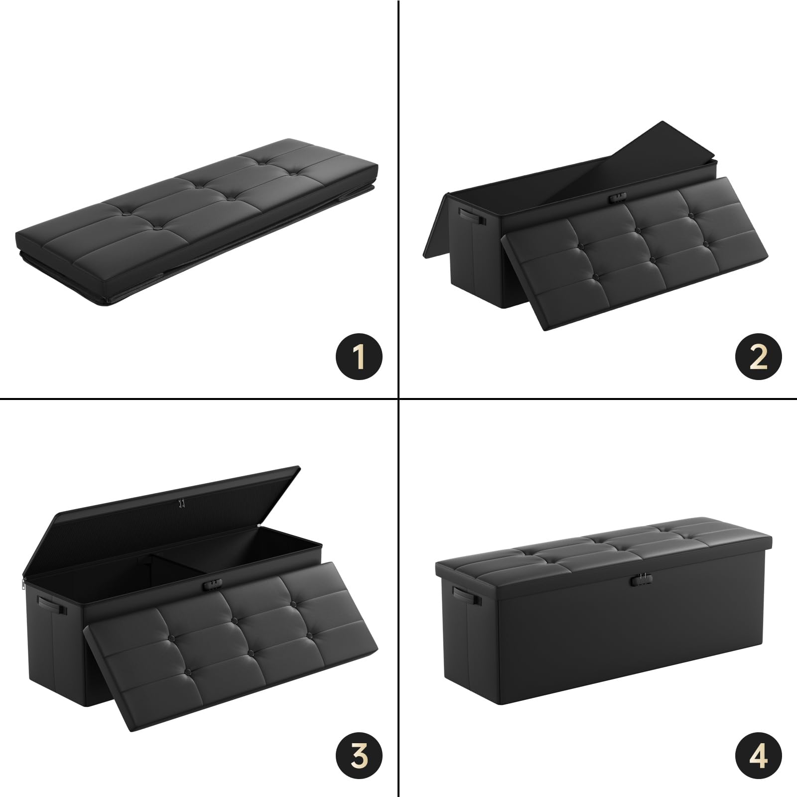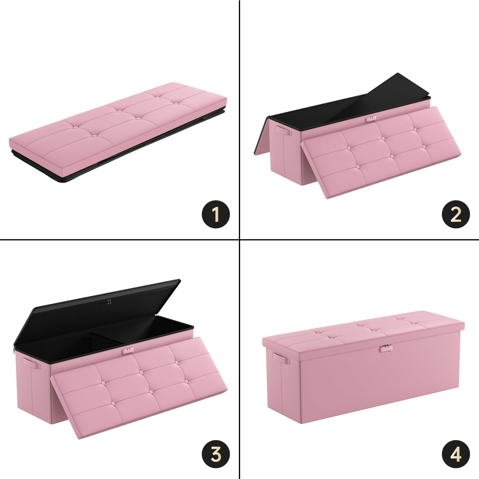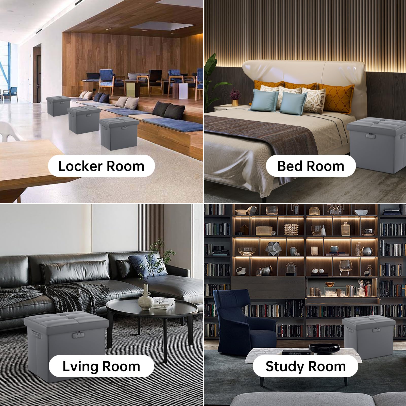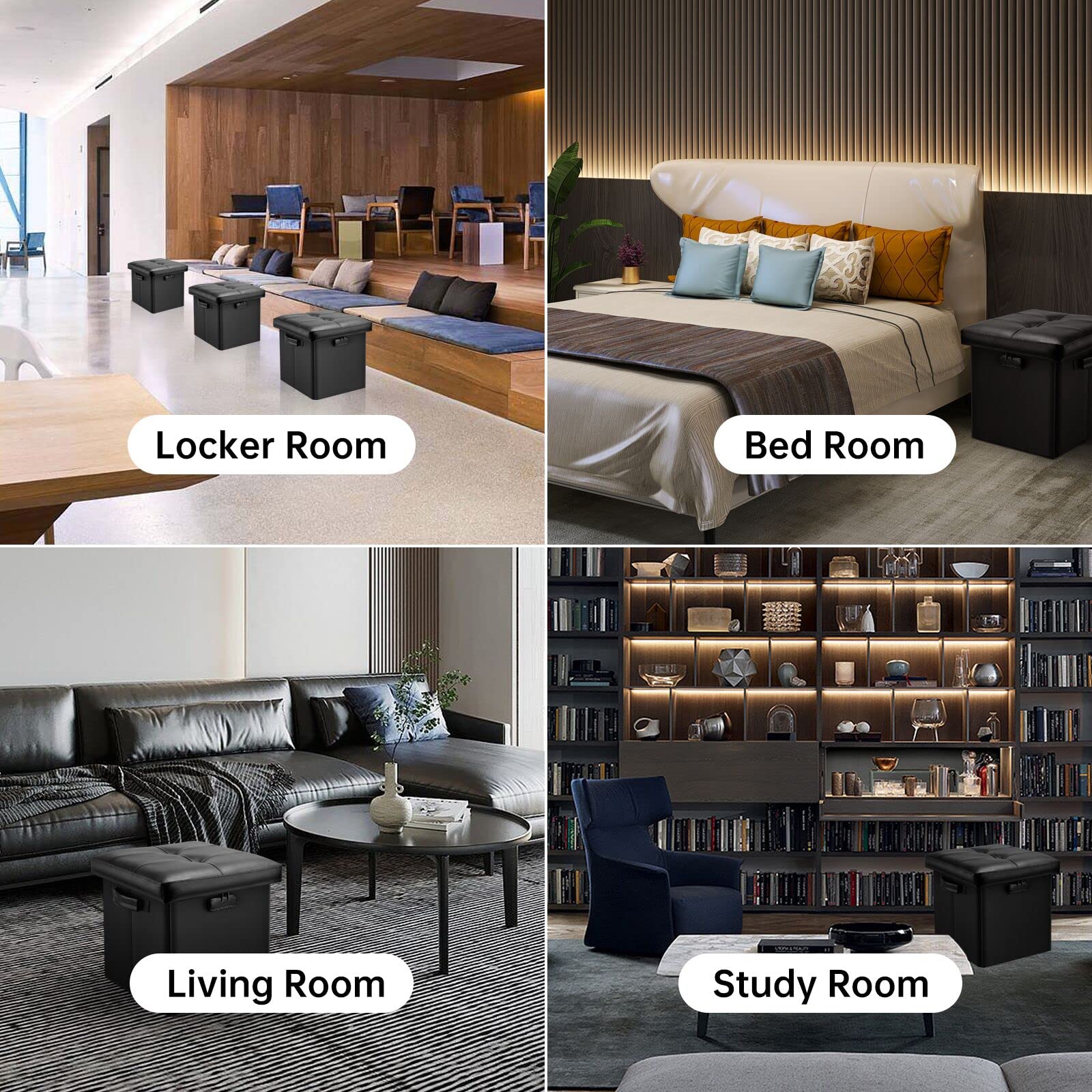 • Leather and dust-proof material: Compared with other storage ottoman, The seat part of our stool is made of waterproof PVC leather. It is worth mentioning that our storage ottoman can hold up to 440 lbs. The sturdy fixing plates and the high quality fibreboard give it a better load-bearing capacity and will not warp, so you can sit or stand safely on the stool. And the dust-proof material we use prevents dust or hair from sticking to the outside of our stool, always keep it neat and tidy.
