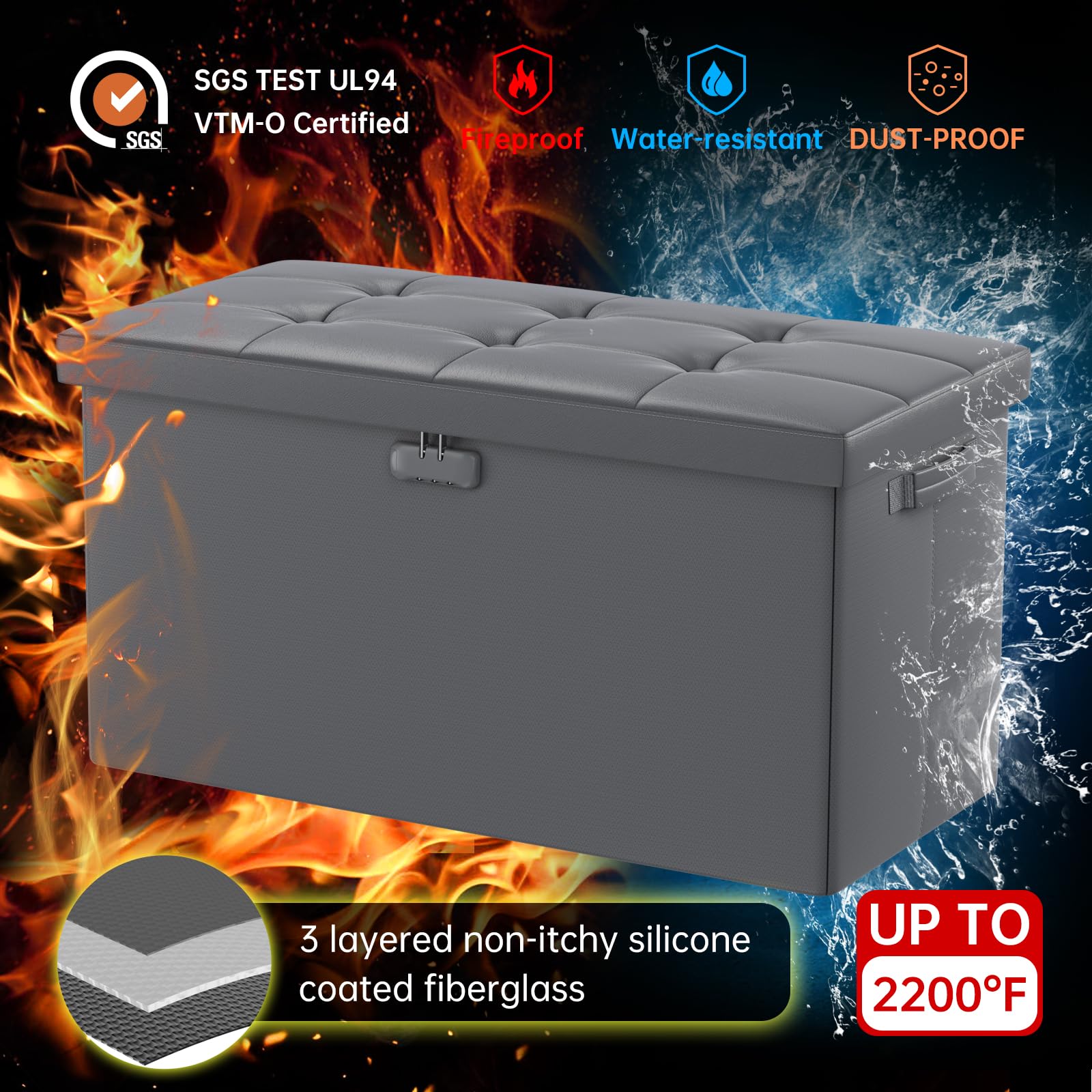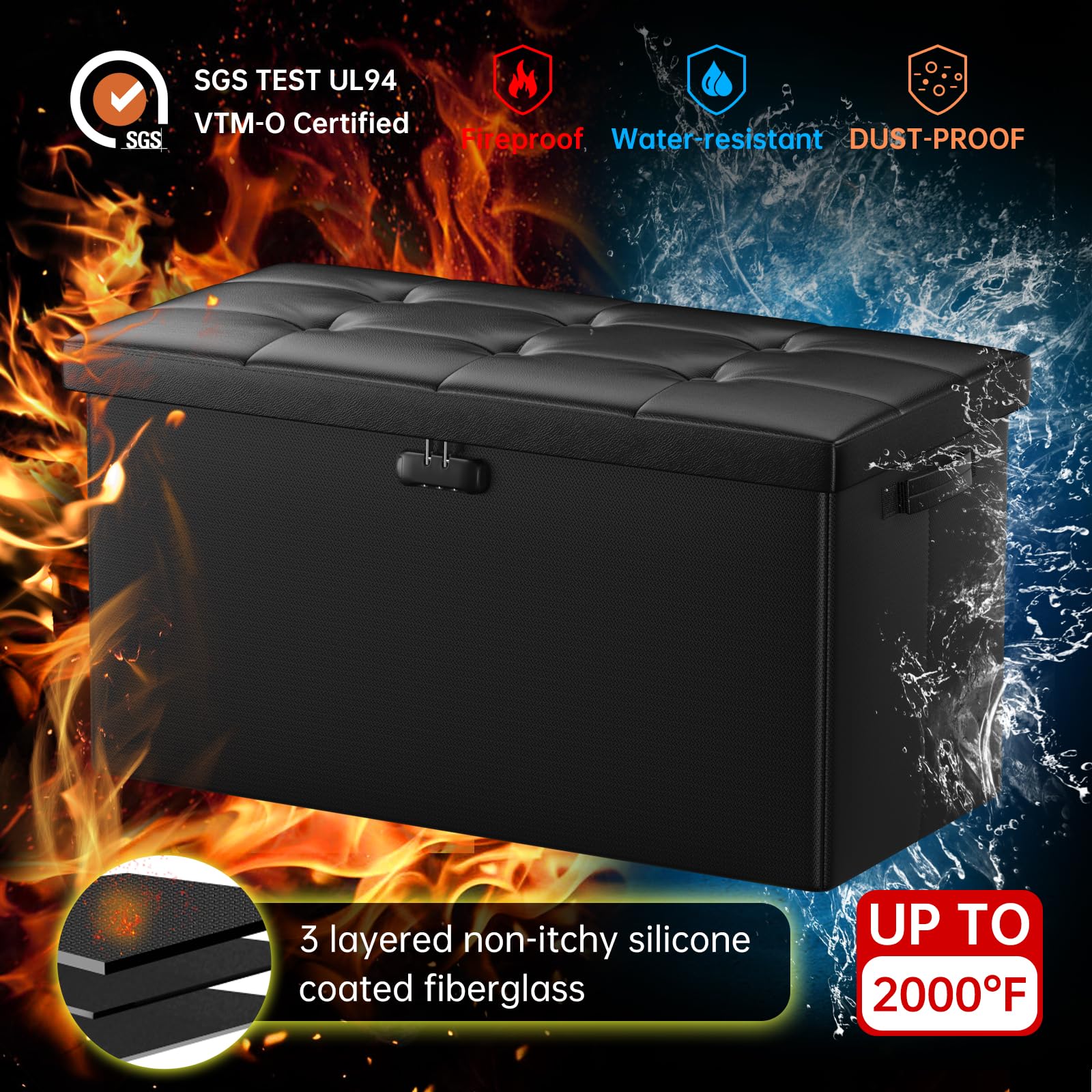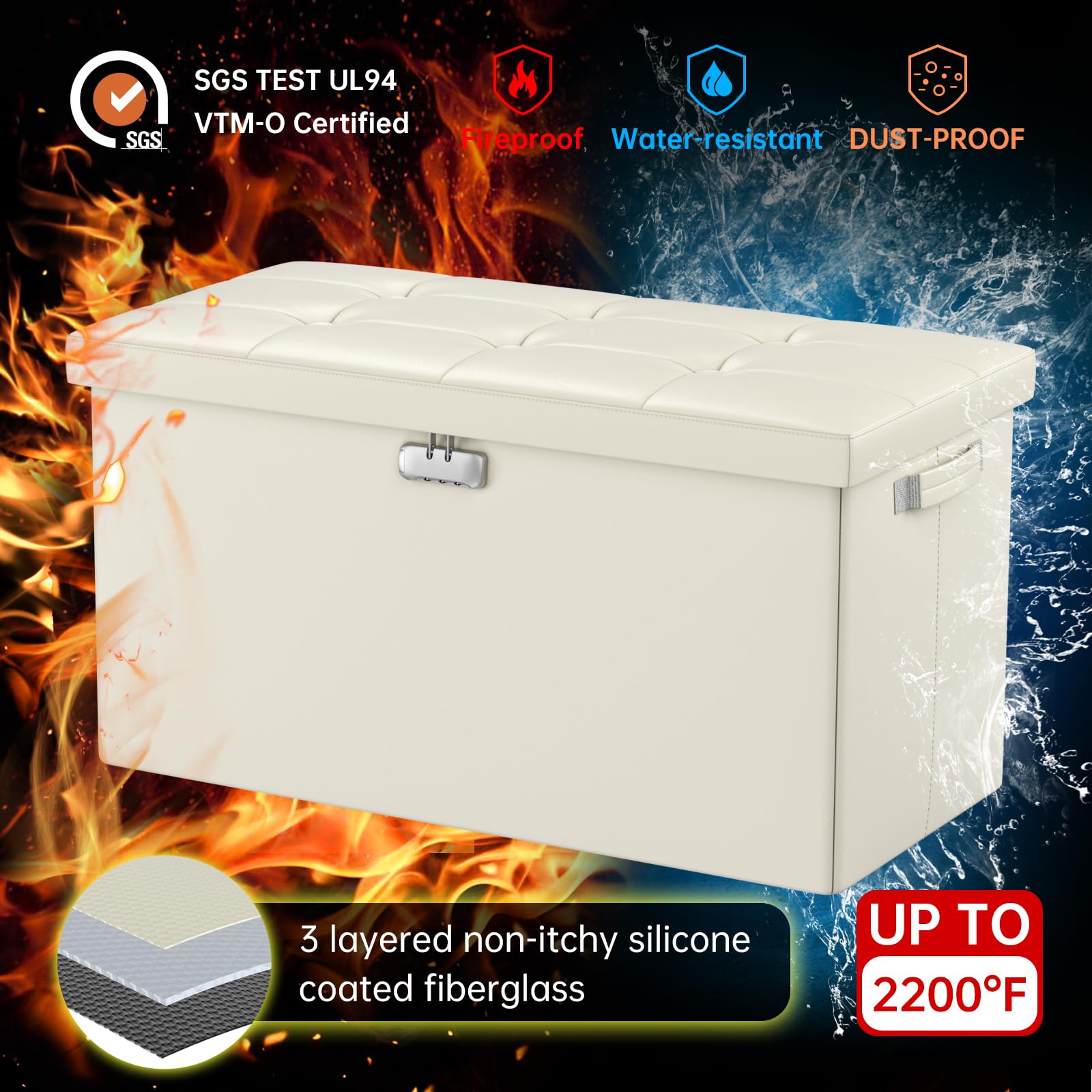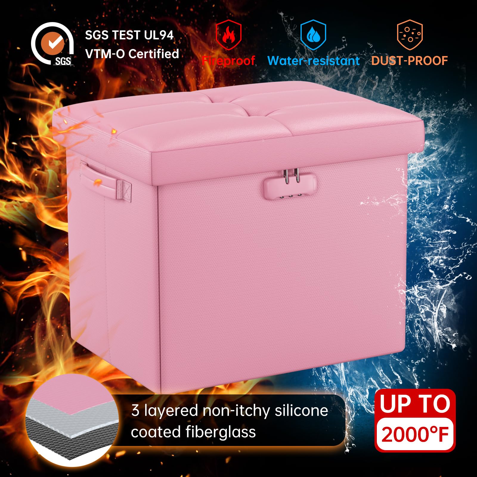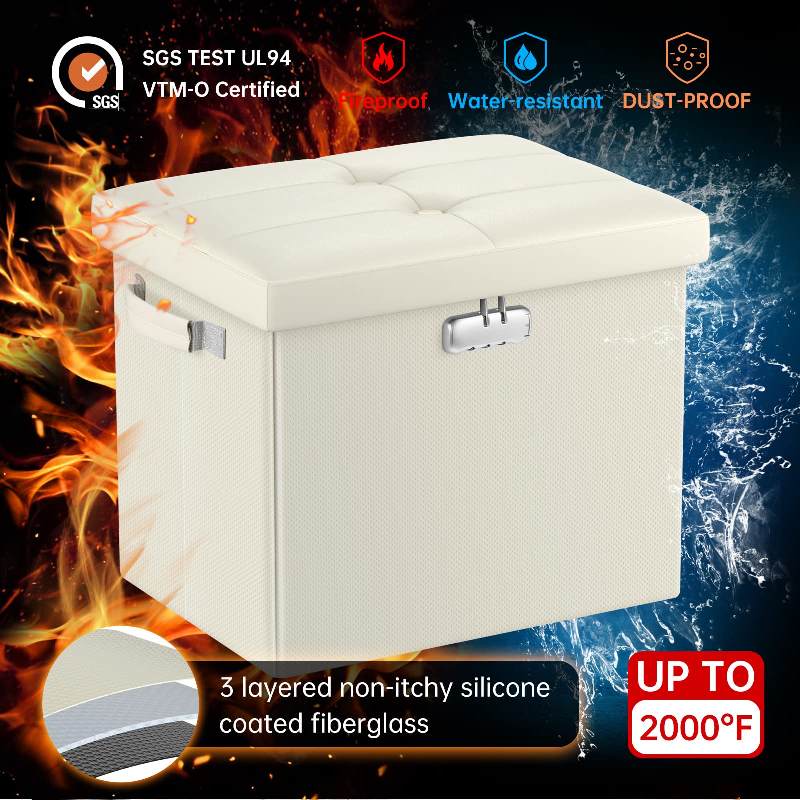 • Fireproof and Water-resistant(17"X13"X13"): Compared with other storage ottoman, our fireproof storage ottoman is made of 3 layered non-itchy silicone coated fiberglass which stands up the temperature up to 2000℉. The Storage Chest is fireproof and waterproof,which can effectively protect your important files in a fire and wet weather. They will further keep your files intact. It has been passed by SGS TEST(UL94 Certified) for a longer life and can be used with peace of mind.
