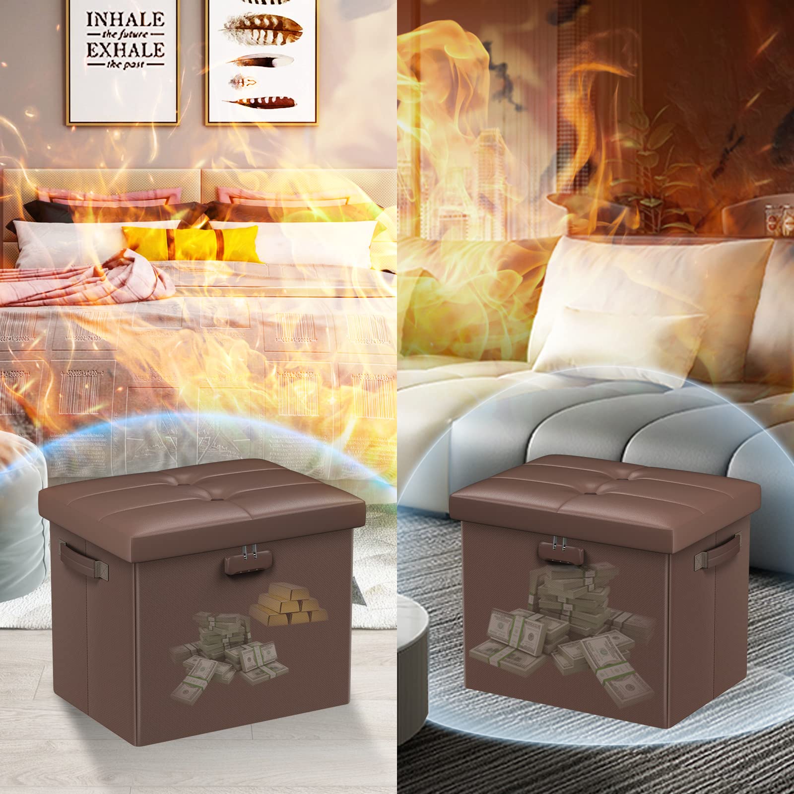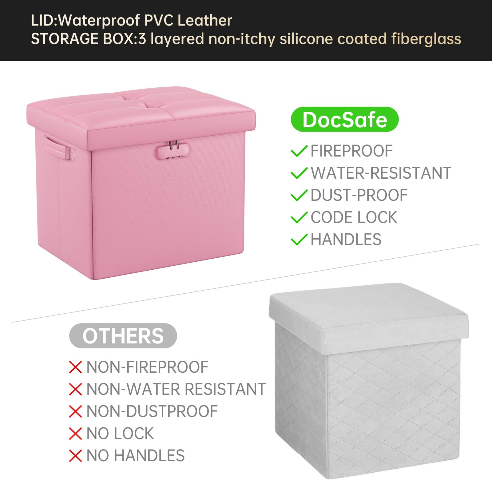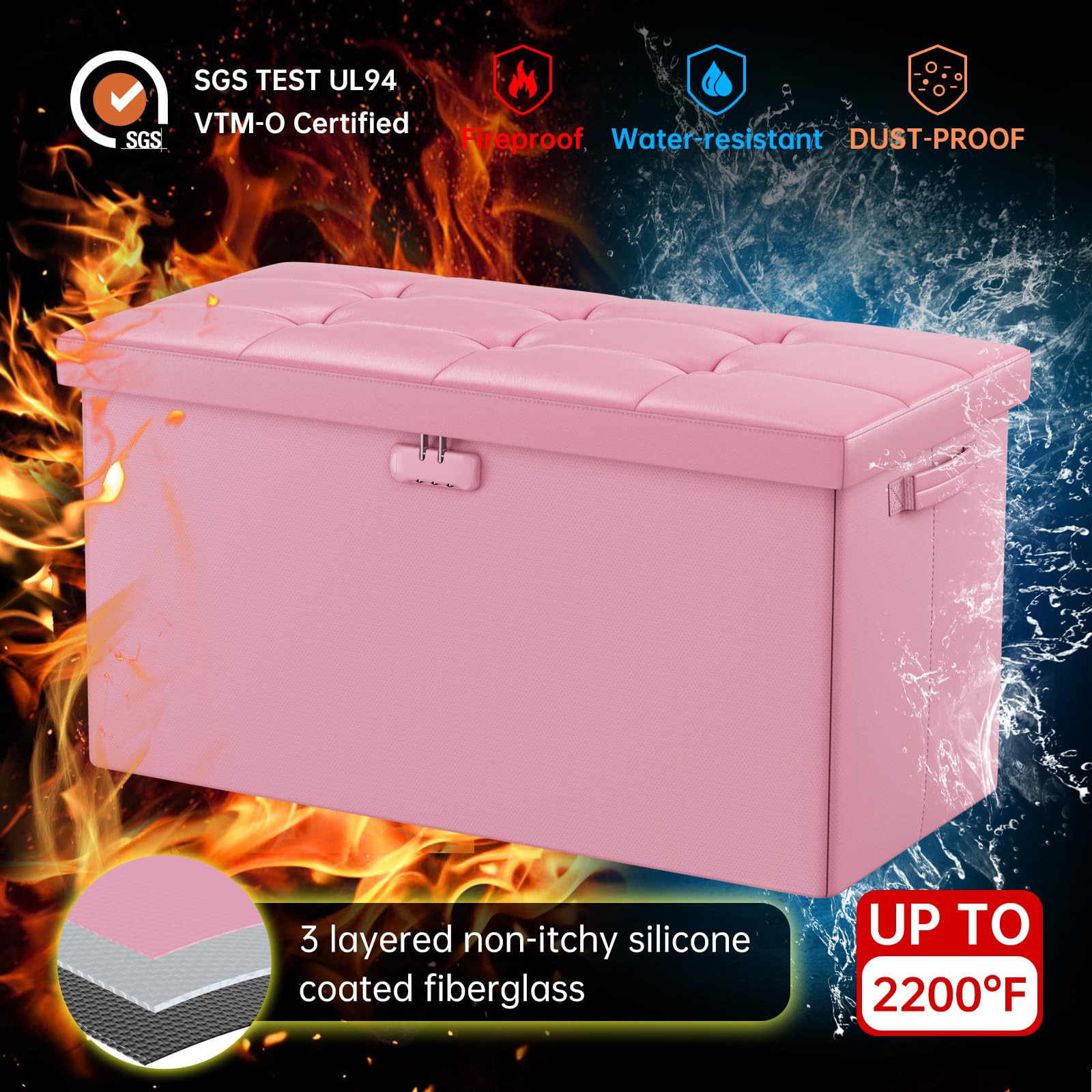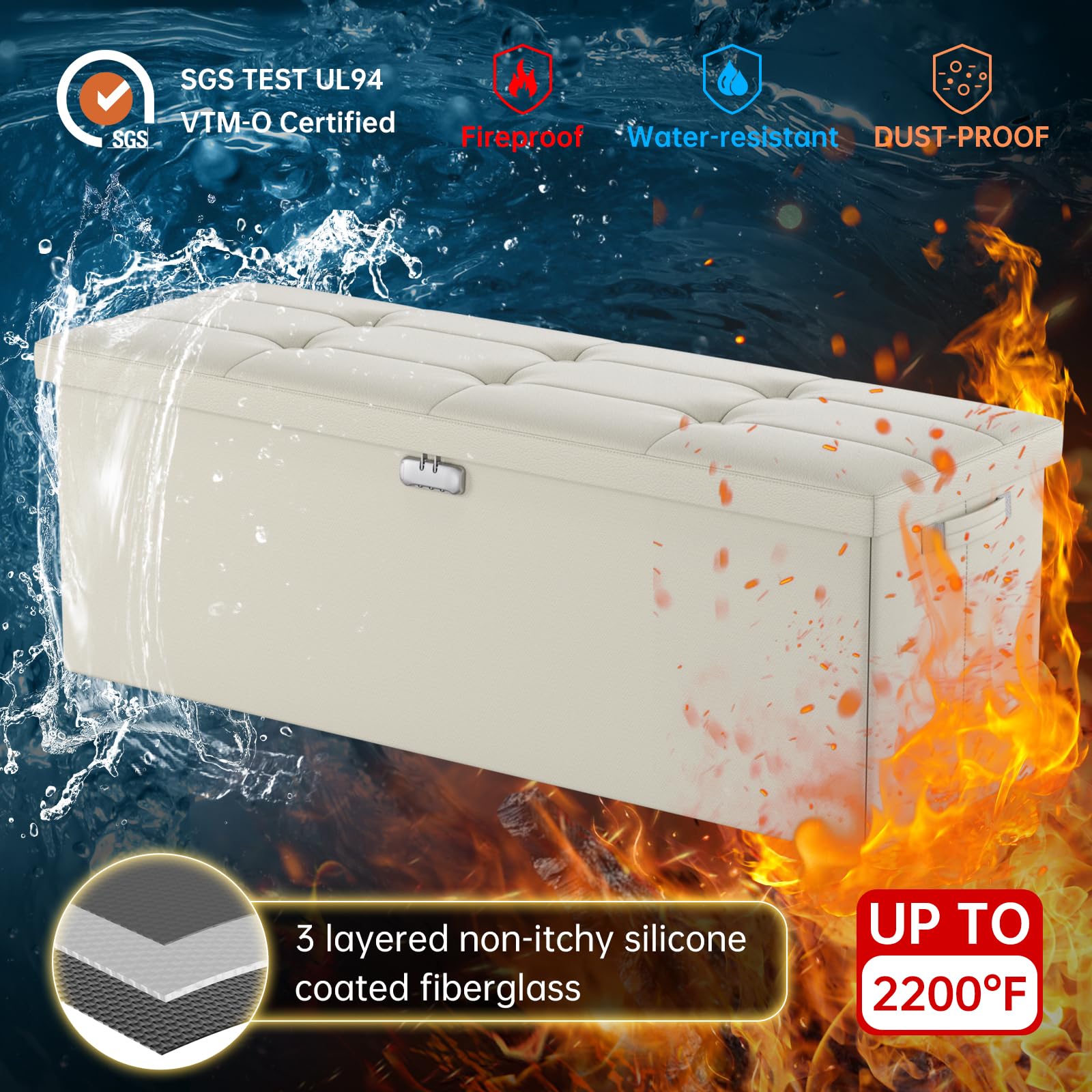 • Fireproof and Water-resistant(17"X13"X13"): Compared with other storage ottoman, our fireproof storage ottoman is made of 3 layered non-itchy silicone coated fiberglass which stands up the temperature up to 2000℉. The Storage Chest is fireproof and waterproof,which can effectively protect your important files in a fire and wet weather. They will further keep your files intact. It has been passed by SGS TEST(UL94 Certified) for a longer life and can be used with peace of mind.