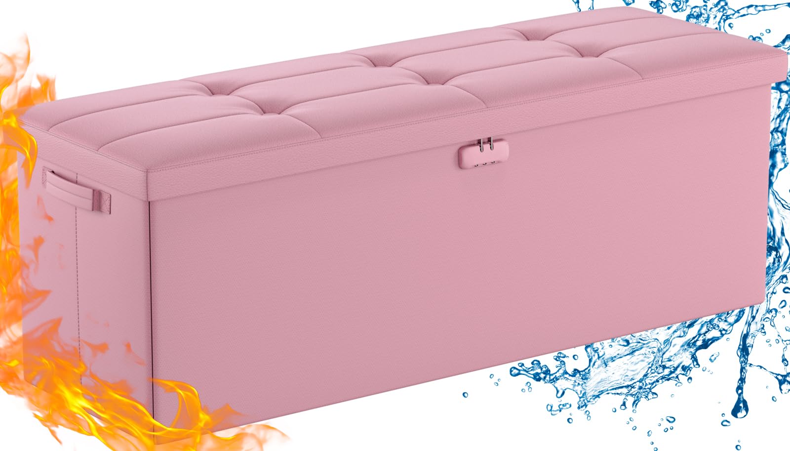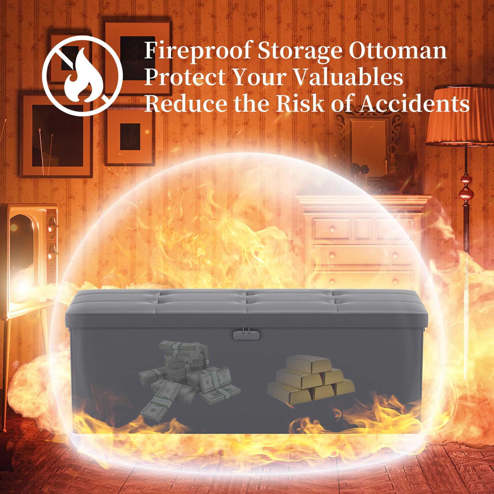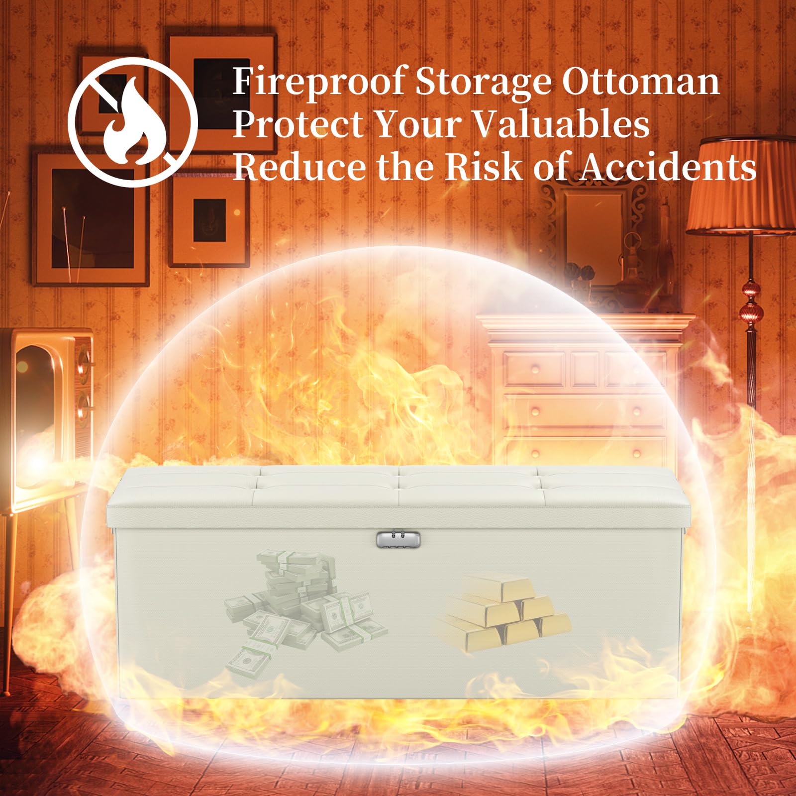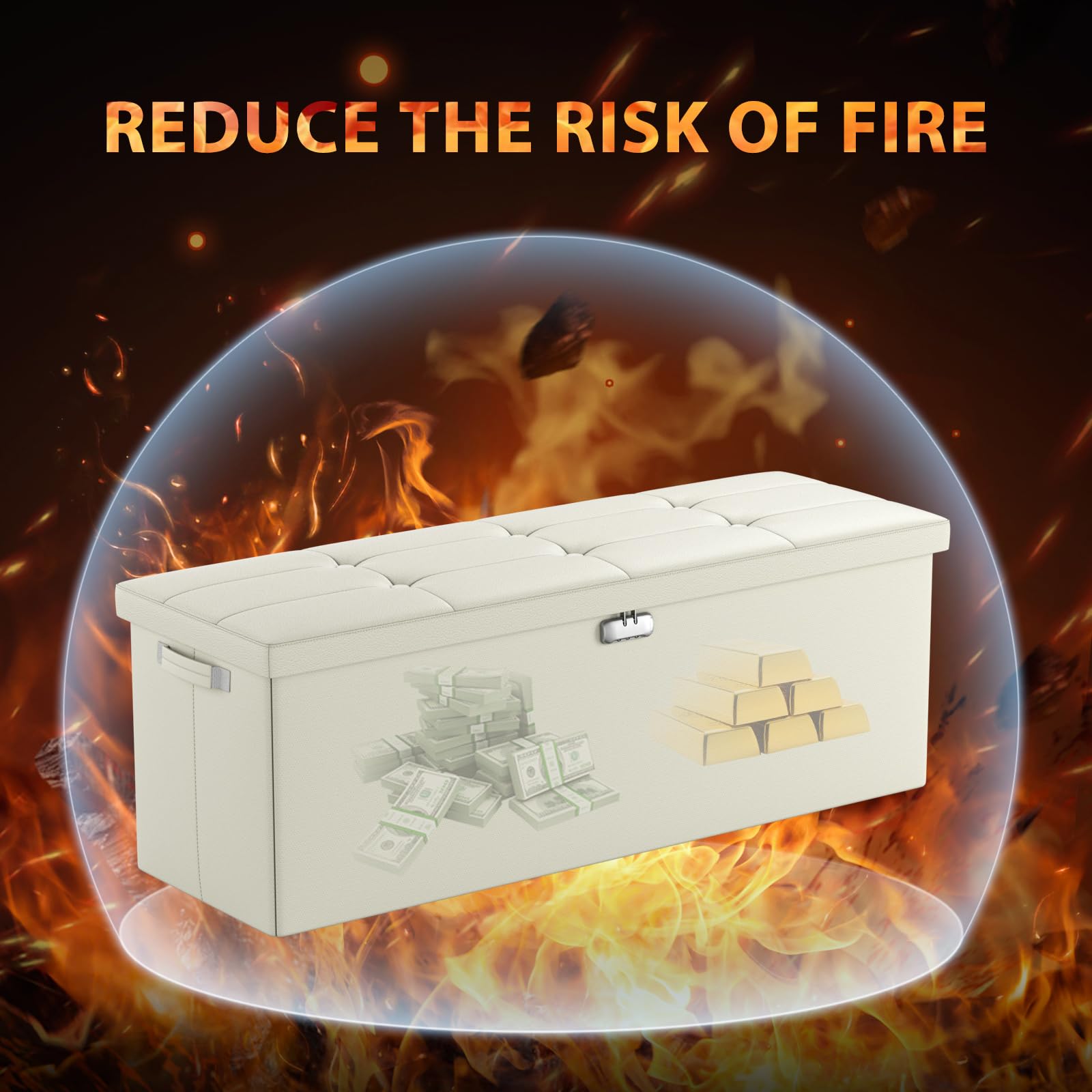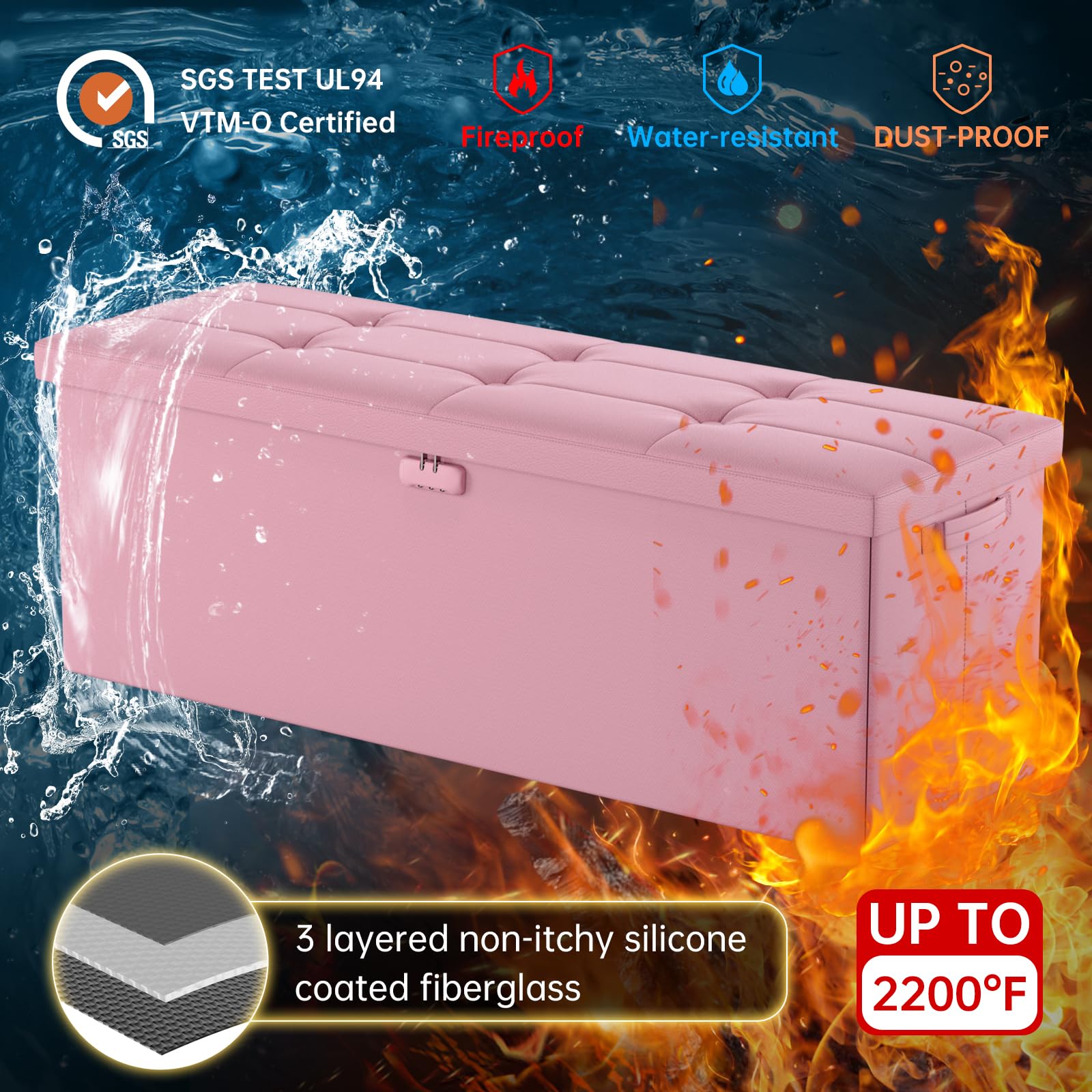 • Fireproof and Water-resistant(17"X13"X13"): Compared with other storage ottoman, our fireproof storage ottoman is made of 3 layered non-itchy silicone coated fiberglass which stands up the temperature up to 2000℉. The Storage Chest is fireproof and waterproof,which can effectively protect your important files in a fire and wet weather. They will further keep your files intact. It has been passed by SGS TEST(UL94 Certified) for a longer life and can be used with peace of mind.