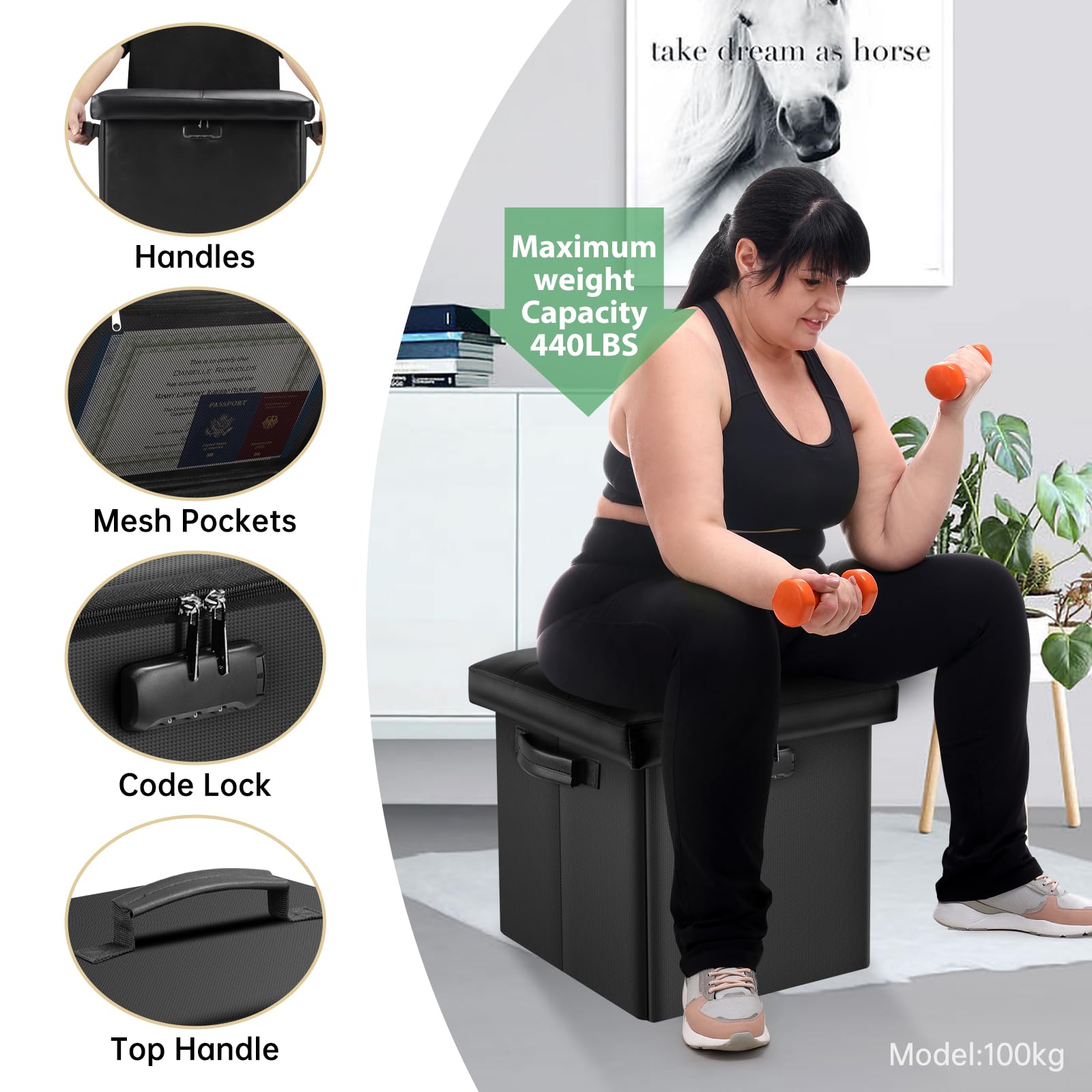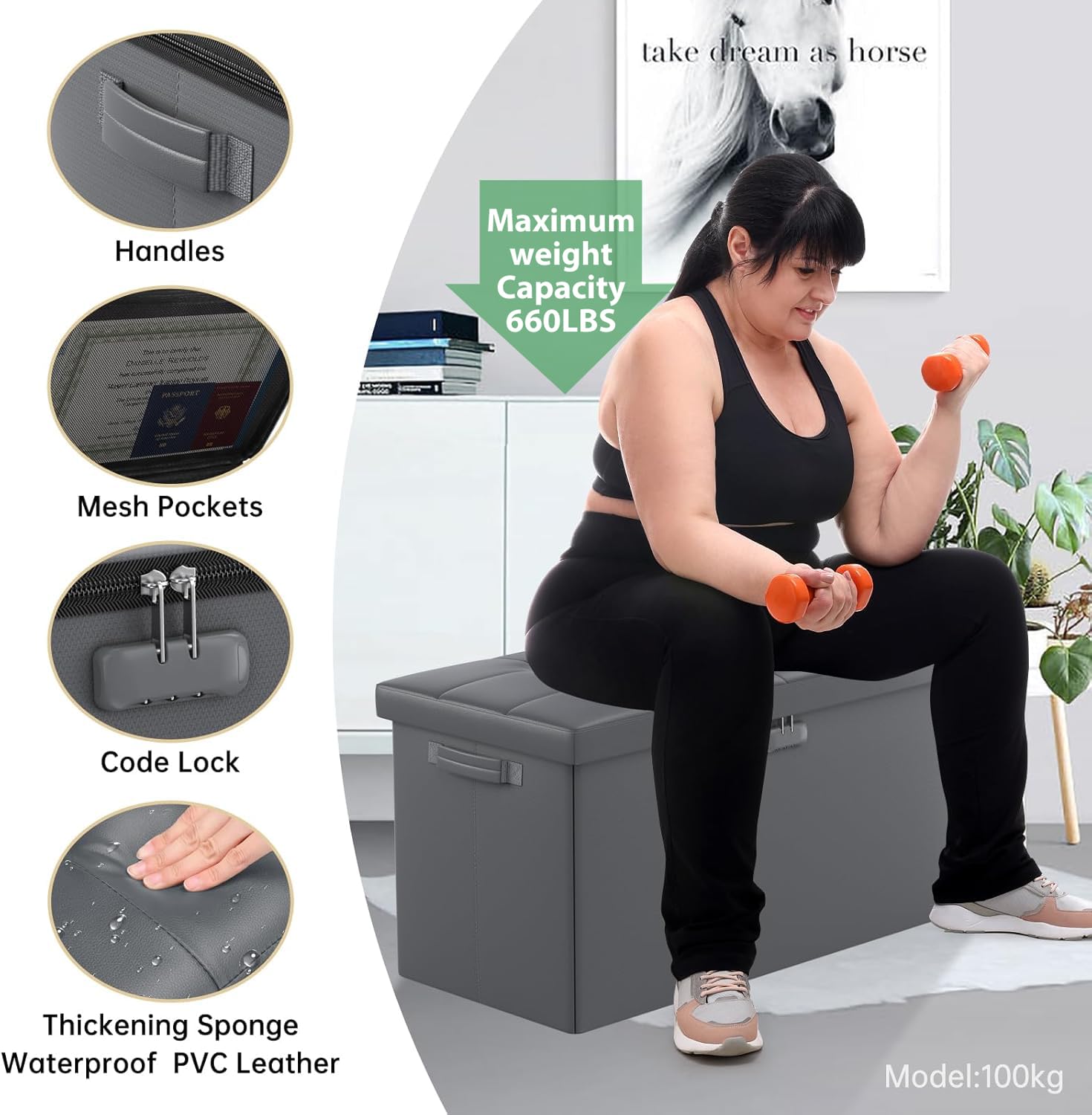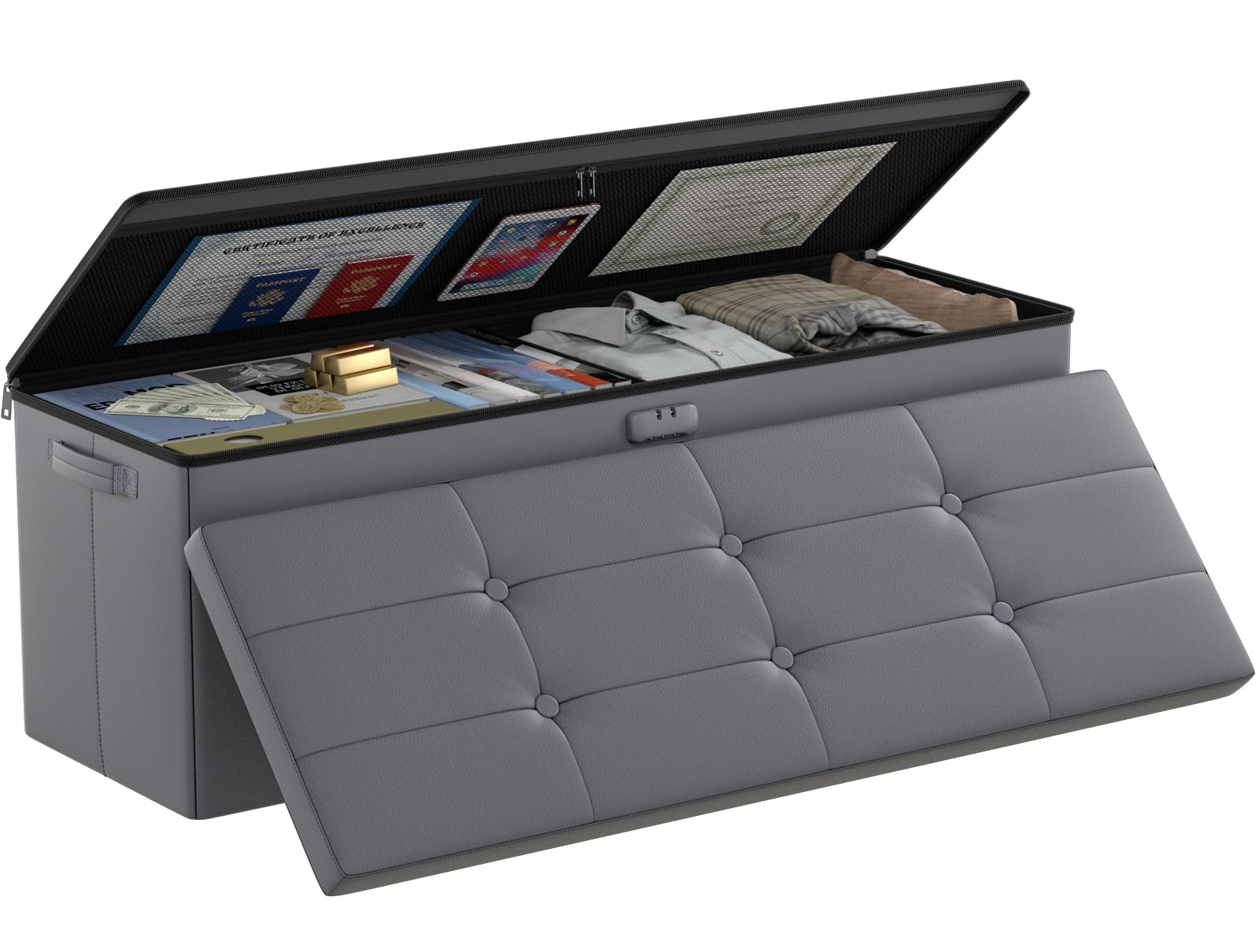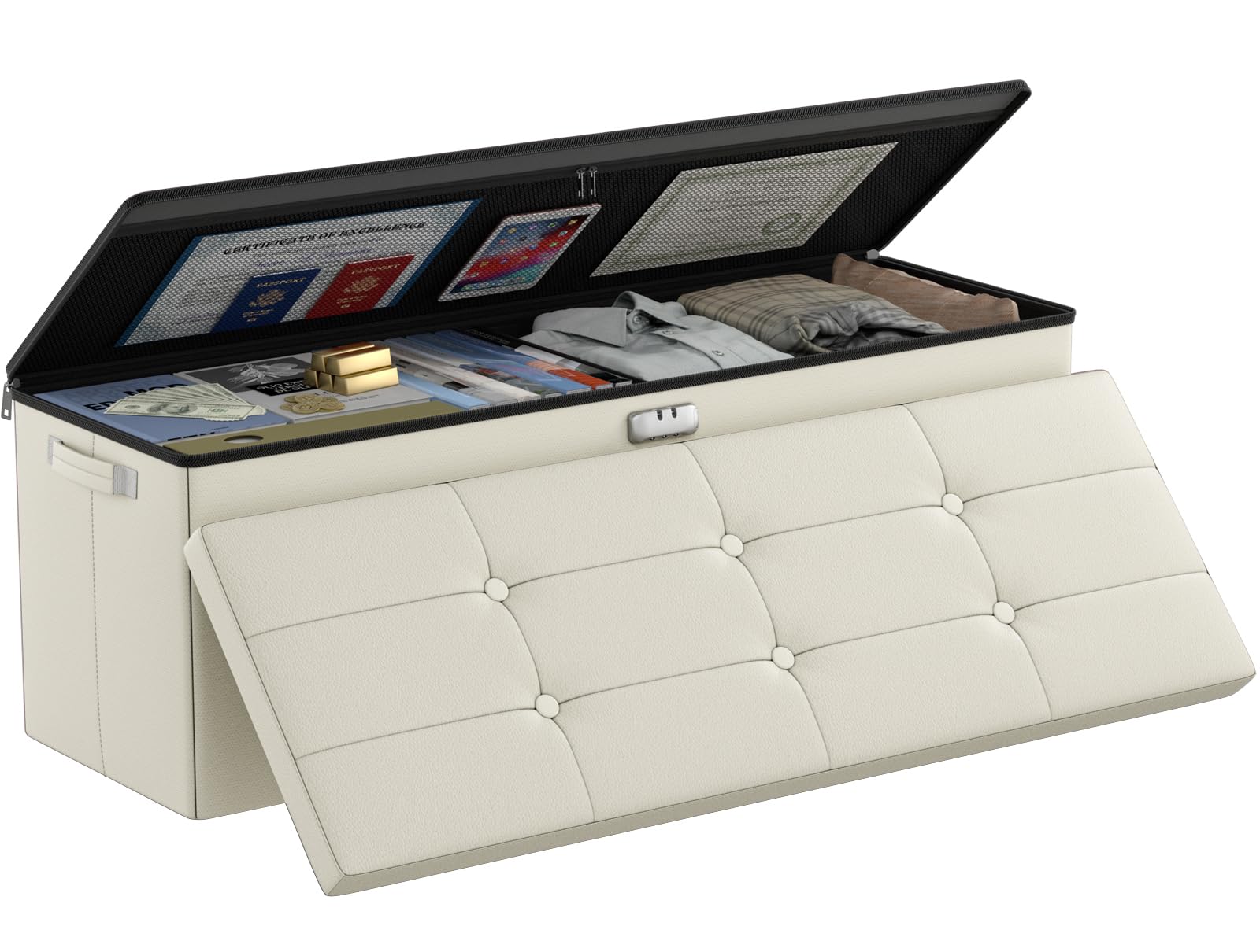 • 47L Hidden Storage Space: Reduce the clutter in your home by storing electronic product,blankets,books or even for storing some valuable files,cash,Certificates. It's fun to keep valuables in a conspicuous bench with hidden space(mesh pocket on the lid for storing files).Fireproof storage ottoman can be used as a safe stroage box,coffee table,small seat,chair stool,bed footstool,climbing tool,perfect for study, bedroom, living room, student dormitory, RV,leg rest,living room storage, field