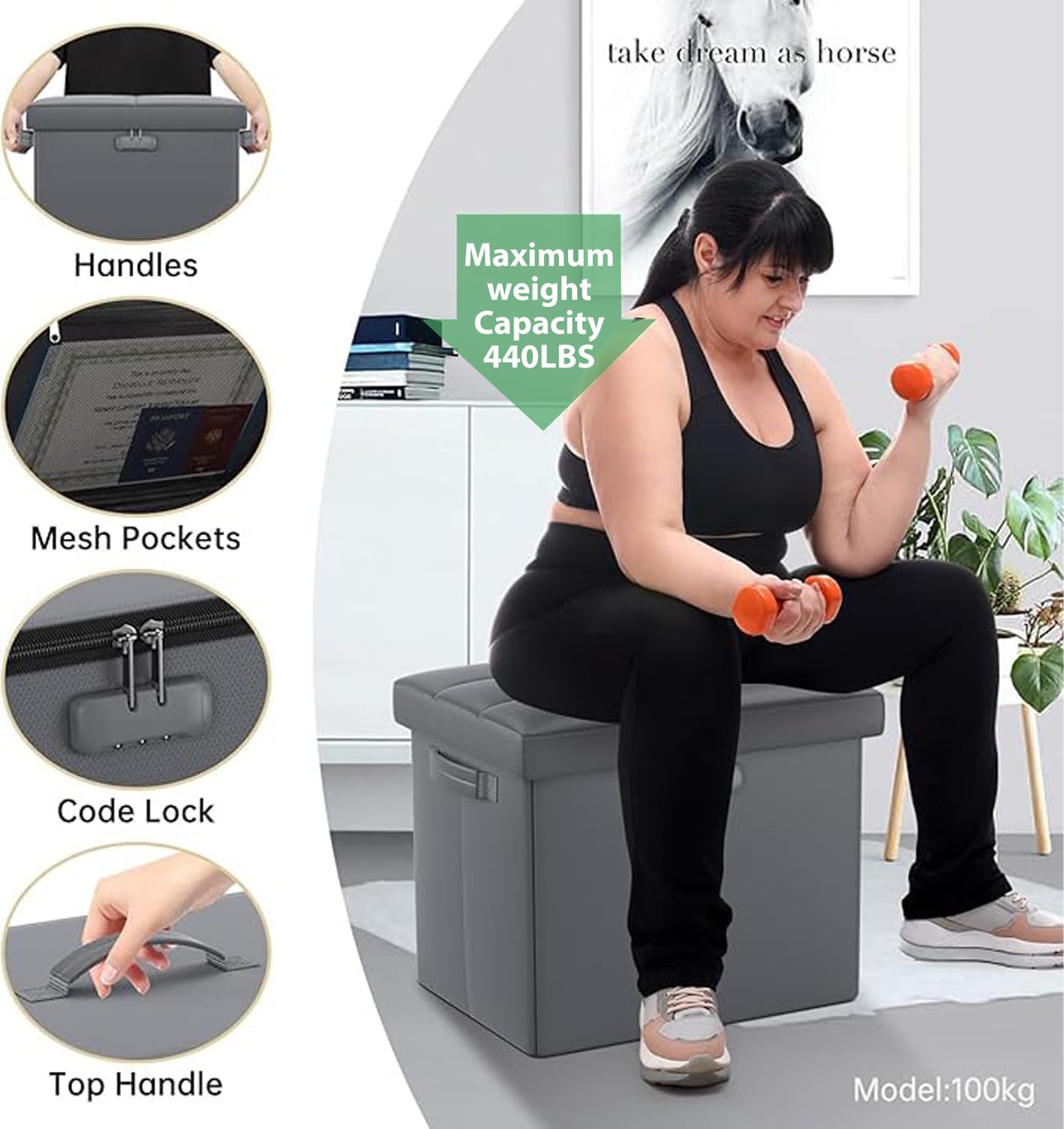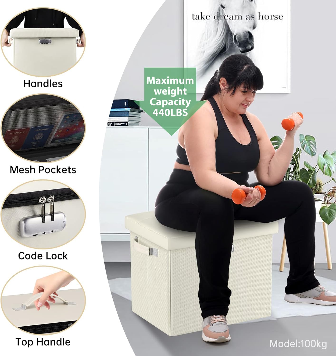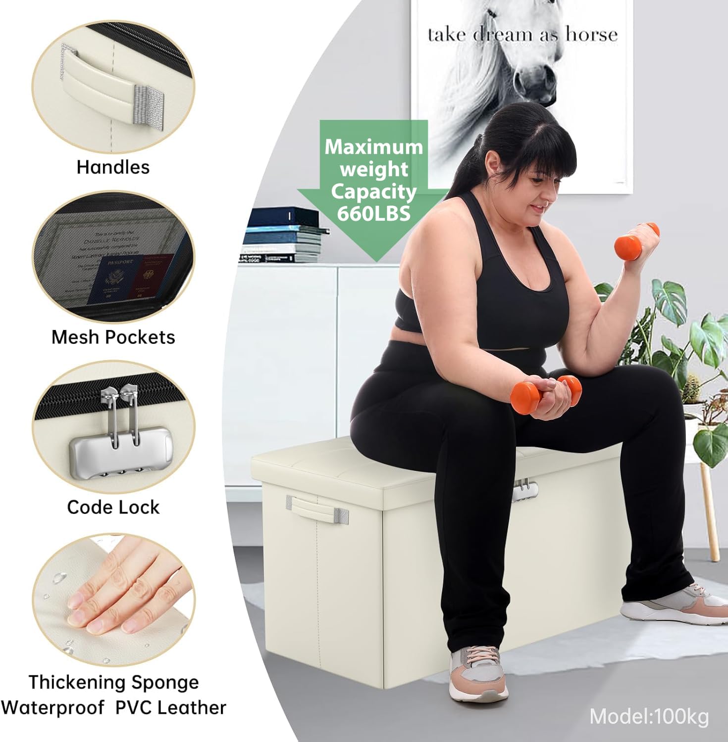 • 47L Hidden Storage Space: Reduce the clutter in your home by storing electronic product,blankets,books or even for storing some valuable files,cash,Certificates. It's fun to keep valuables in a conspicuous bench with hidden space(mesh pocket on the lid for storing files).Fireproof storage ottoman can be used as a safe stroage box,coffee table,small seat,chair stool,bed footstool,climbing tool,perfect for study, bedroom, living room, student dormitory, RV,leg rest,living room storage, field