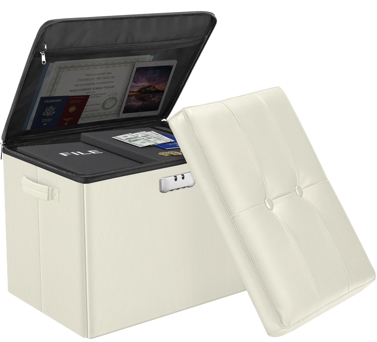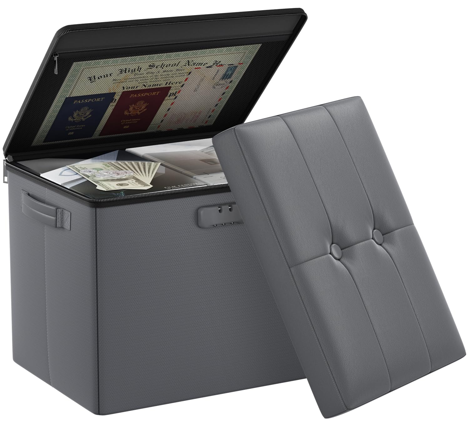 • Multipurpose Stool: Our fireproof ottoman stool is equipped with sturdy handles to make it easier to move even when it is fully loaded. High quality combination lock design for added storage security. We have also added a zip and cover to the top to make this stool's hidden storage space more private. It can be both a stool and a safe fireproof storage box, which is how we designed this product in the first place. Nothing is completely foolproof, but added protection is always a good idea.