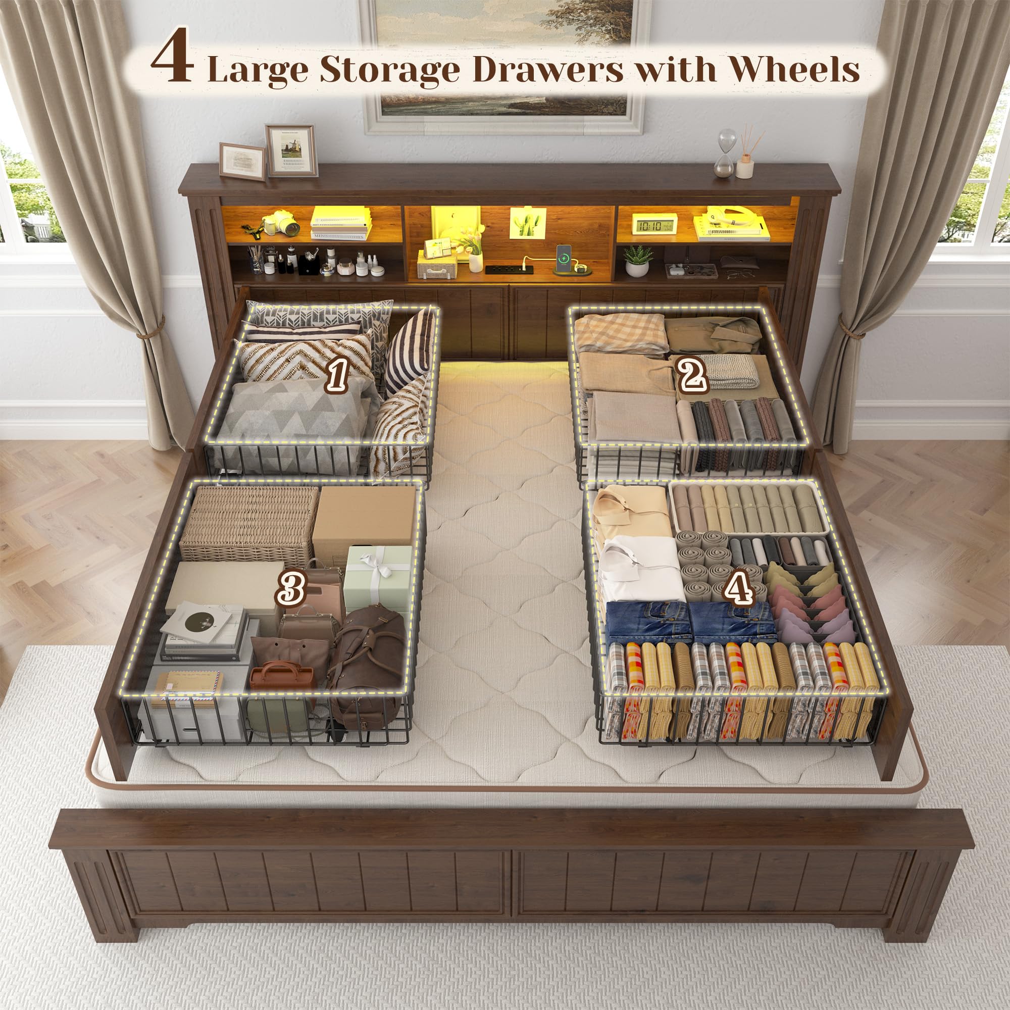 EnHomee King Size Bed Frame and Headboard & Storage, 4 Drawers and LED Built in Charging Station King Bed Frame with Storage Farmhouse,NO Noise,No Box Spring Needed,White