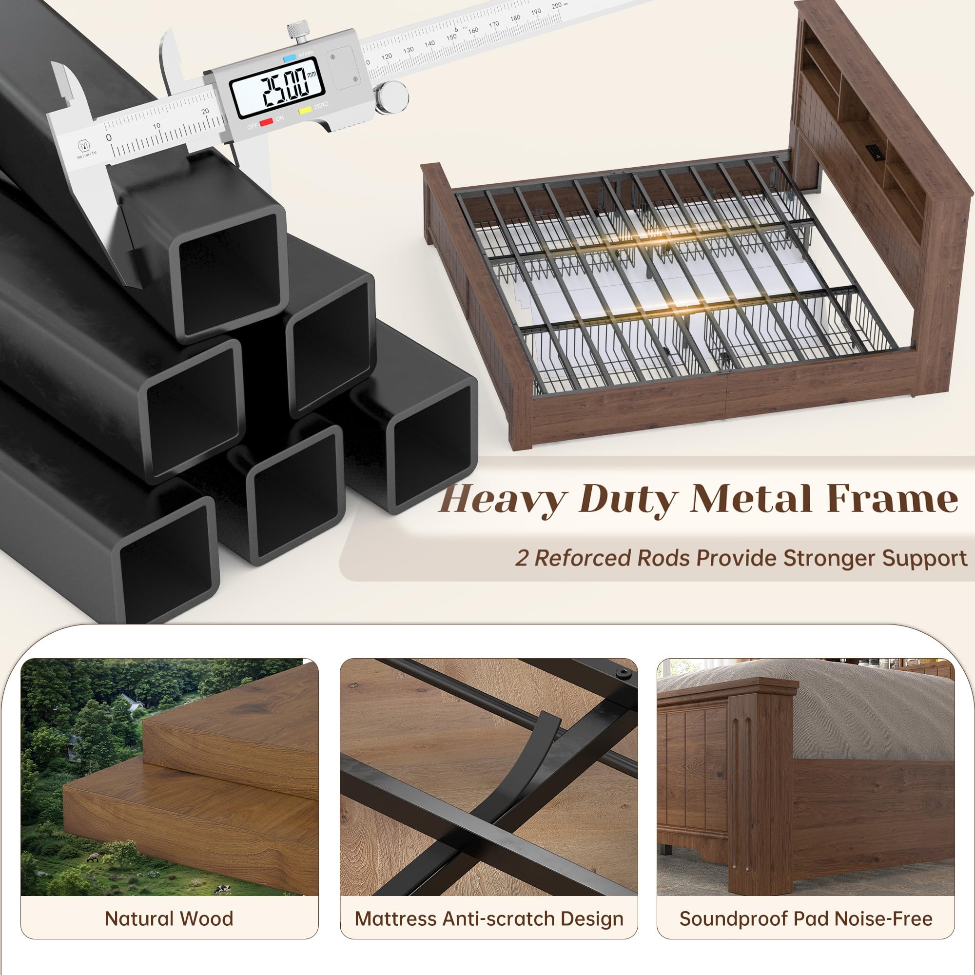 【Smart LED & Charging Station】This King bed frame with headboard comes with an RGB LED light strip. Use the included remote control or mobile app to adjust the color, brightness and mode.The platform bed frame King size also comes with 2 standard plug outlets, so you can easily charge electronic devices right from the bed. Making home life more vibrant and convenient.
