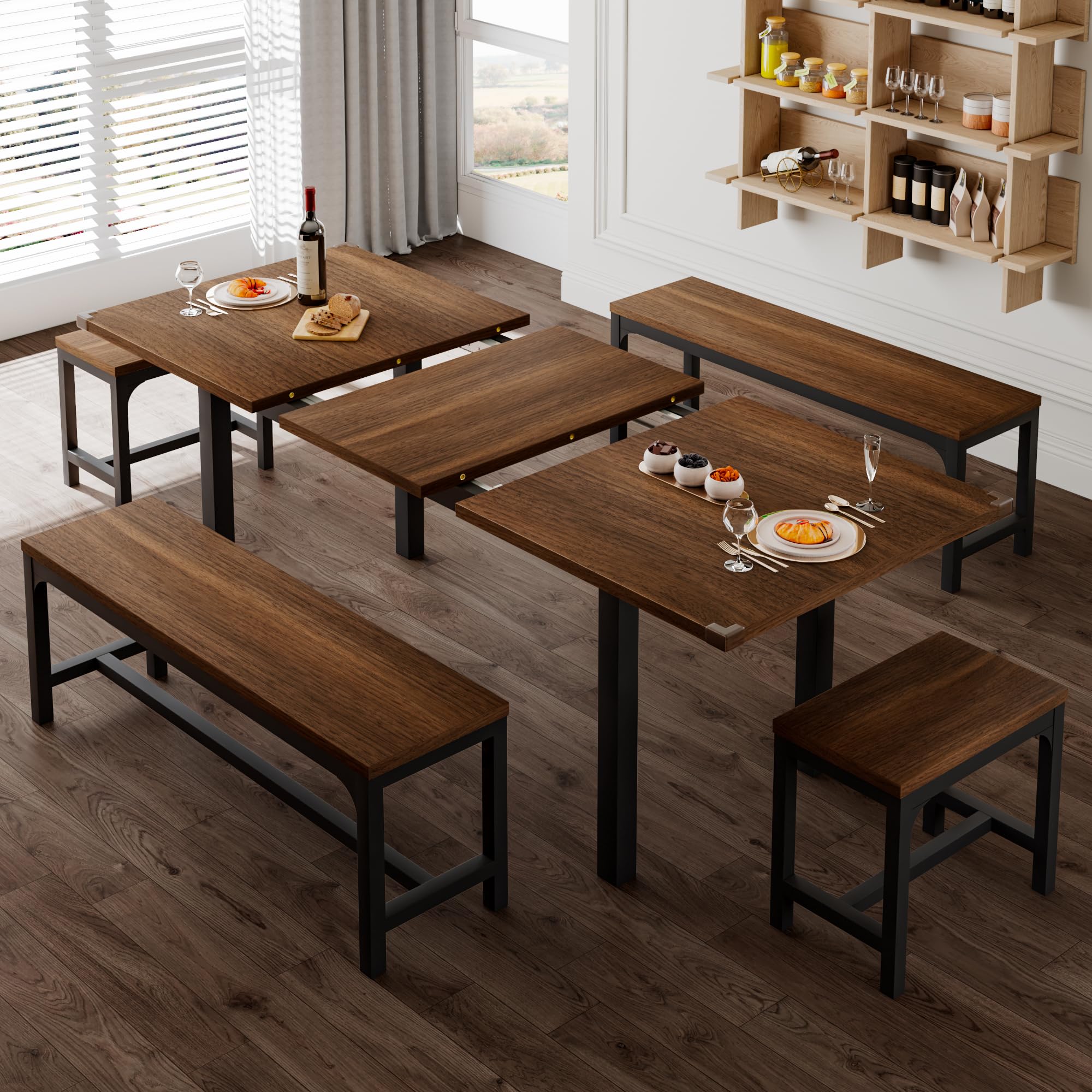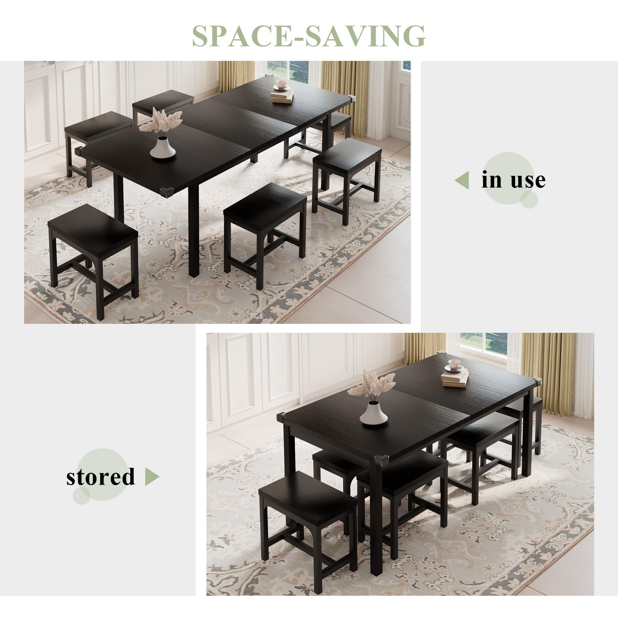 Feonase 5-Piece Dining Table Set for 4-8 People, 63" Large Extendable Kitchen Table Set with 2 Benches and 2 Square Stools, Dining Room Table with MDF Wood Board, Easy Assembly, Black