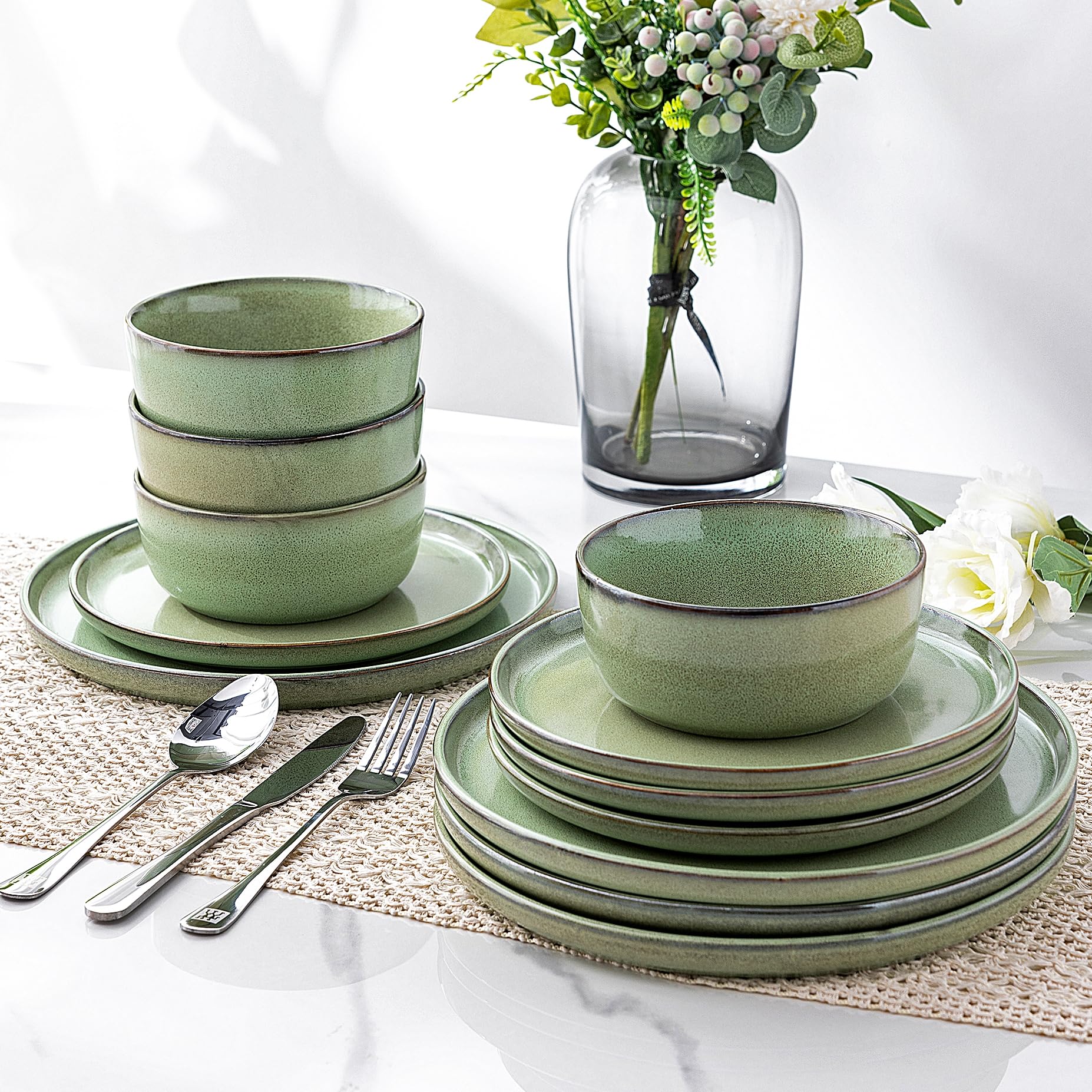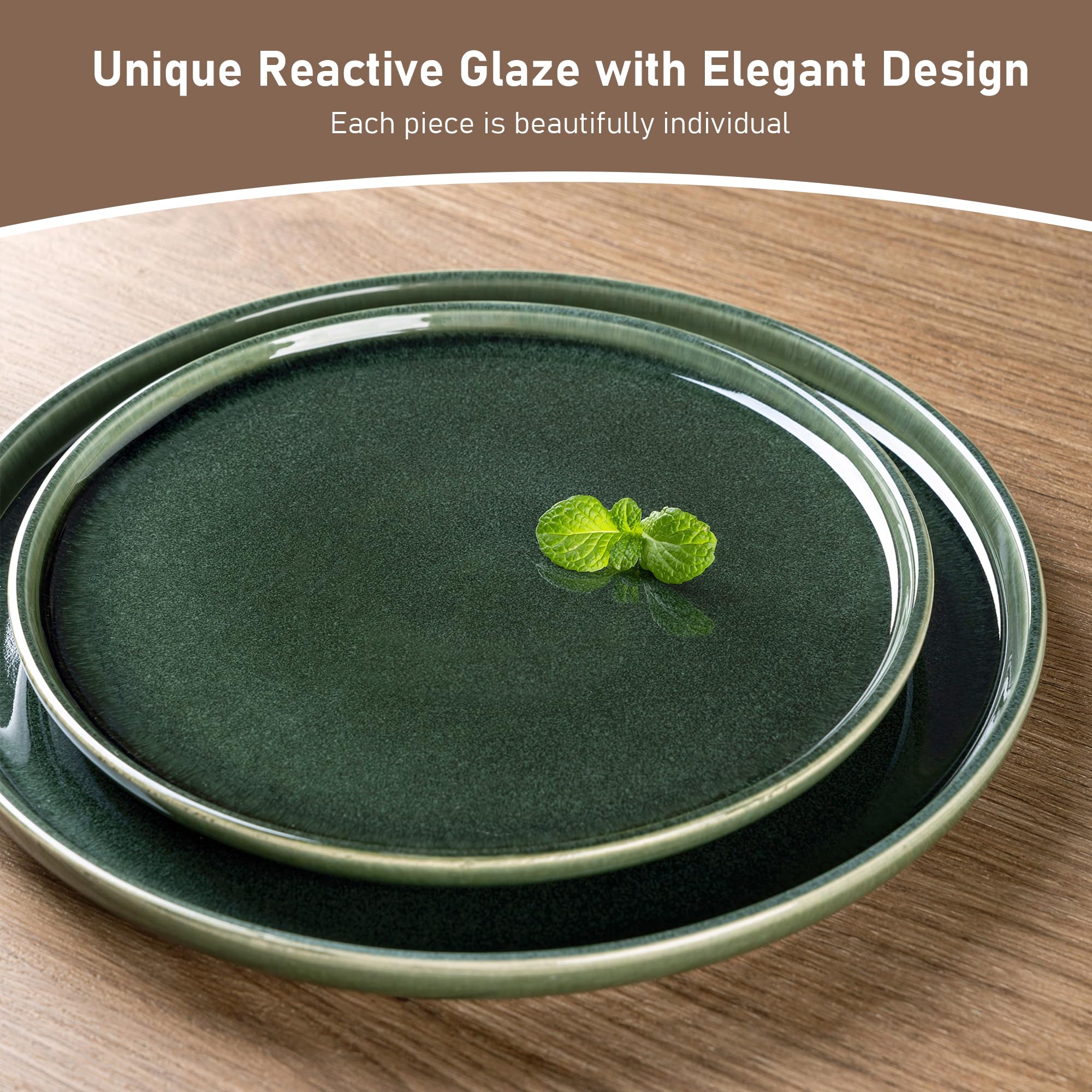 GBHOME Ceramic Dinnerware Sets for 8, 24 Pieces Stoneware Plates and Bowls Sets, Scratch Resistant Dishes, Dishwasher & Microwave Safe, Reactive Glaze-Green Wheat