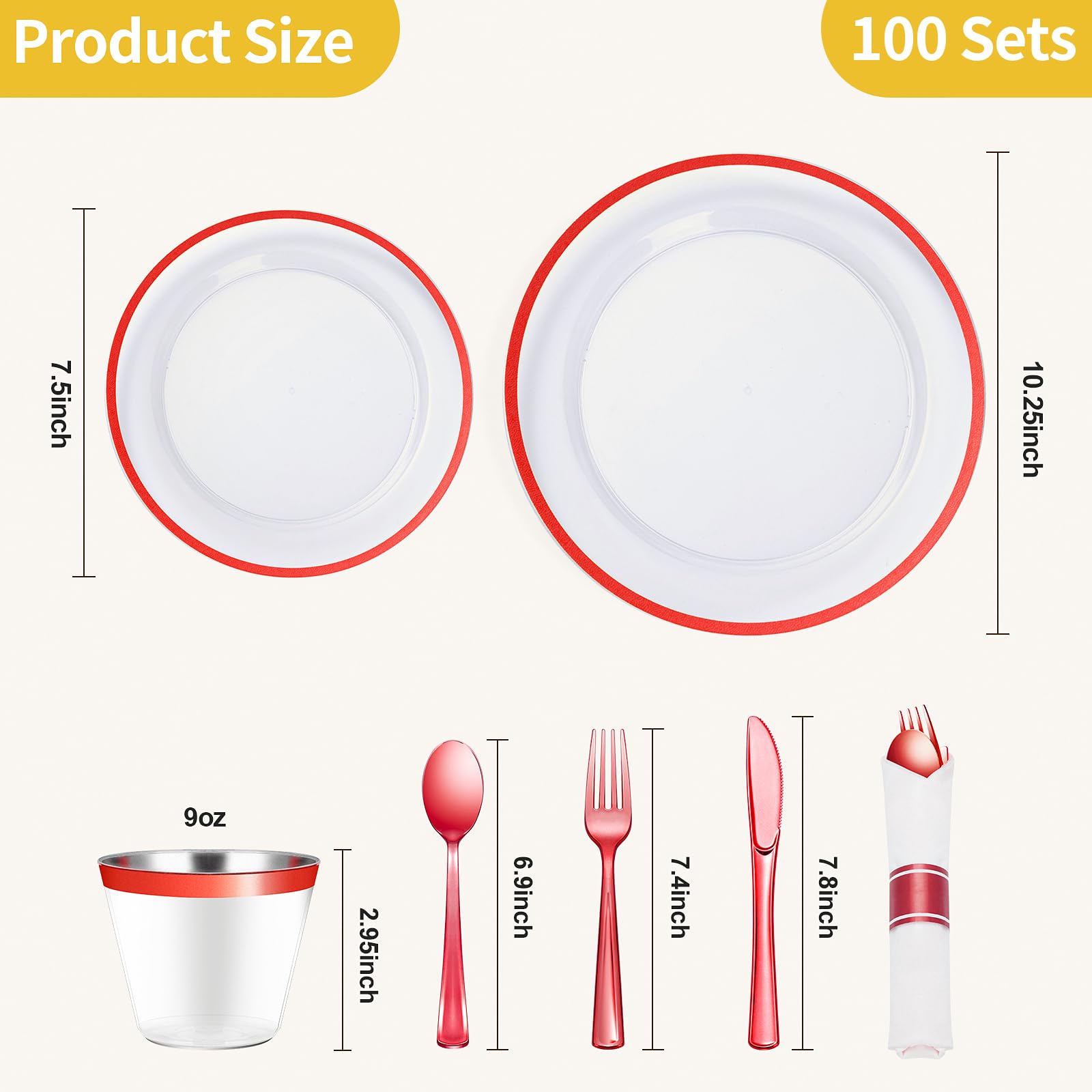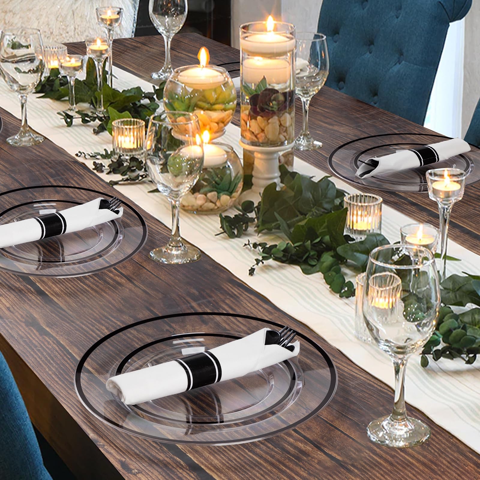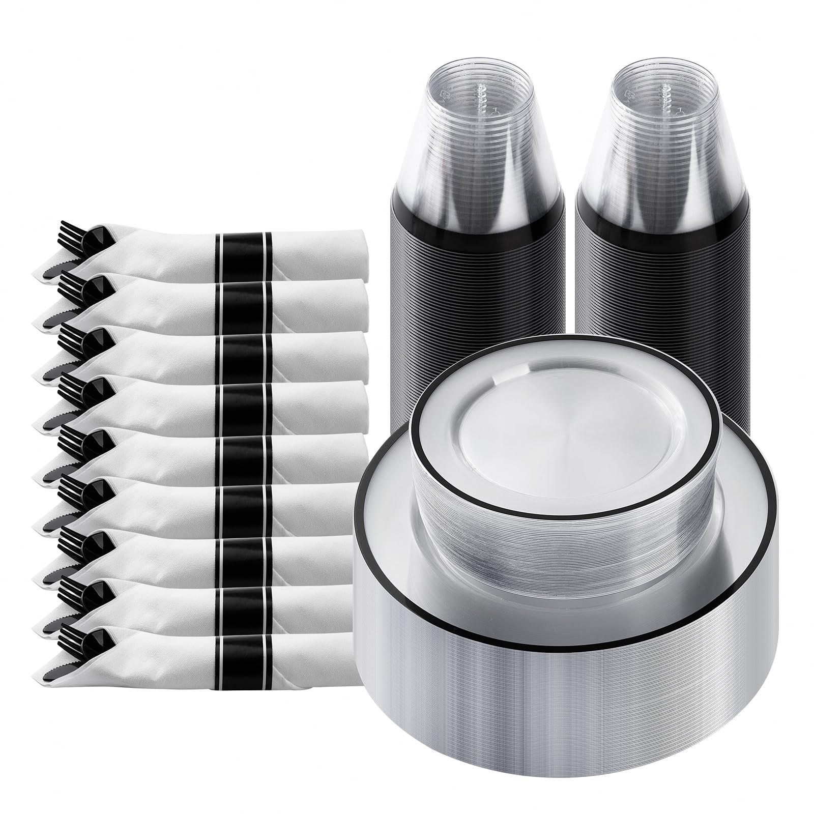 • SAFE MATERIALS - Crafted from food-grade plastic, this set of clear plastic plates and utensils is BPA-free. If you want to reuse the plastic utensils set, simply wash them with water, and they won't retain any typical smells or tastes in the food. The disposable napkins wrapped around the tableware add convenience.