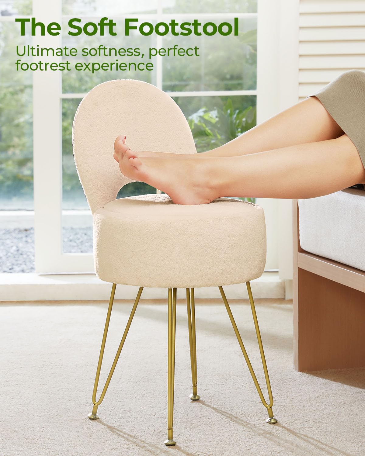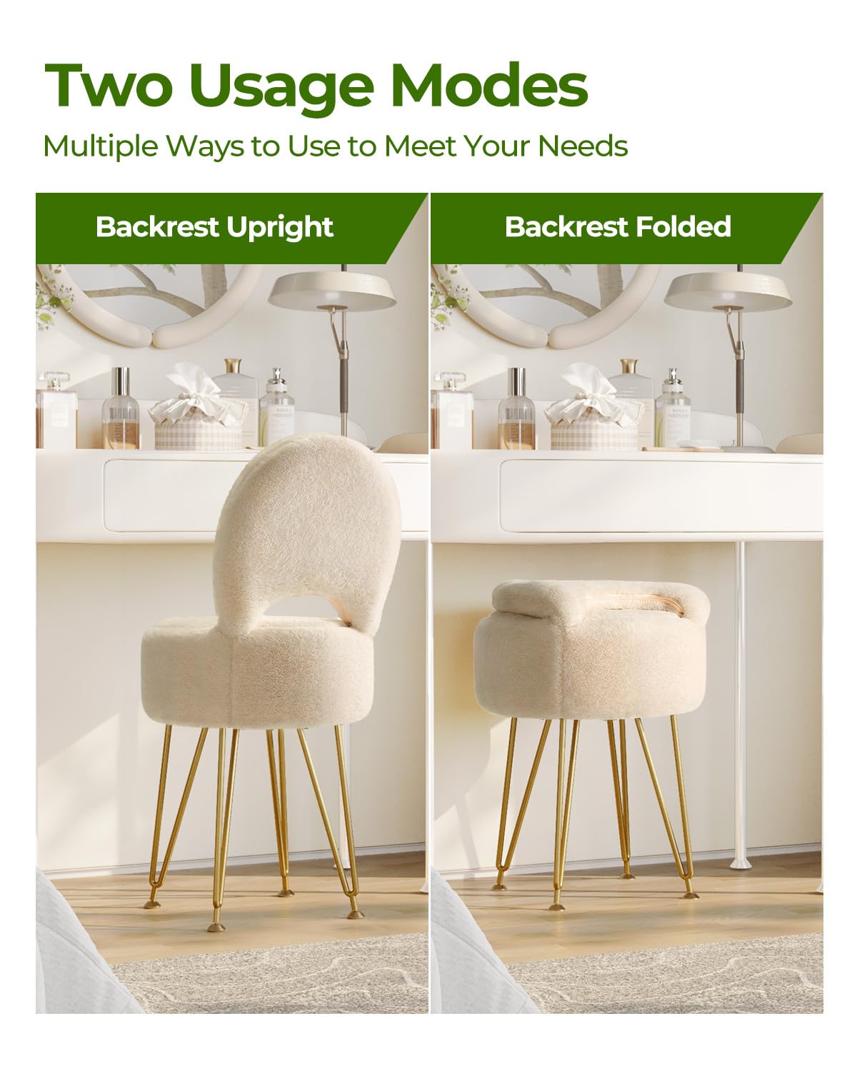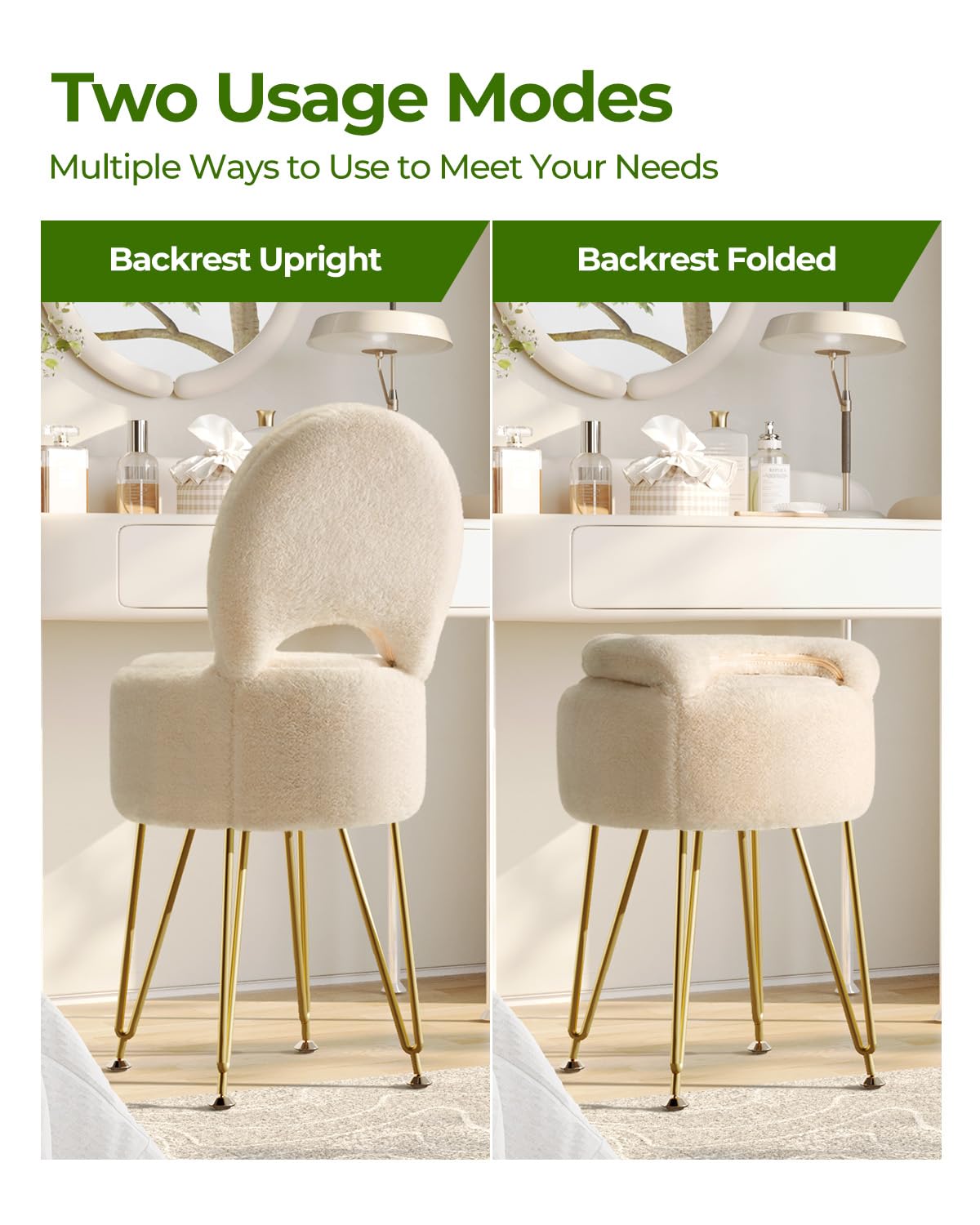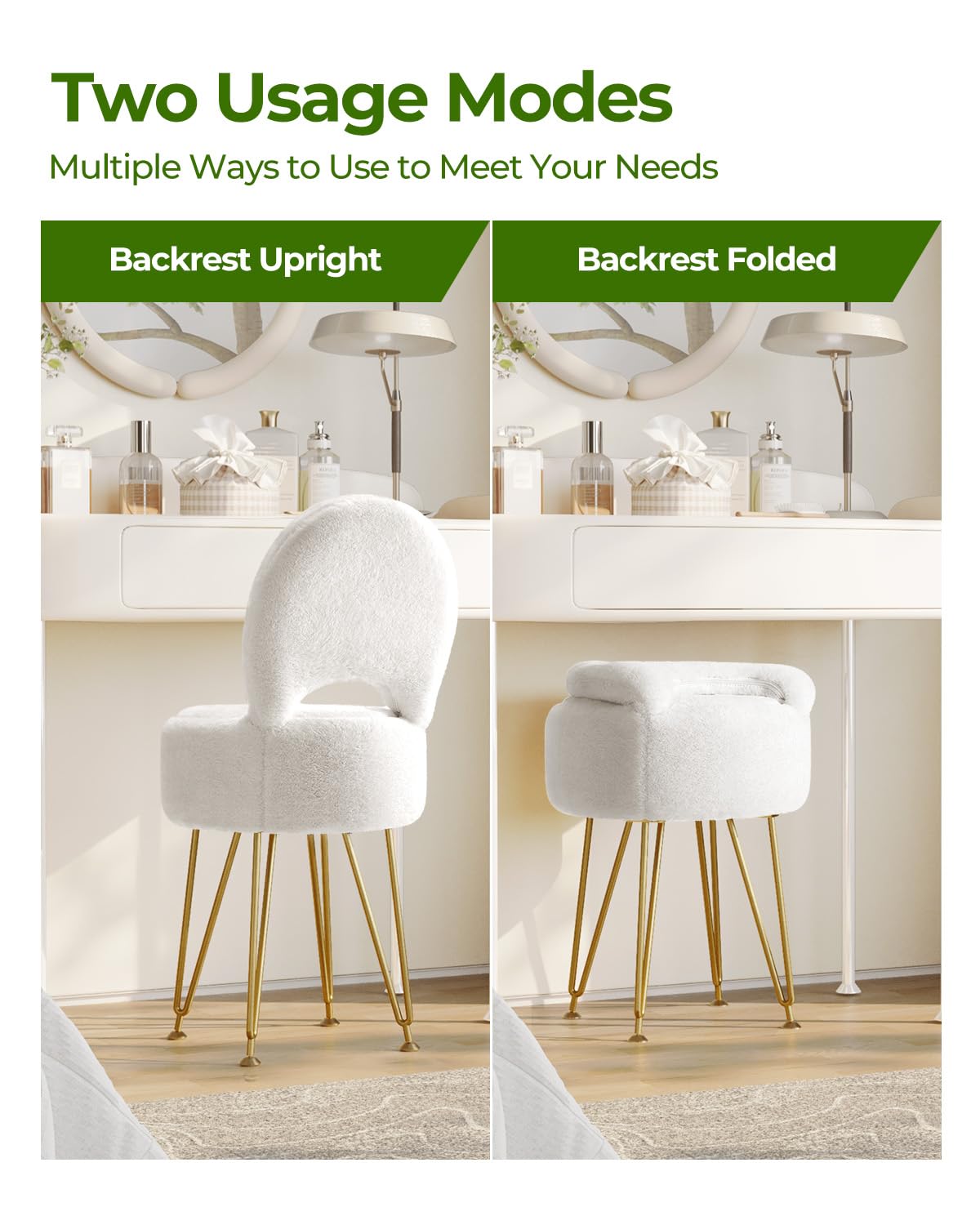 GREENSTELL Small Vanity Stool Chair with Storage and Folding Back, 13" x 13" x 17.7" Faux Fur Soft Ottoman for Teenager, 4 Metal Legs with Anti-Slip Feet, Furry Padded Seat for Makeup, Bedroom, White