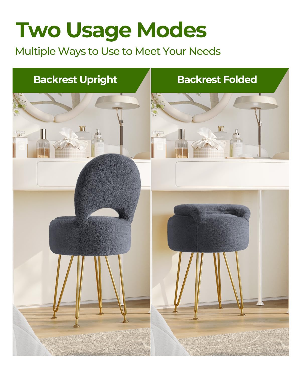 • Adjustable Folding Backrest: The vanity stool features a foldable backrest that adjusts between upright and reclined positions, ensuring comfort during extended use. Its sleek design adds elegance and saves space when not in use. The small vanity stool is suitable for tight spaces and can fit comfortably in various room sizes, including small bedrooms or vanity areas