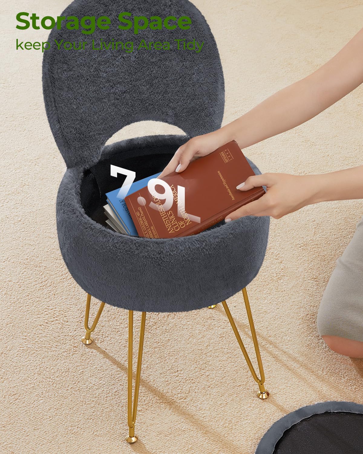 • Furry Vanity Chair with Storage: Greenstell small vanity chair with soft faux fur, can be placed in the bedroom, living room, dressing room, office, etc. it can be a normal stool as a supplement at home, or a footstool with just the right height to match the sofa or the chair, and ottoman can also be a storage basket that can be moved anywhere. You can have any small objects you want at your fingertips