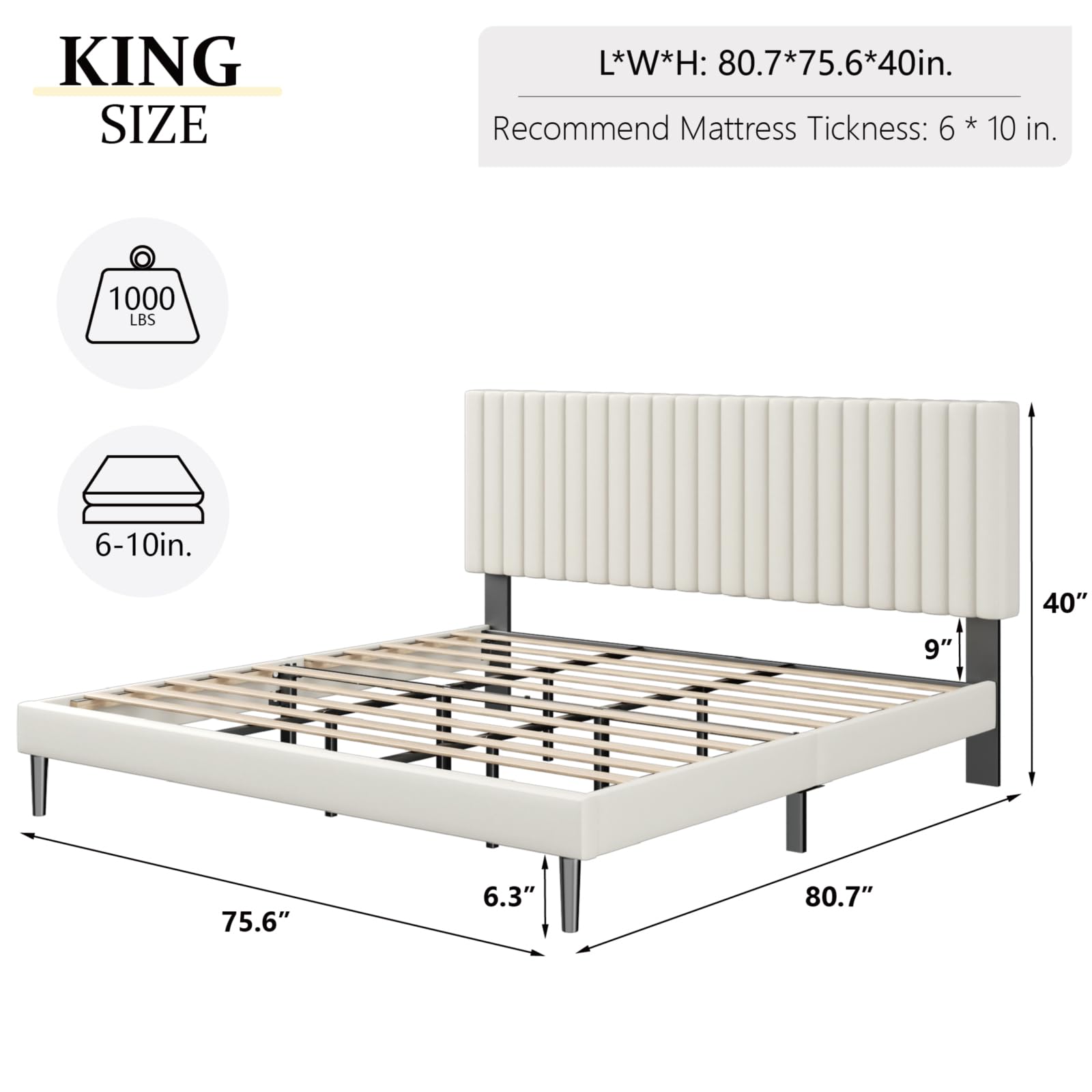 Sturdy and Durable: Crafted from high-quality metal, our bed frame features 9 center support legs and an evenly-spaced slat system forming a sturdy structure that provides reliable and long-lasting support.