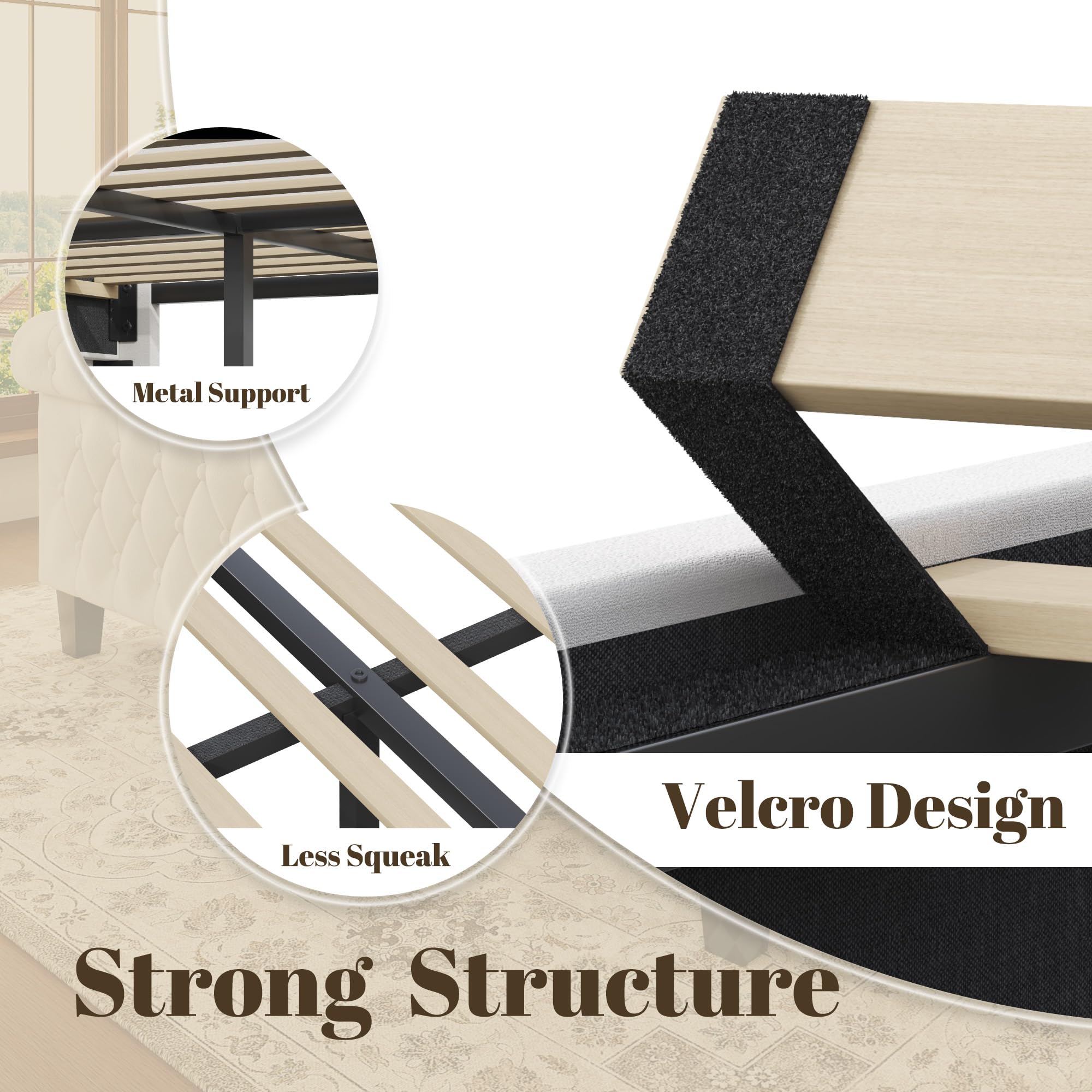 HISOFT Queen Bed Frame, 39" Tall Velvet Upholstered Sleigh Bed with Wingback Headboard & Scroll Footboard, No Box Spring Needed, Sturdy Support, Easy Assembly, Noise Free, Button Tufted, White