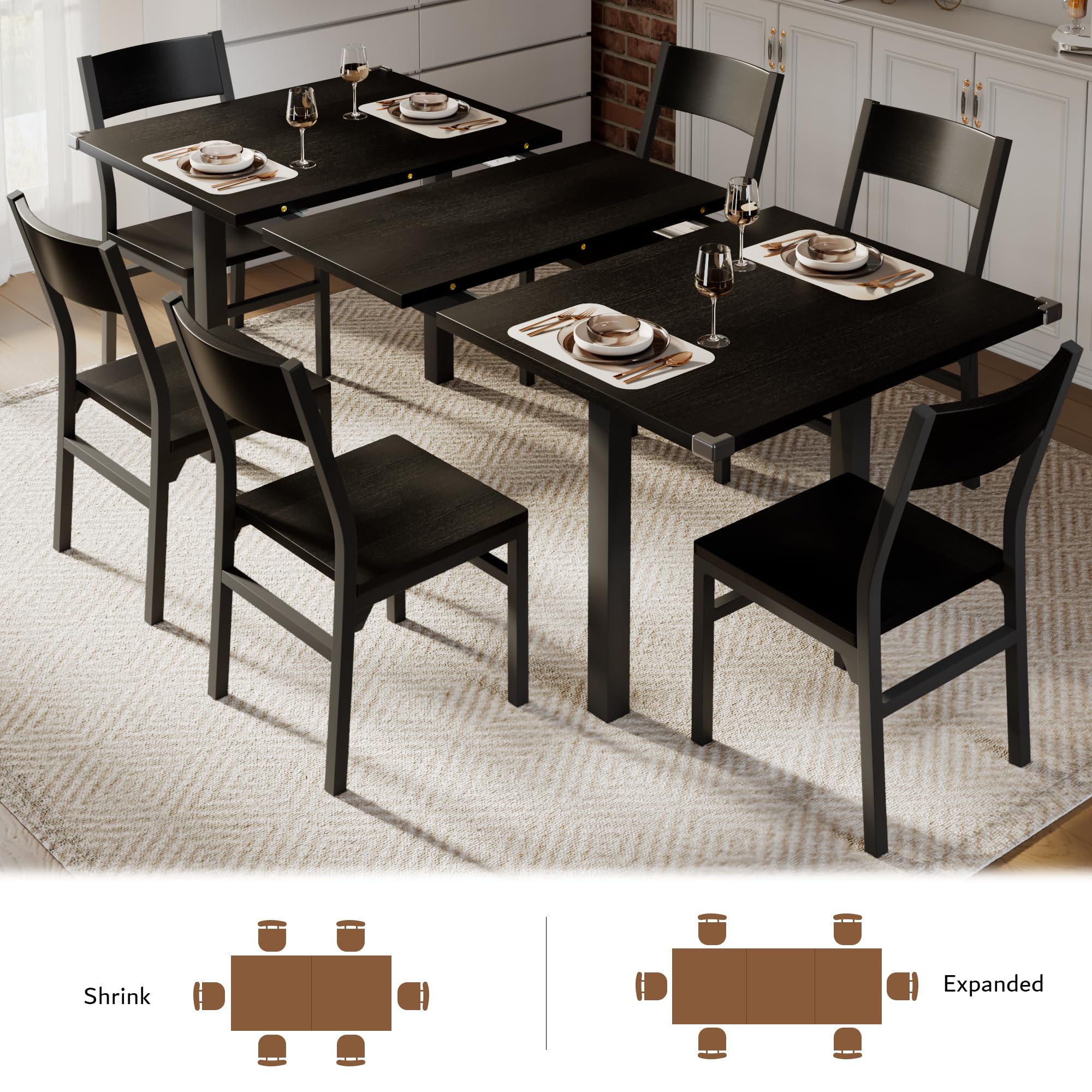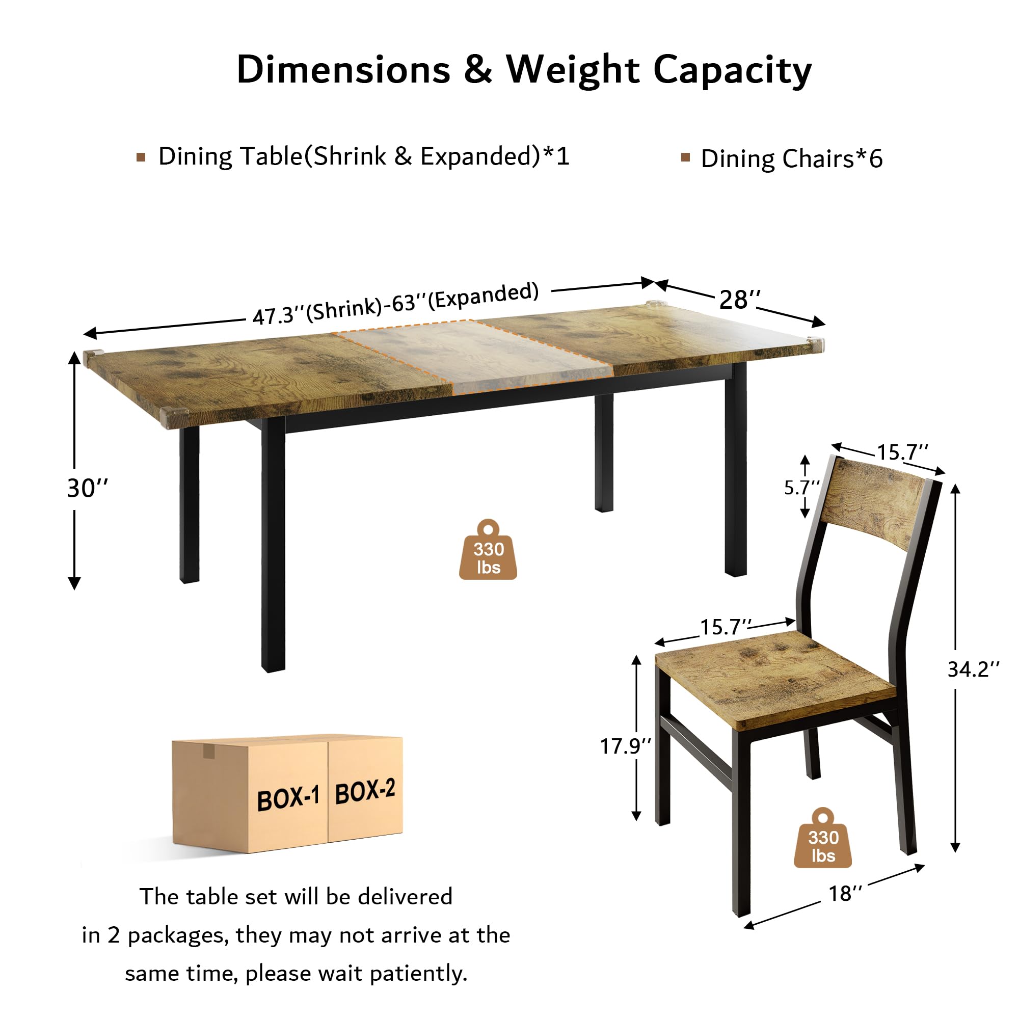 Modern Dining Table and Chairs Set: This dining table set contains 1 table and 6 chairs. Table size: : 47.3"L x 28"W x 30"H (Shrink); 63"L x 28"W x 30"H(Expanded); Chair Size: 34.2"H x15.7"W x 18"L. It has a wide range of uses, which can be used for home, kitchen, living room and dining room, etc