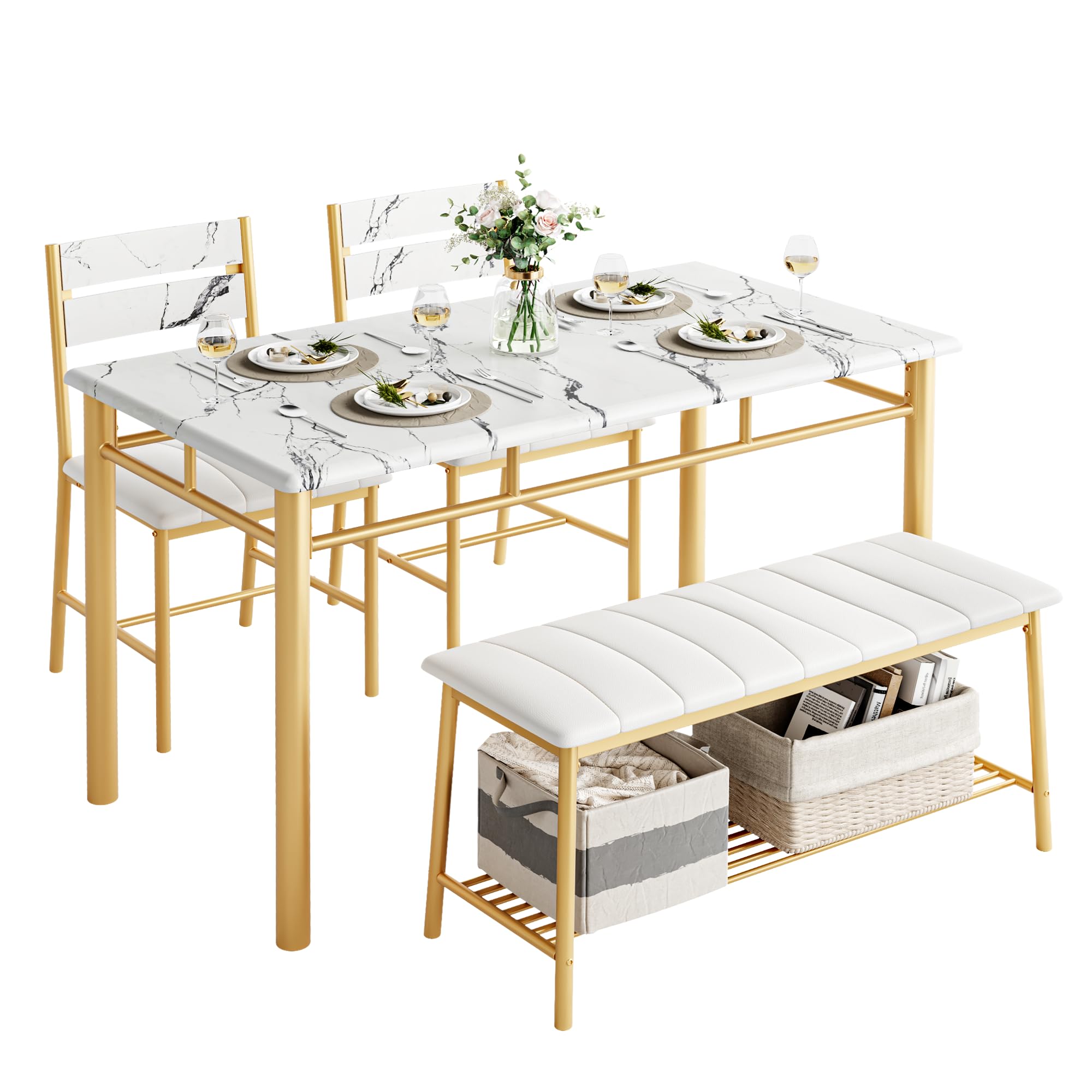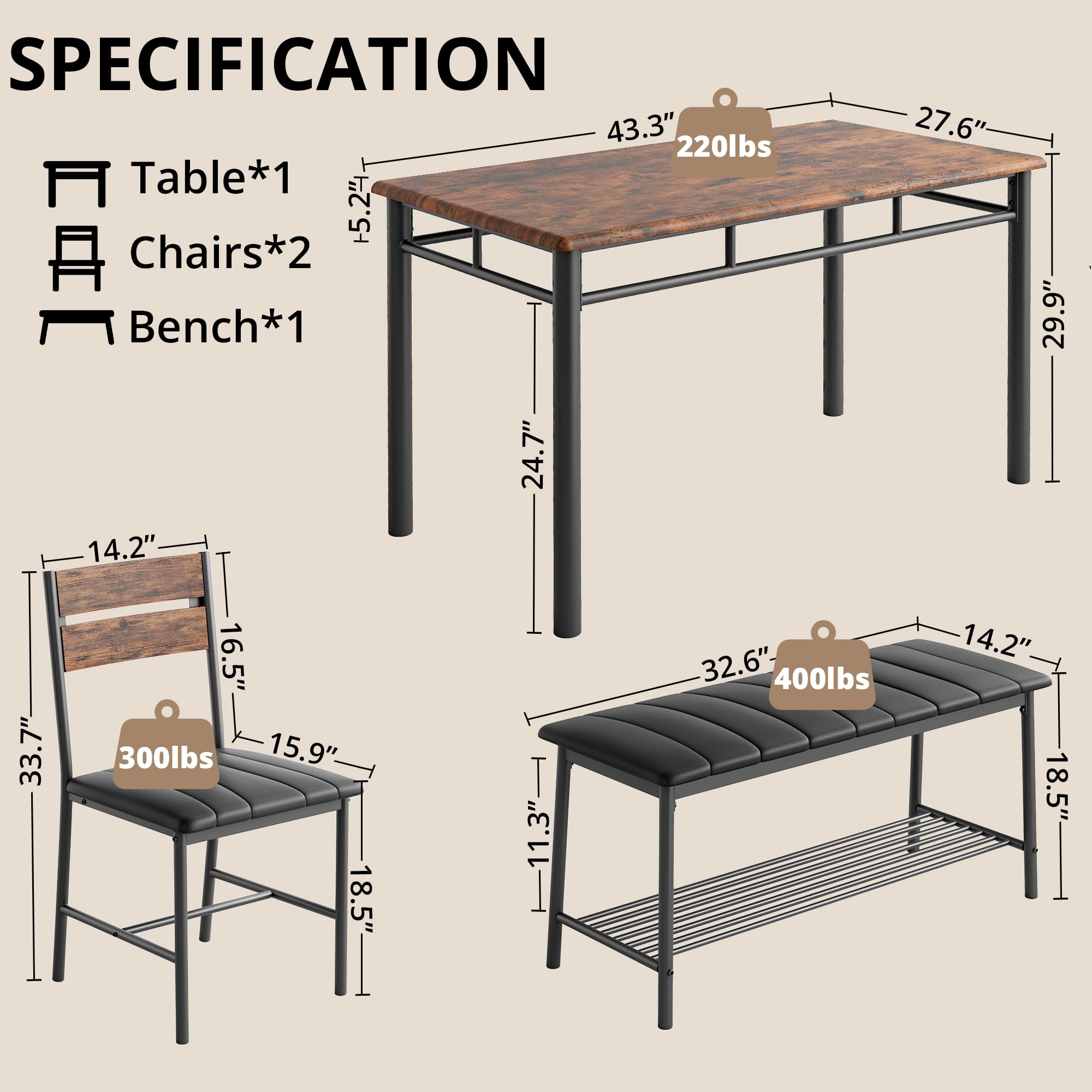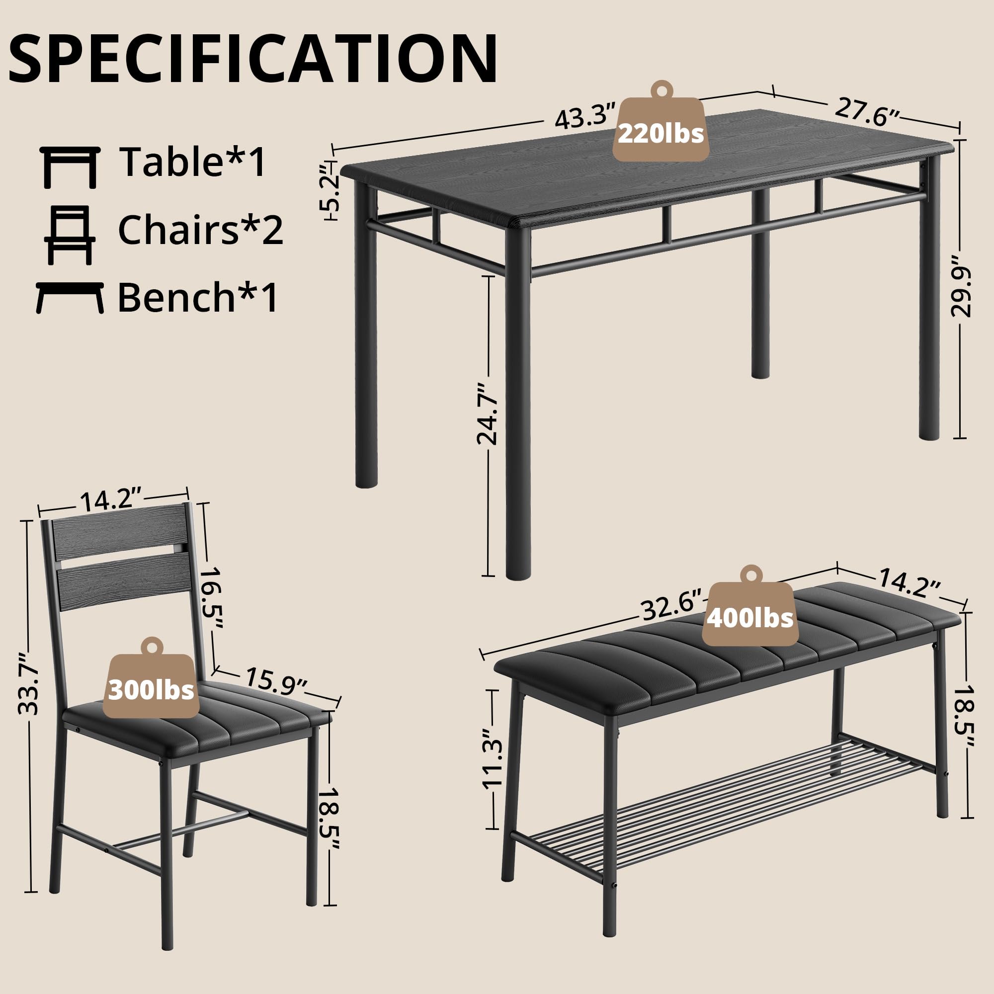 Space-saving Design: Designed with practicality in mind, the bench and chairs can be tucked neatly under the table when not in use, maximizing the use of space, perfect for apartments or smaller rooms, keeping the room neat and organized
