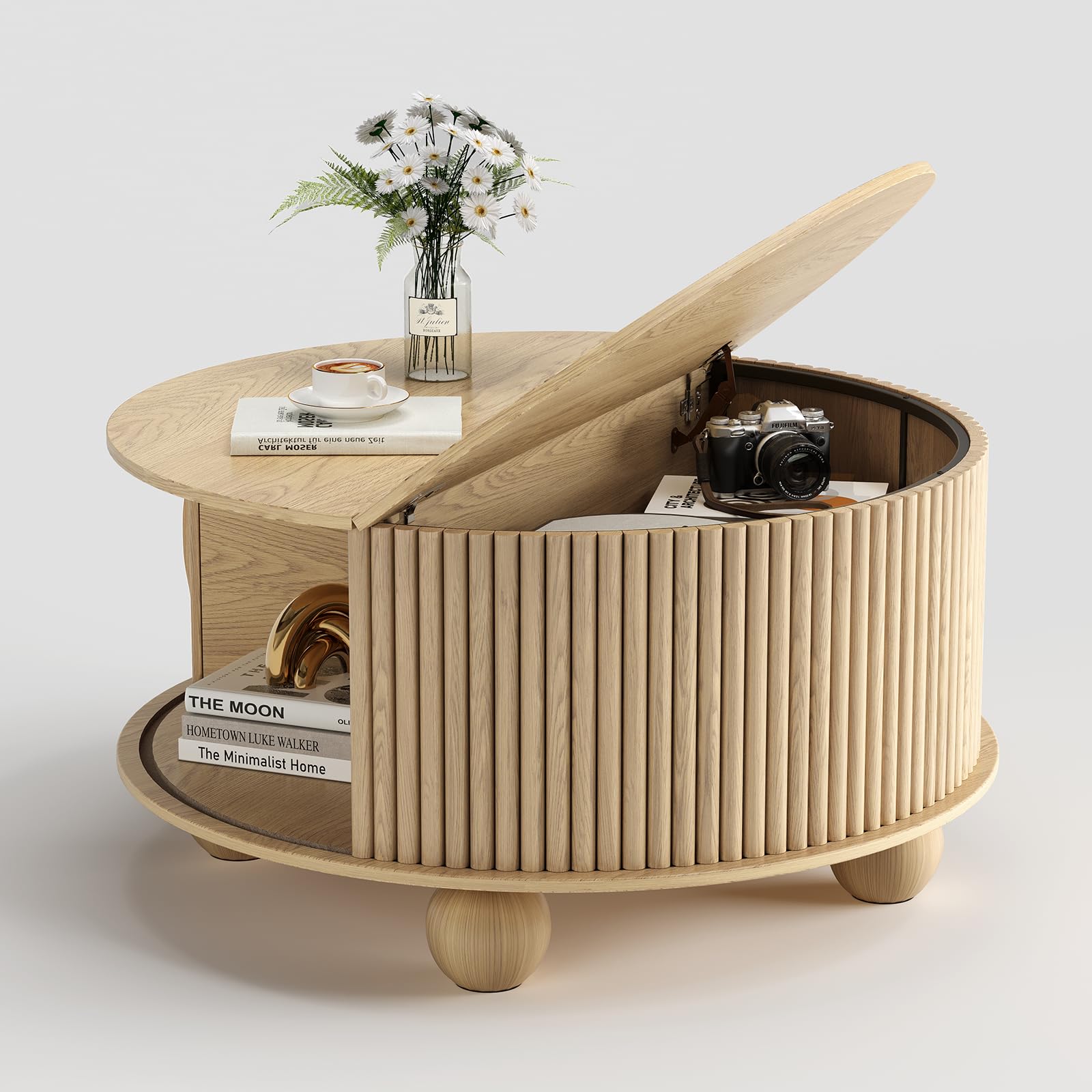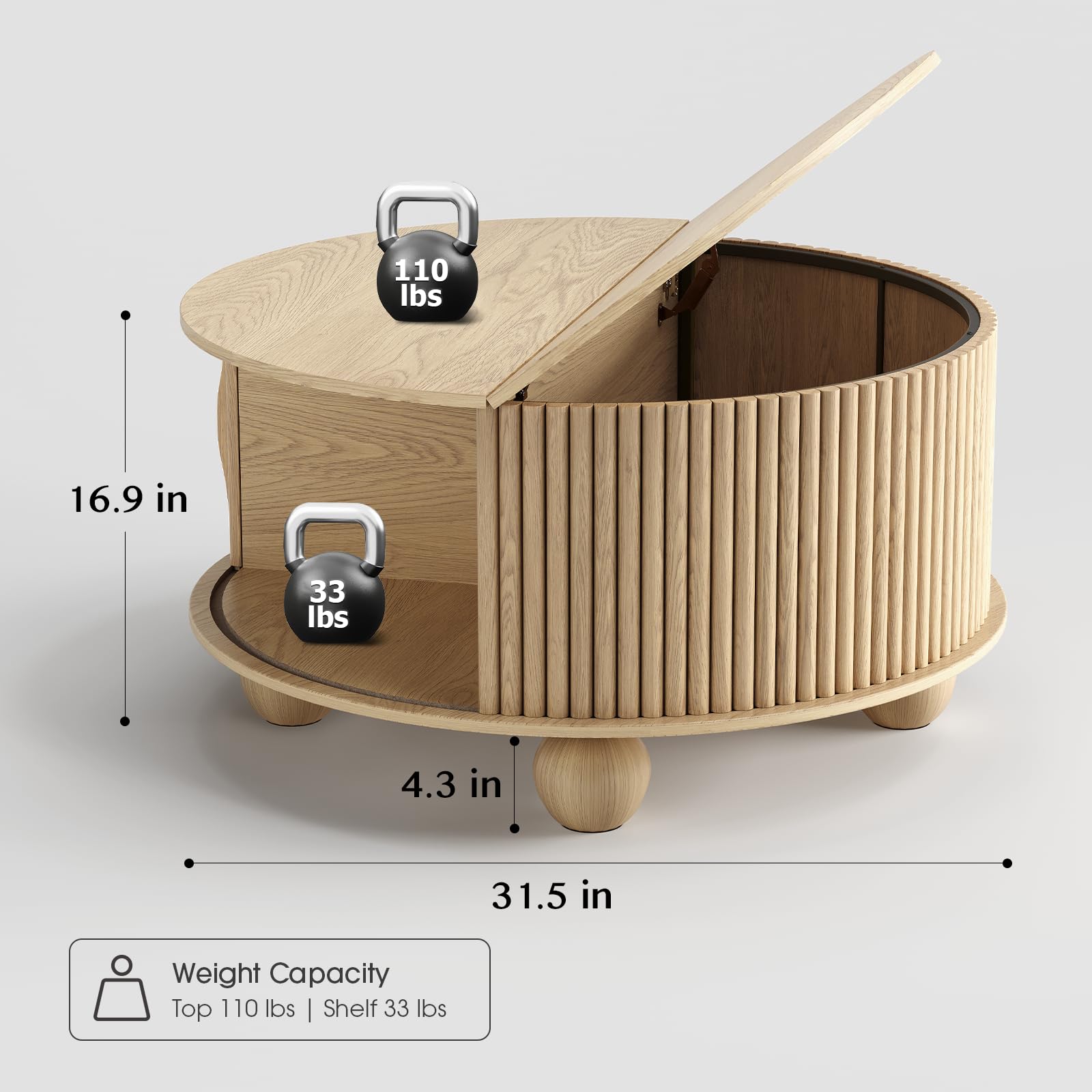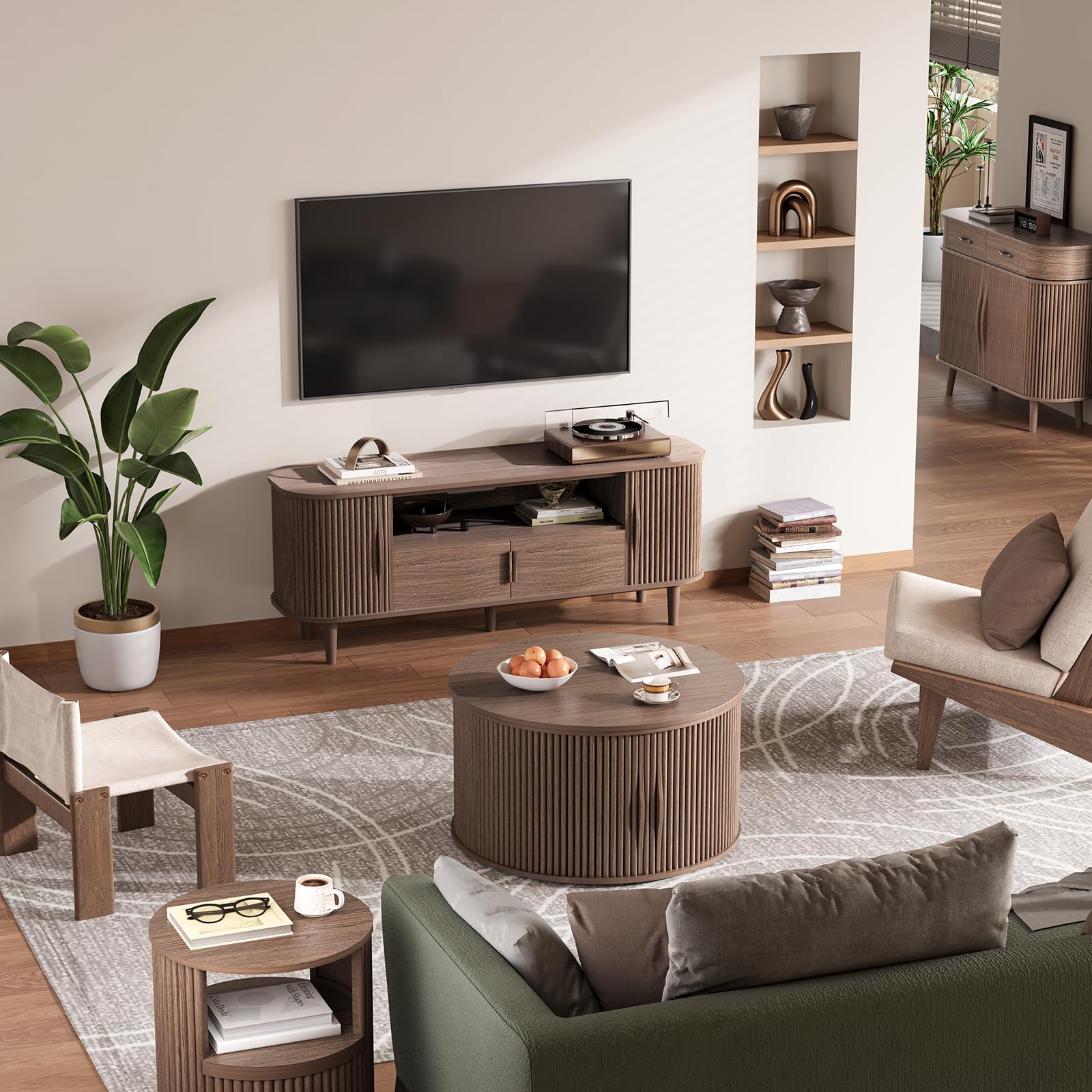 JOINICE, Round Coffee Table with Storage, Mid Century Modern Center Table with Sliding Cabinet Door, Fluted Dining Table for Living Room, Home Small Space, 31.5", Walnut