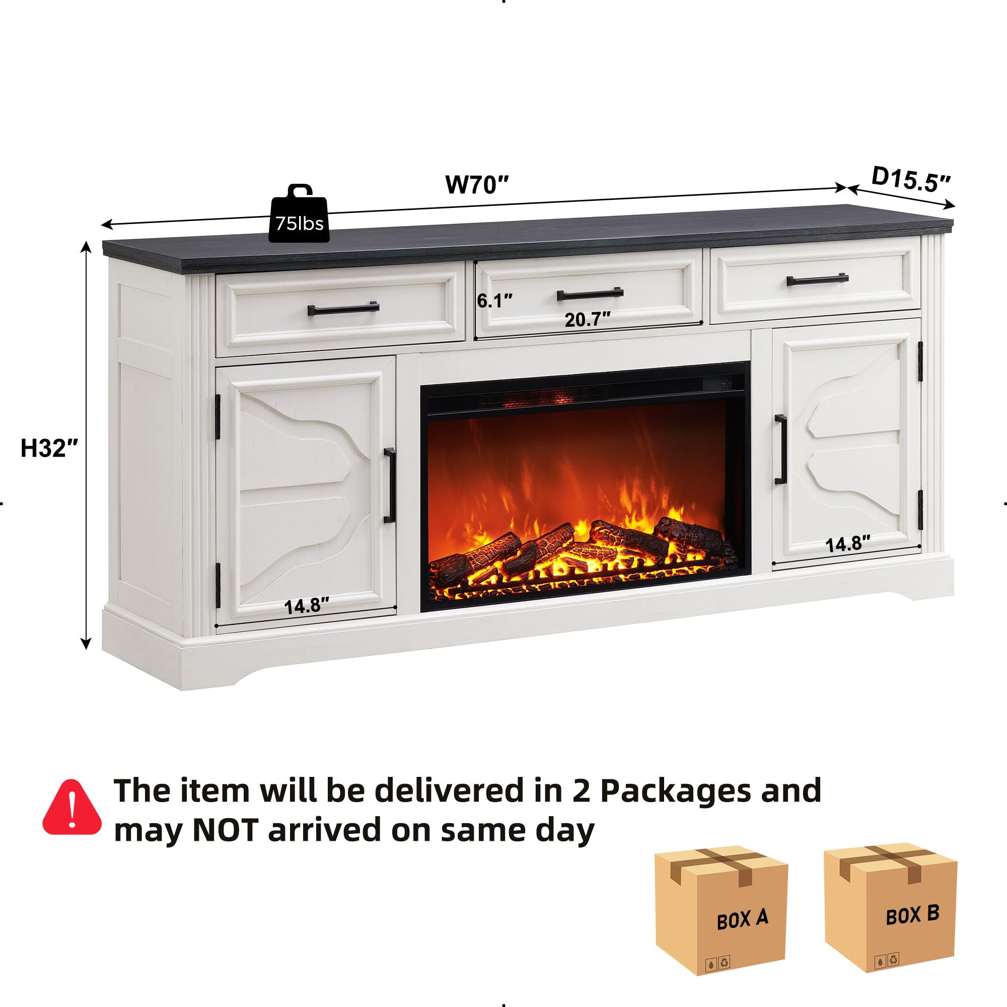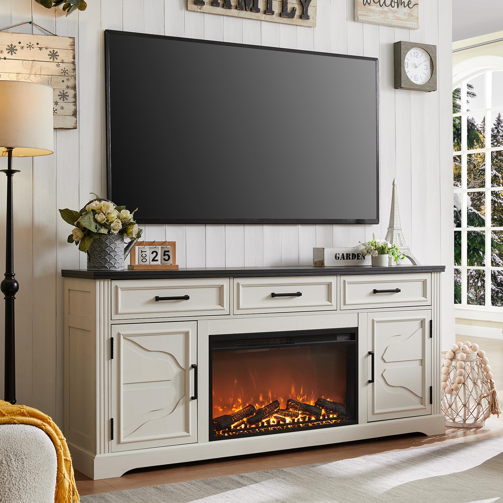 JXQTLINGMU Farmhouse Fireplace TV Stand for Up to 80 Inch TV, Entertainment Center with 30" Electric Fireplace for 65 75 Inch TV, 70" TV Stand with Storage Cabinet Drawer for Living Room (Off White)