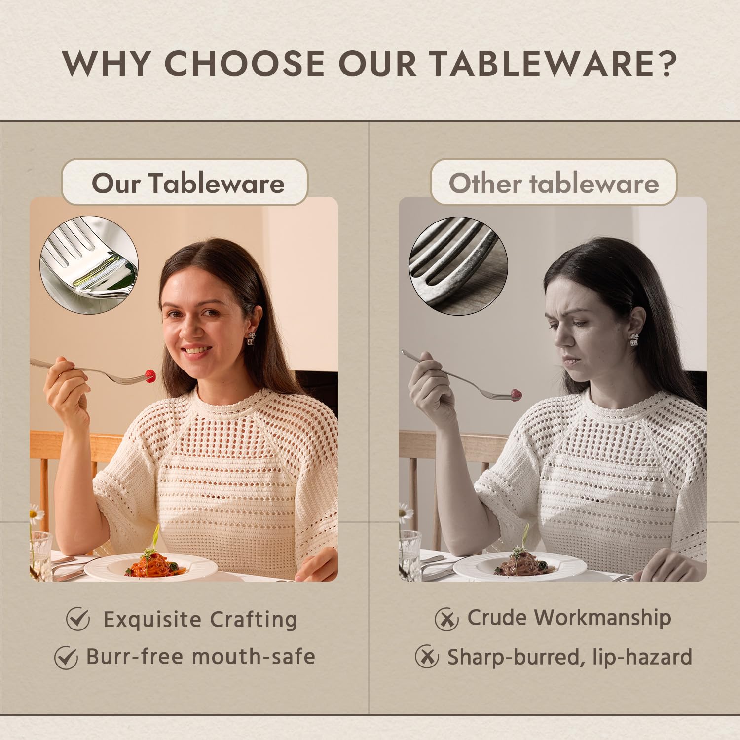 • TOP WORKMANSHIP:This tableware use more than 10 times handcraft polishing instead of machine polishing to make the surface like a mirror. High-temperature forging technology enhances the hardness of the material and will not bend or deform.