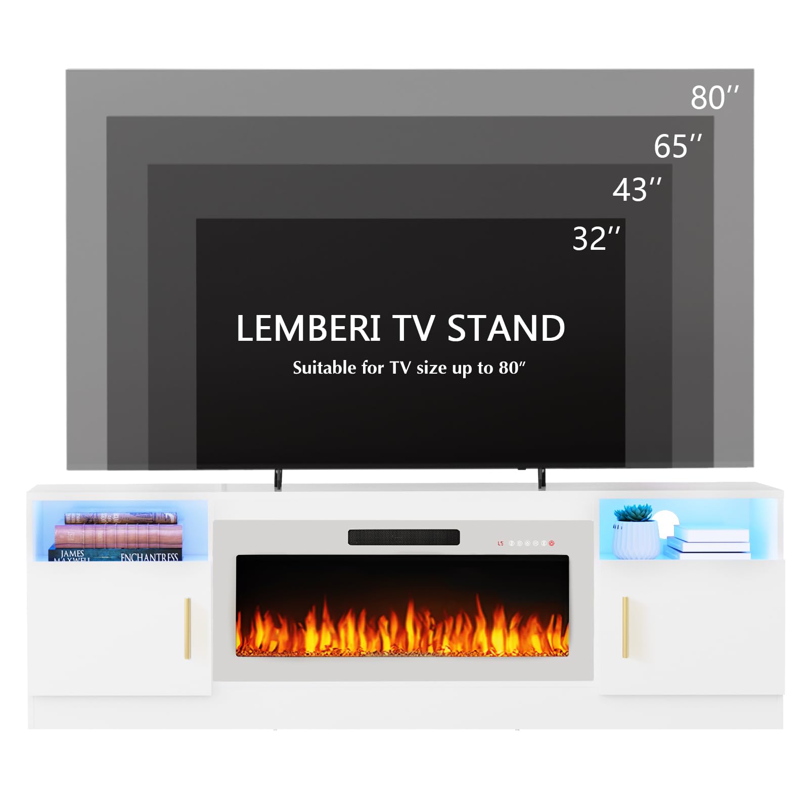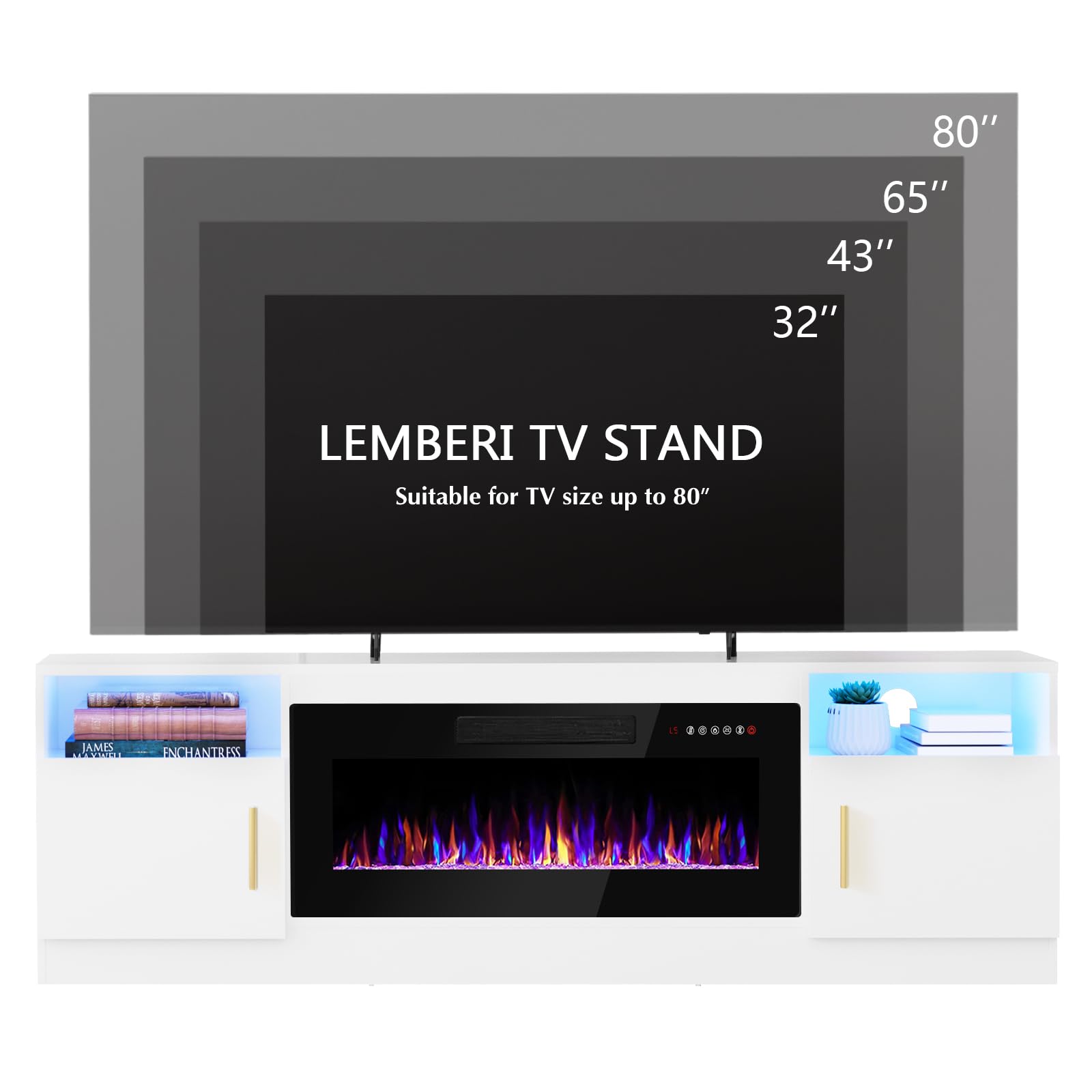 Lemberi Fireplace tv Stand with 36 inch Fireplace Up to 90" TVs, LED Light Entertainment Center and Storage, 80" Modern Wood Media TV Console with Highlight Cabinet for Living Room (White)