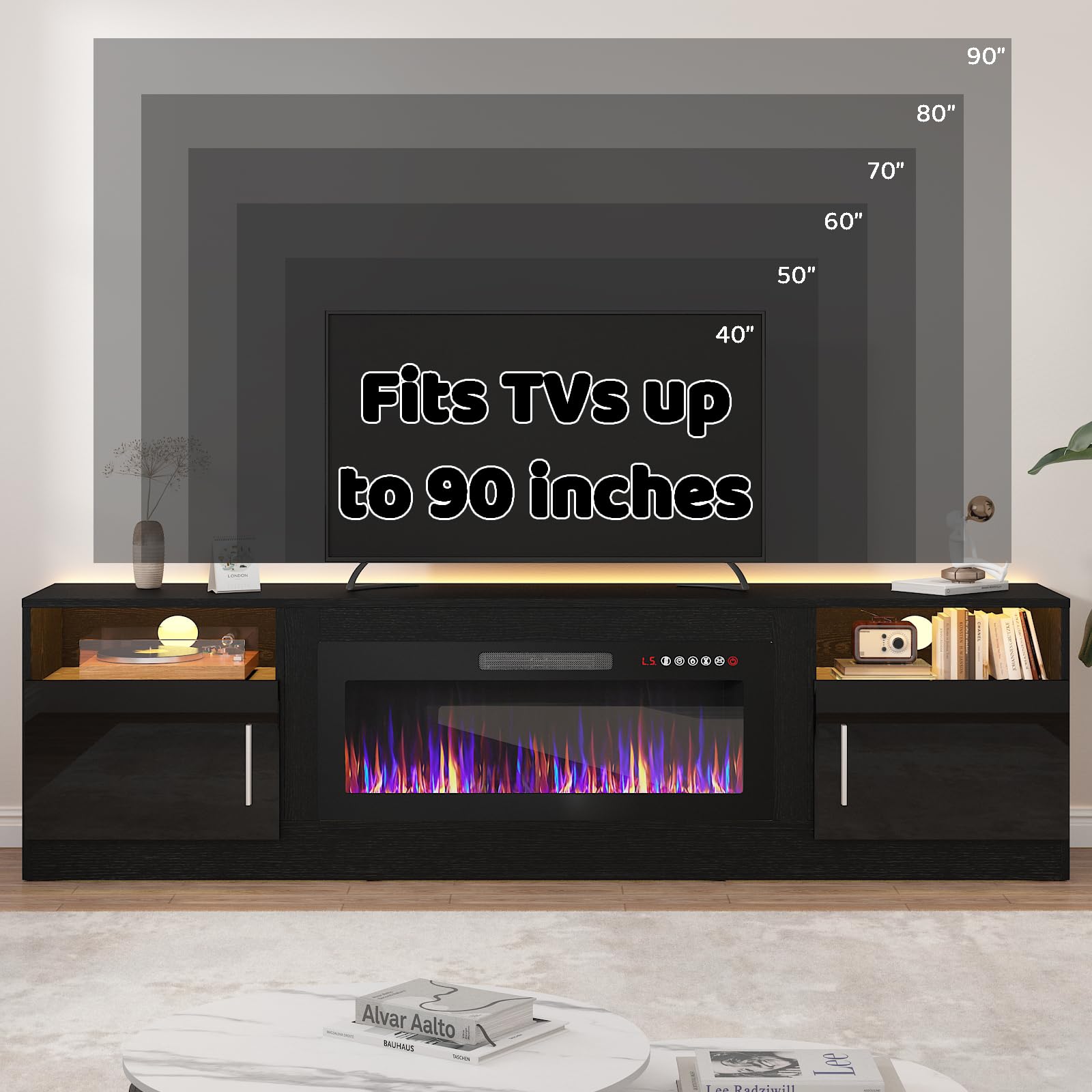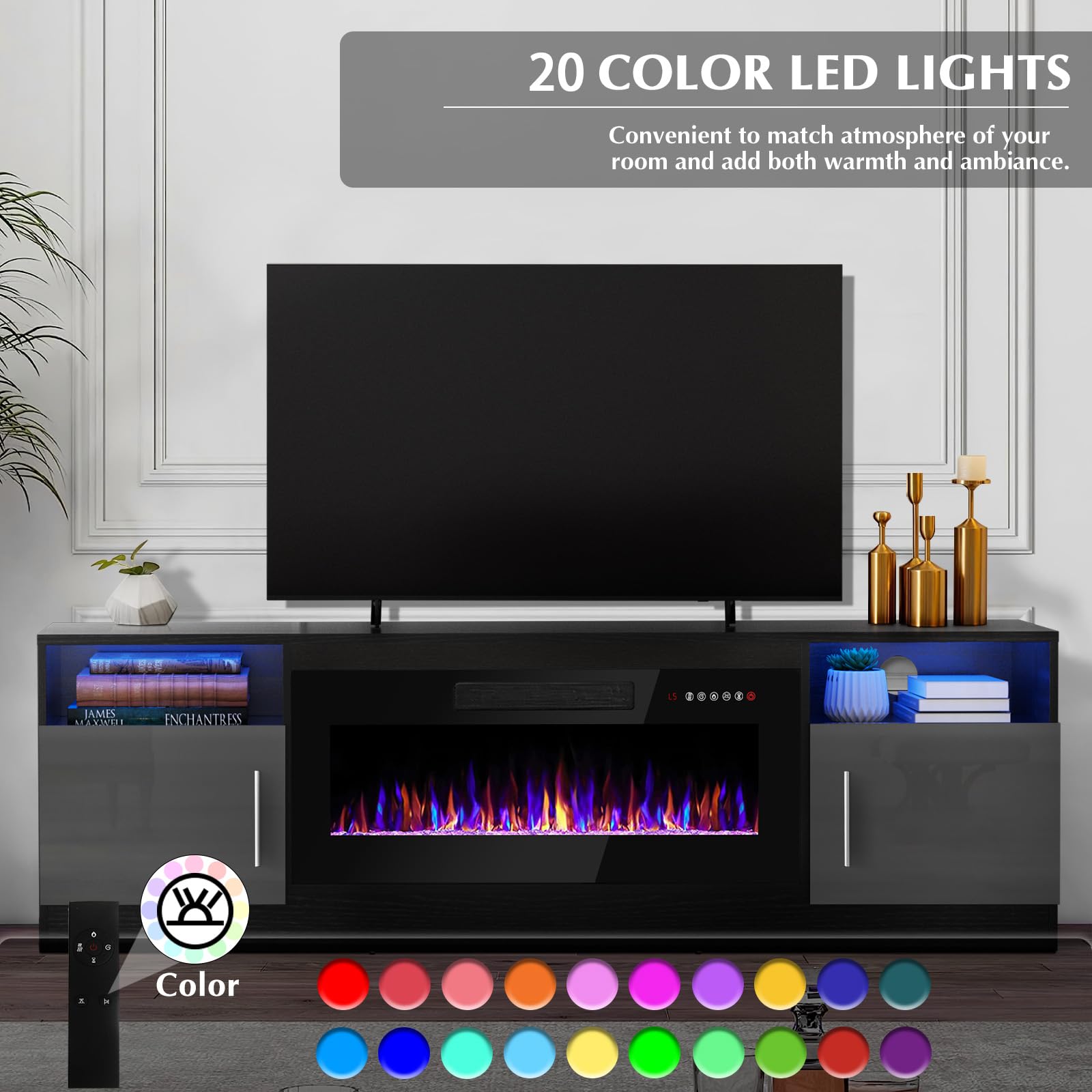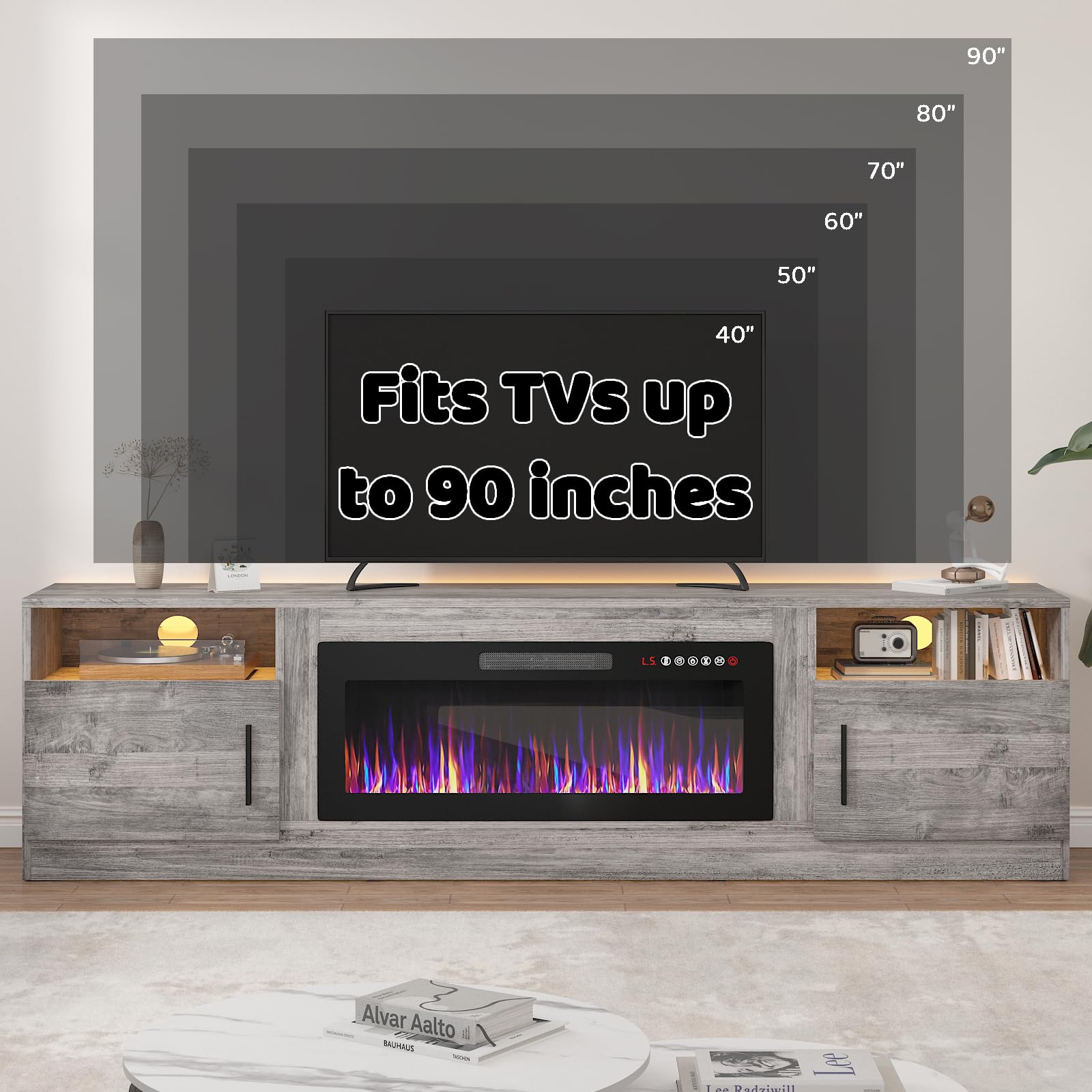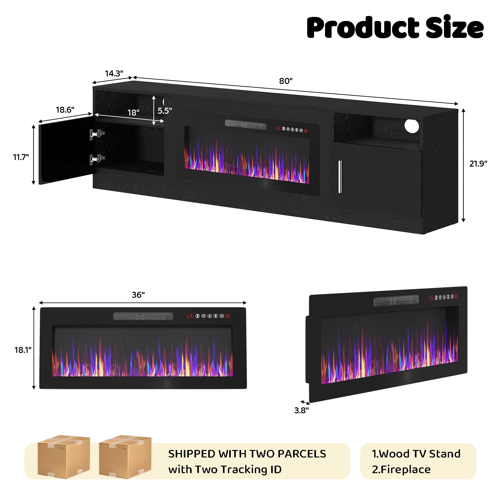 • 80 Inch Unique TV Stand: The sleek finish features a contemporary design,blending perfectly with your home's style. Combines a 80" W x 14" D x 22" H TV stand with a 36" electric fireplace, fits TVs up to 90 inches. Built-in LED lights offer 20 changeable colors,you can control color change by remote control.Providing a comfortable viewing experience.