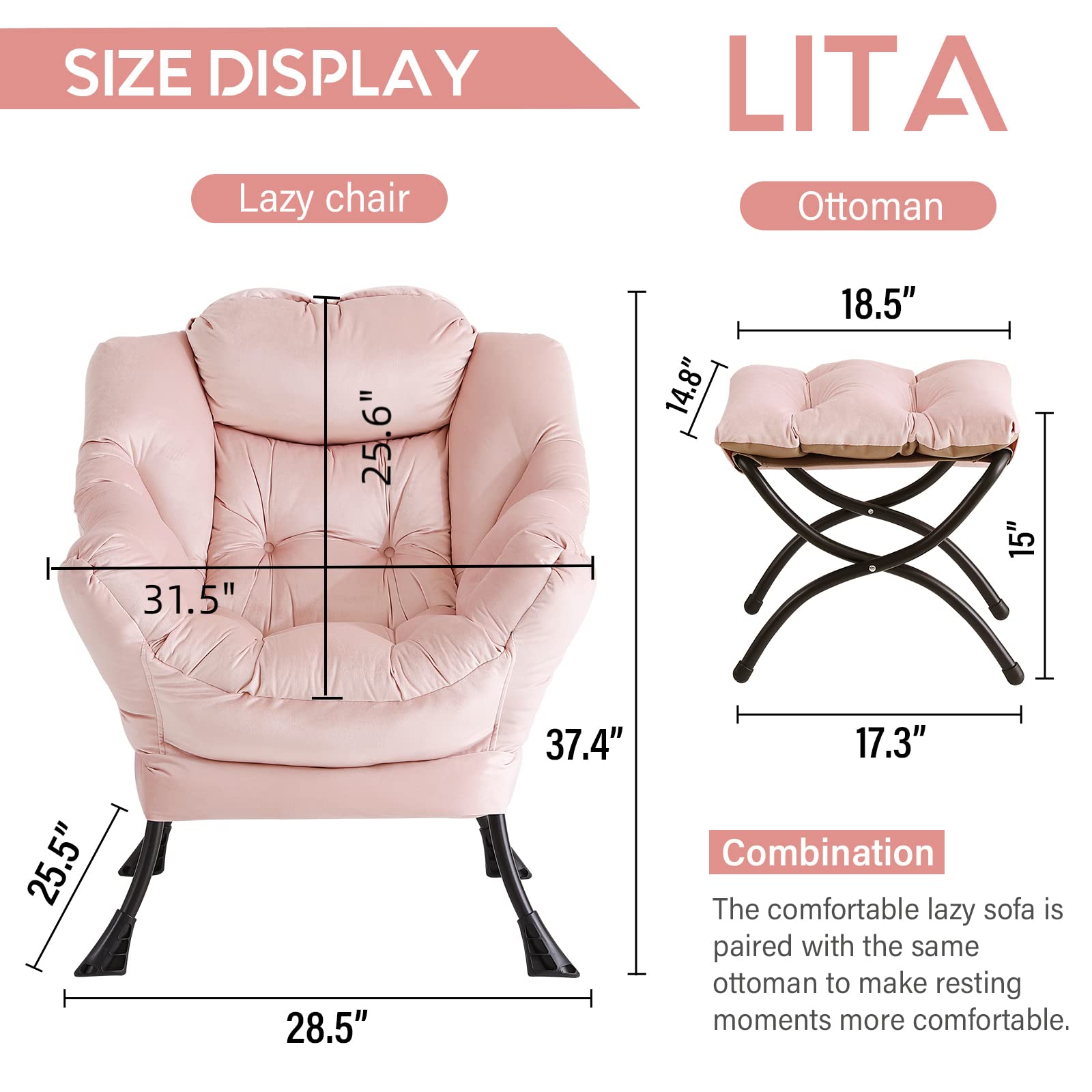 • DURABLE ACCENT CHAIR: The leisure chair features the strong steel frame with powder spray coating. And it also has a middle tube to well support the whole chair. Can hold up to 400lbs. Moreover, footstool cover of the chair prevents slip, which makes you sit still and protect the floor