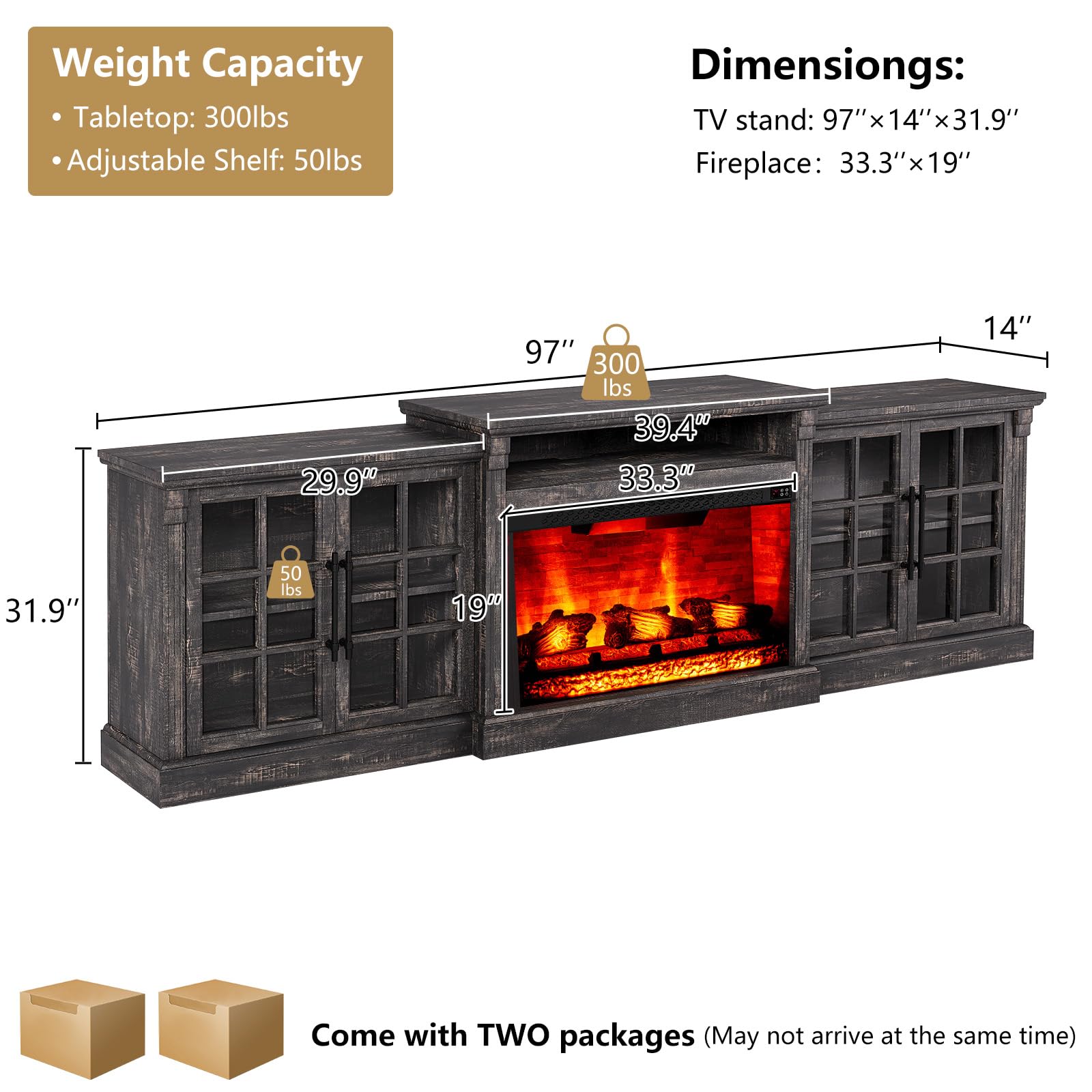 LUXOAK 97" Farmhouse TV Stand with 33" Fireplace for TVs up to 100", Media Entertainment Center with Large Storage Cabinet and Adjustable Shelves for Living Room, White/Barnwood