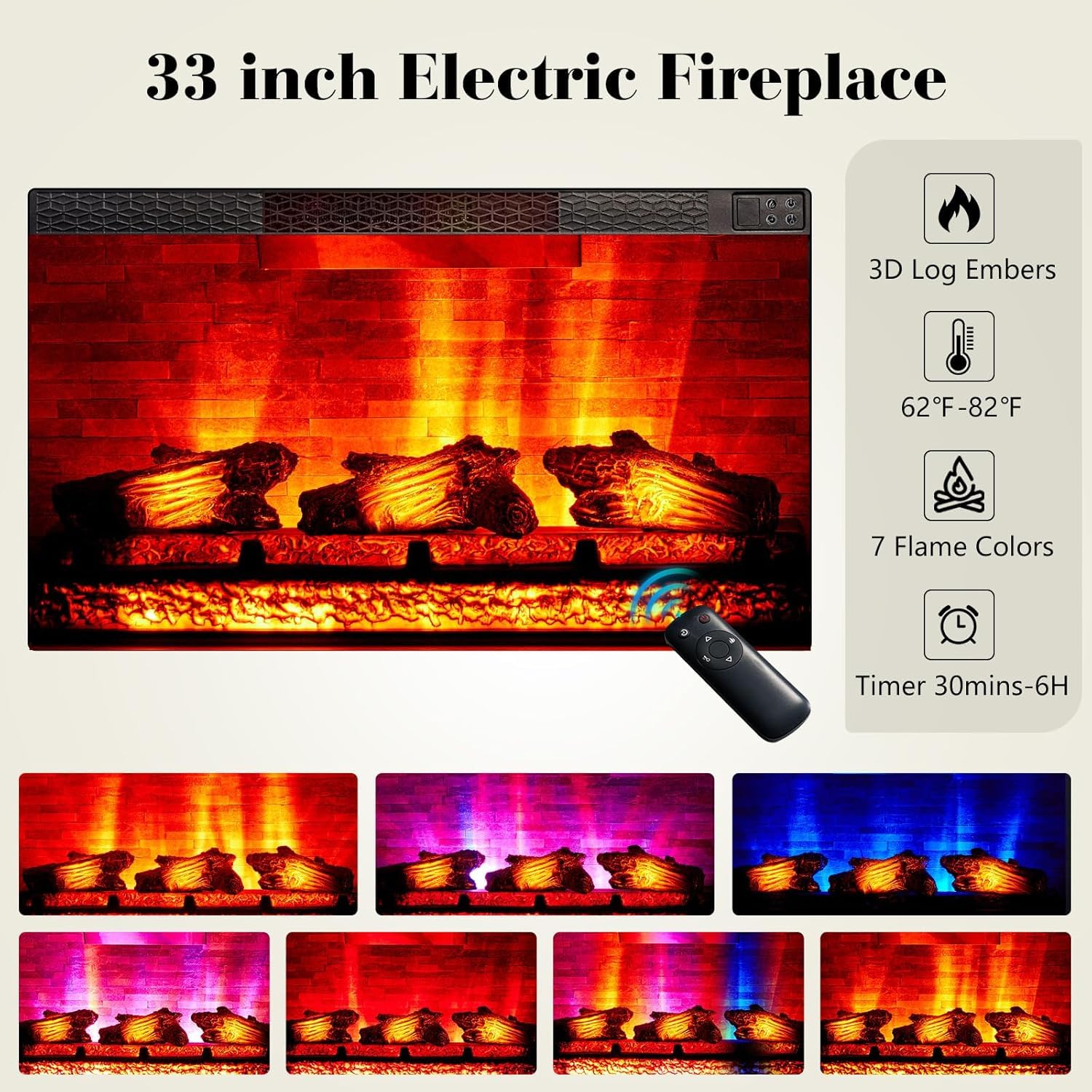 【Warm & Cozy】33" fireplace with a 3D log-like design, heating up to 400 sq. ft. With independently adjustable flames and temperature settings for year-round use. Overheat protection ensures safety for your family
