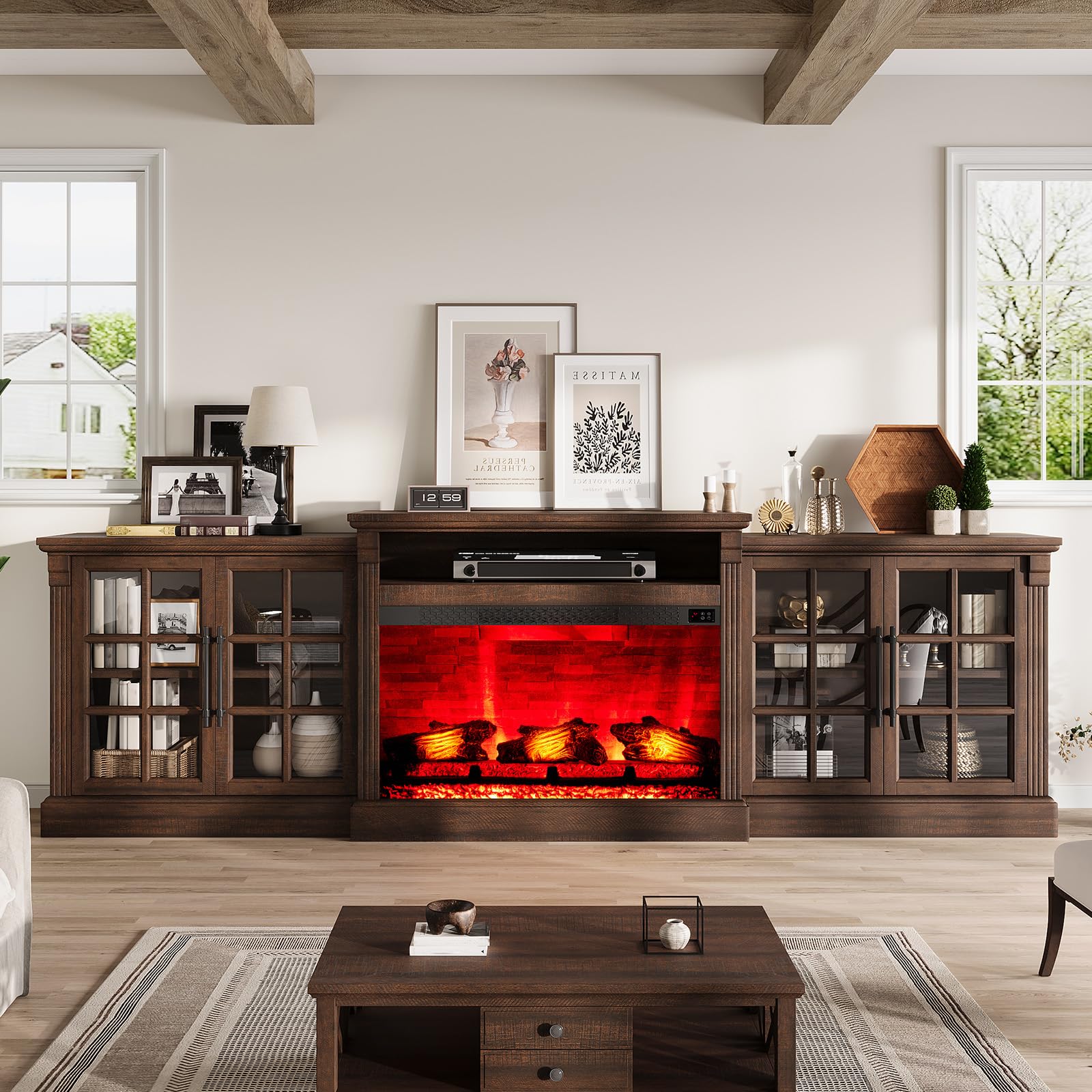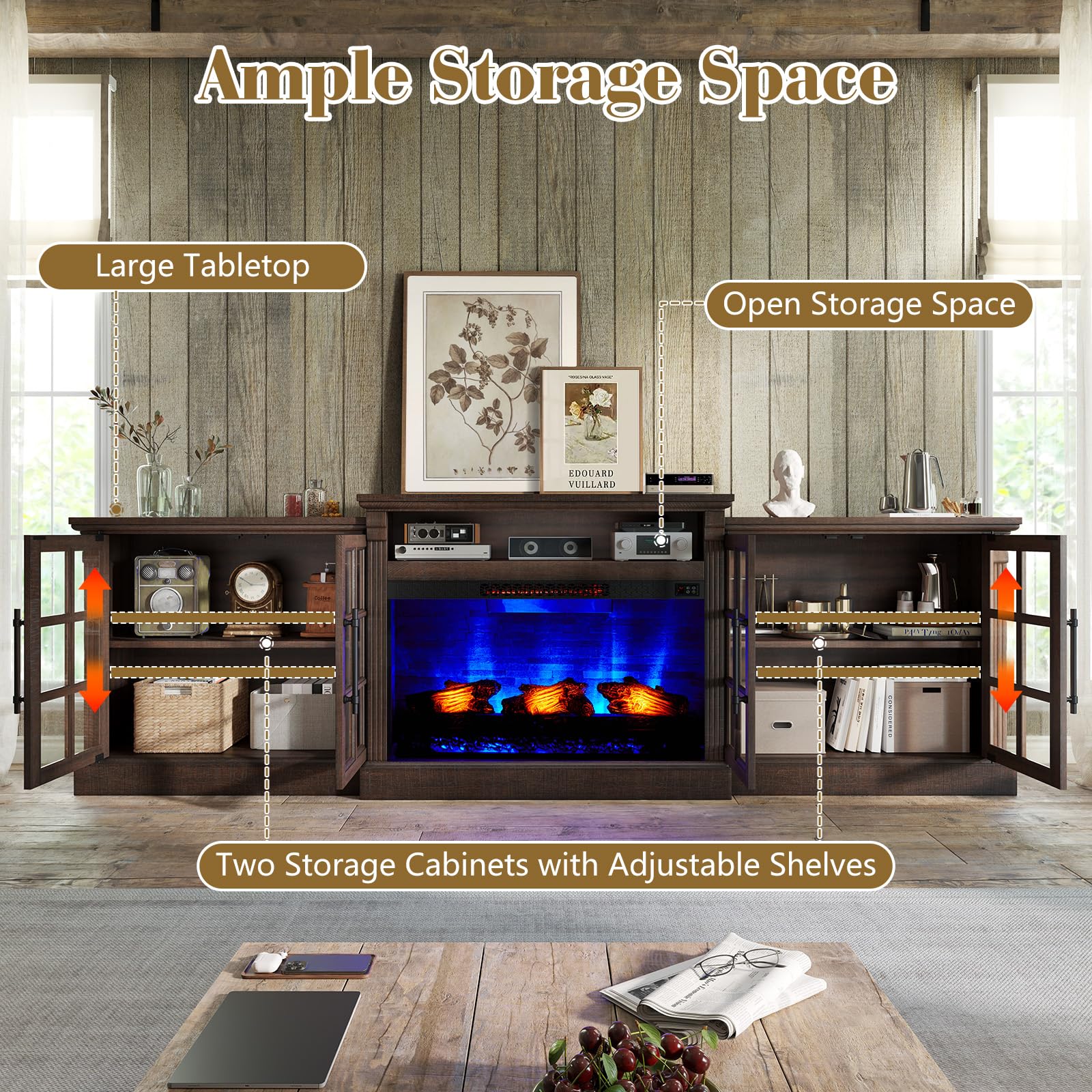 【Flexible & Ample Storage】TV console features an open cubby and two large glass-door cabinets for storing media, games, and more. Two adjustable shelves can be customized to suit your storage needs