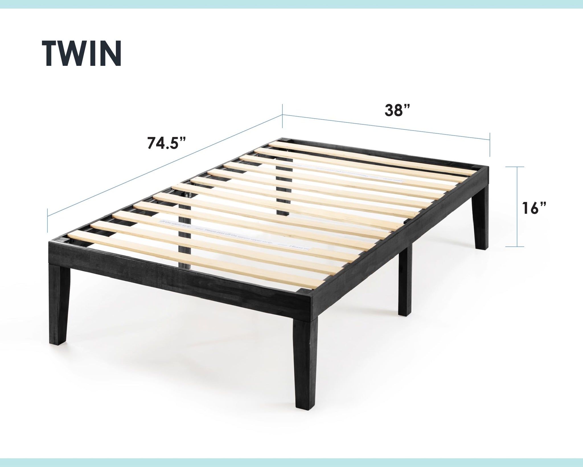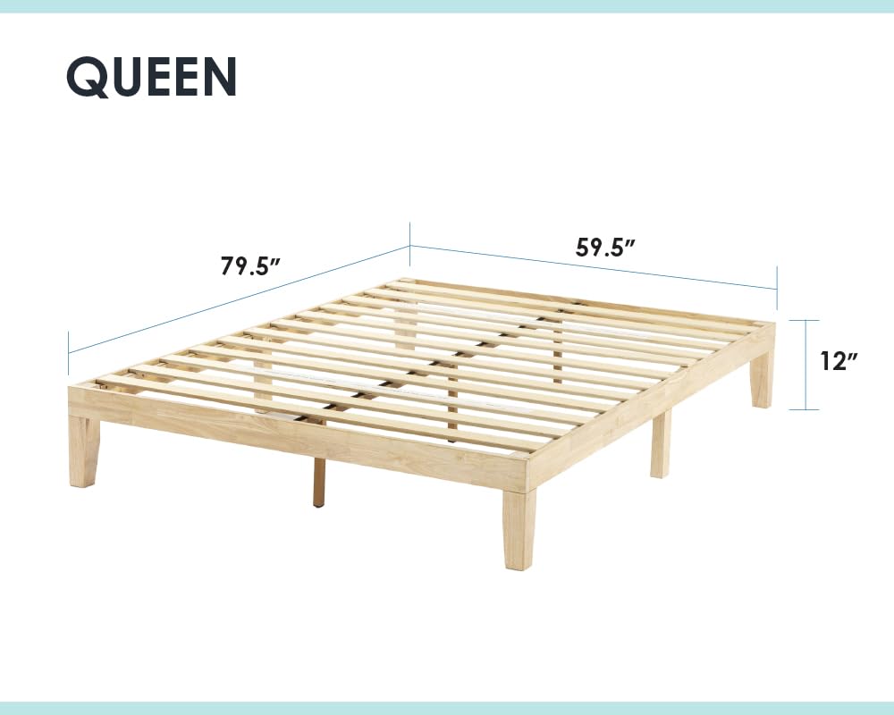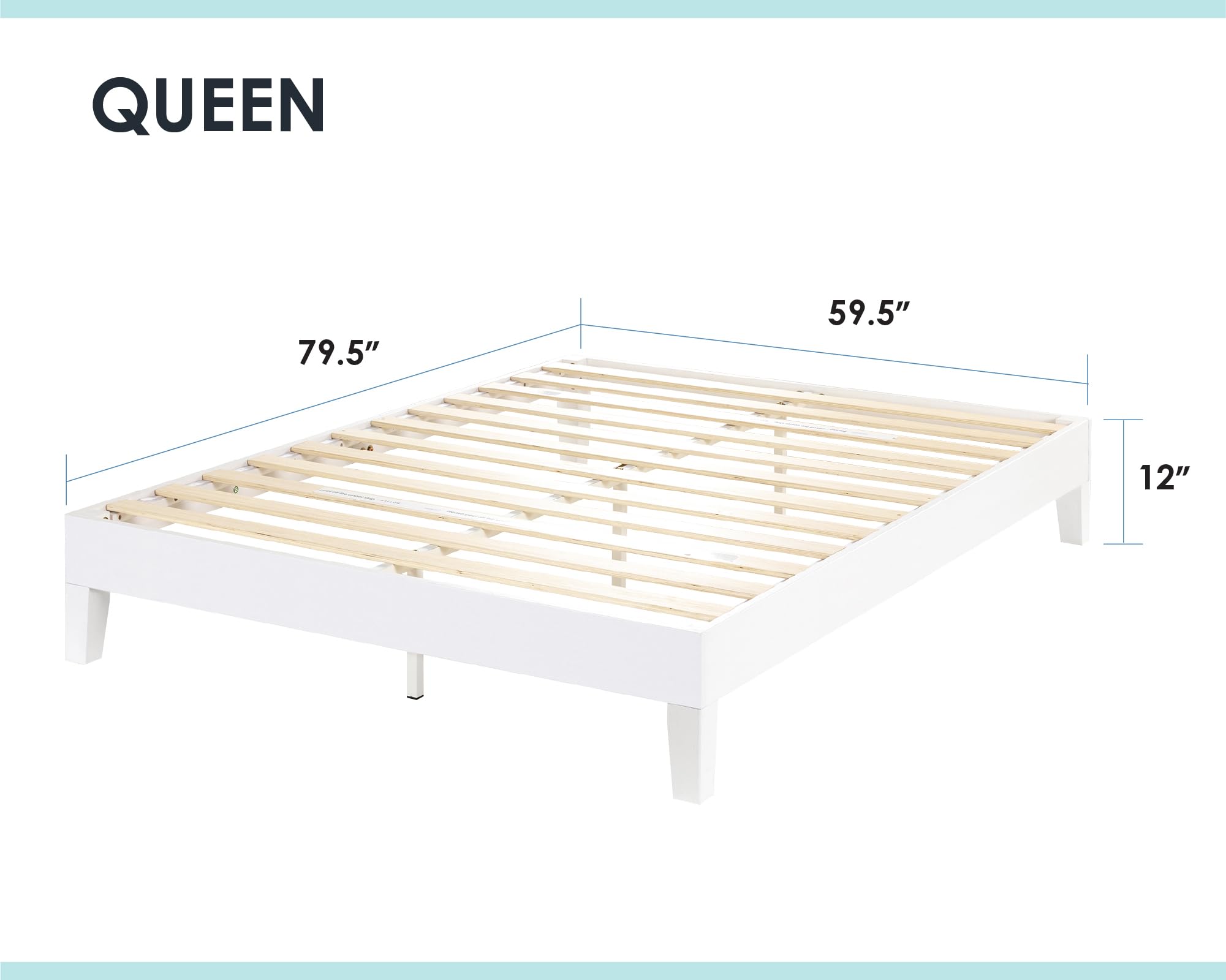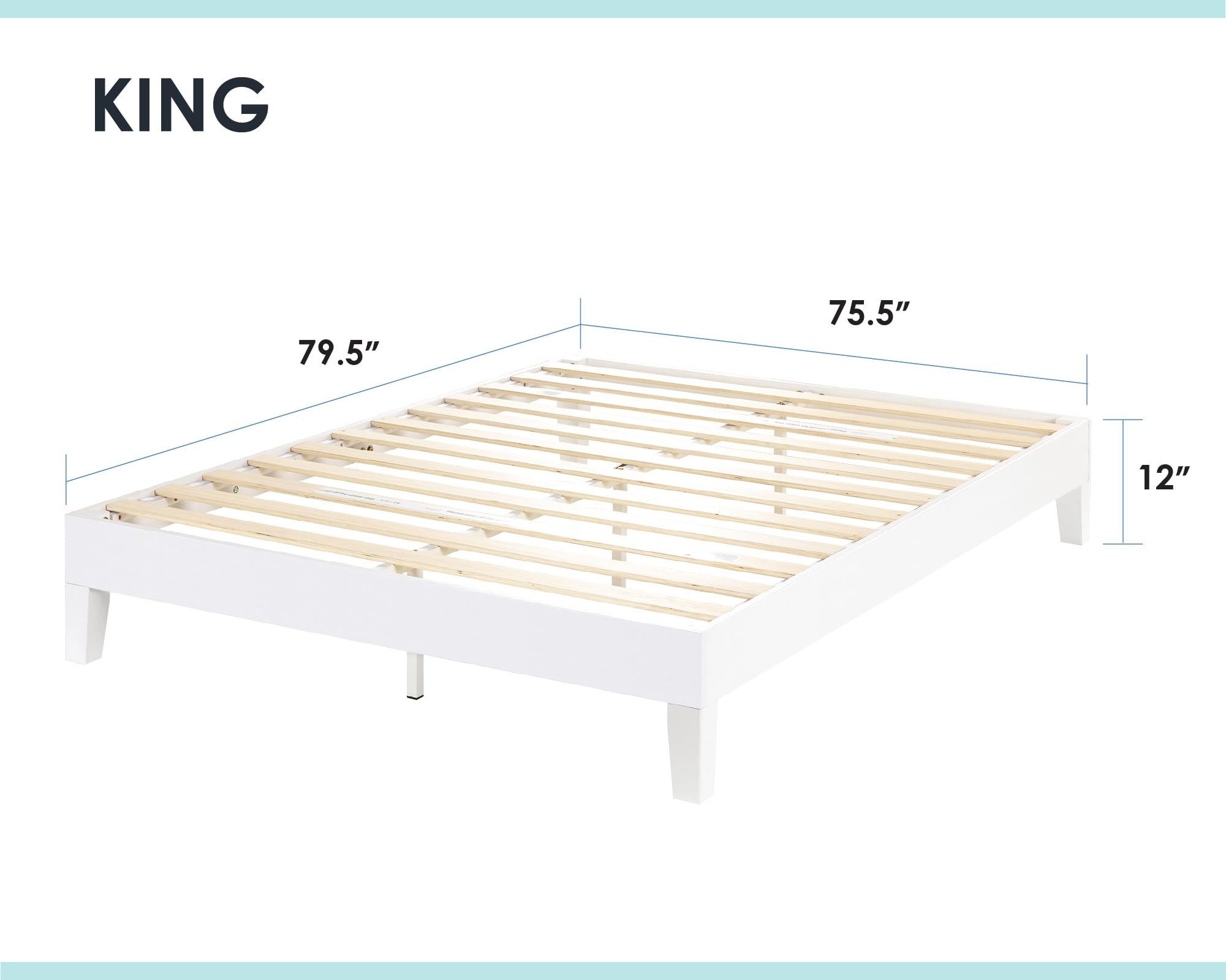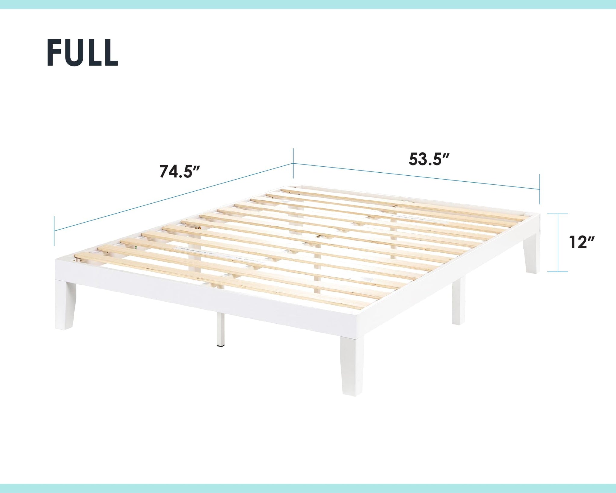 • Product dimensions – 74.5” L x 53.5” W x 12” H | Under bed clearance – 8.5” | Distance between slats – 3.5” | Evenly distributed weight limit – 1,500 lbs.