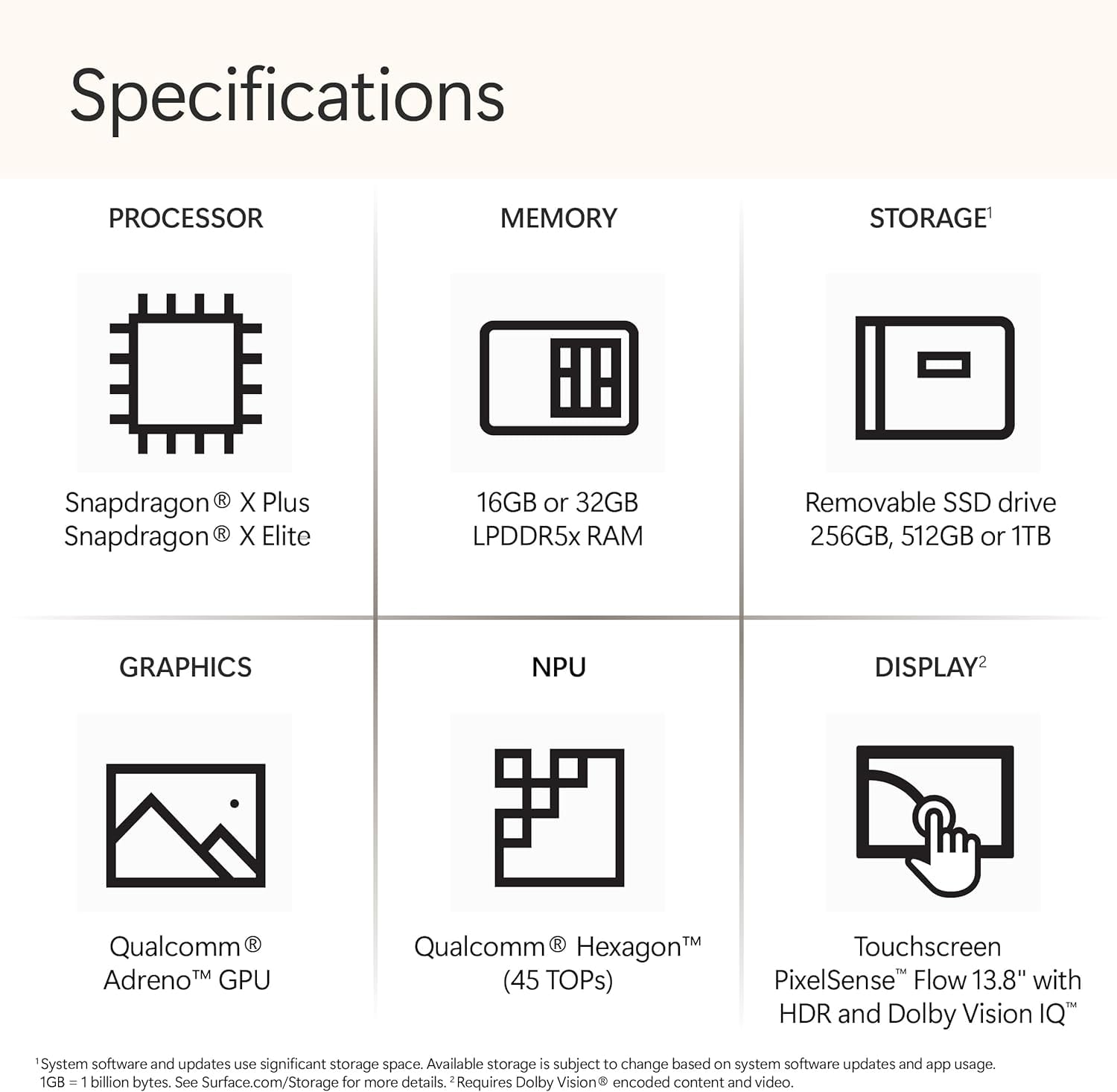 * Some Copilot+ PCs require download of free updates to run Copilot+ PC experiences, available starting late 2024 – 2025. See aka.ms/copilotpluspcs ** Pre-release screen shown; subject to change. *** Availability of Copilot+ PC features varies by device and market. [1] Based on Cinebench 2024 Multi-threaded conducted by Microsoft in April 2024 comparing pre-release build of Surface Laptop 13.8" and 15” with Snapdragon X Elite running pre-release Windows 11 26100 and Apple MacBook Air 13.6" and 15” with M3 running macOS 14 Sonoma. [2] Optimized for select languages (English, Chinese (simplified), French, German, Japanese, and Spanish. Content-based and storage limitations apply. Recall is coming soon through a post-launch Windows Update. See https://aka.ms/copilotpluspcs. [3] Colors available on selected models only. Available colors, sizes, finishes, and processors may vary by store, market, and configuration. [4] Surface Laptop, excluding power supply, contains a minimum of 25% recycled content. Based on validation performed by Underwriter Laboratories, Inc. using Environmental Claim Validation Procedure for Recycled Content, UL 2809-2, Second Edition, November 7, 2023. [5] Currently supports translation for video and audio subtitles into English from 40+ languages. See https://aka.ms/copilotpluspcs. [6] Battery life varies significantly based on device configuration, usage, network and feature configuration, signal strength, settings and other factors. See aka.ms/SurfaceBatteryPerformance for details. [7] 13.8" Surface Laptop comes with 39 W Surface power supply. Fast charging (from 5% to 80%) is supported with minimum 65W Surface power supply or USB-C® PD charger, sold separately. Testing was conducted at Microsoft in February 2024, using pre-production devices, software, and minimum of 65W USB-C® charger under controlled conditions. The device was powered on to the desktop screen with default display brightness settings. Actual charge time will vary based on operating conditions. Measured at typical office ambient temperature of 23C. [8] Enclosure includes A Cover, C Bucket and D Cover. 100% recycled aluminum alloy in A Cover and C Bucket. 100% recycled rare earth metals in magnets. Based on validation performed by Underwriter Laboratories, Inc. using Environmental Claim Validation Procedure (ECVP) for Recycled Content, UL 2809-2, Second Edition, November 7, 2023. [9] Enclosure includes A Cover, C Bucket and D Cover. Based on validation performed by Underwriter Laboratories, Inc. using Environmental Claim Validation Procedure for Recycled Content, UL 2809-2, Second Edition, November 7, 2023. [10] Available colors may vary by market. [11] USB-C® port does not charge your Surface device or any device that requires more than 15W [12] Requires device with USB-C® USB4®/Thunderbolt™ 4 port and when supported by device and display. *Screens simulated; subject to change *Recall: Optimized for select languages (English, Chinese (simplified), French, German, Japanese, and Spanish.) Content-based and storage limitations apply. See [https://aka.ms/copilotpluspcs]. *Cocreator: Optimized for English text prompts See [https://aka.ms/copilotpluspcs]