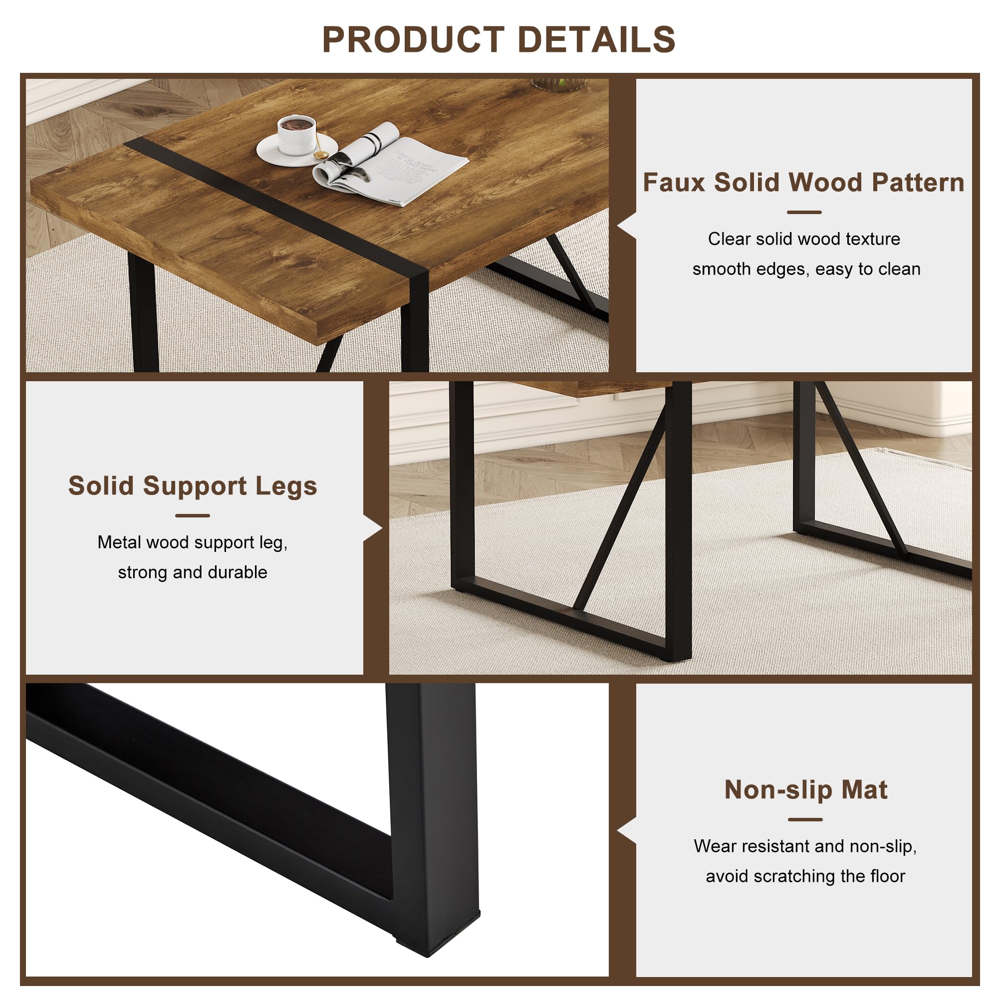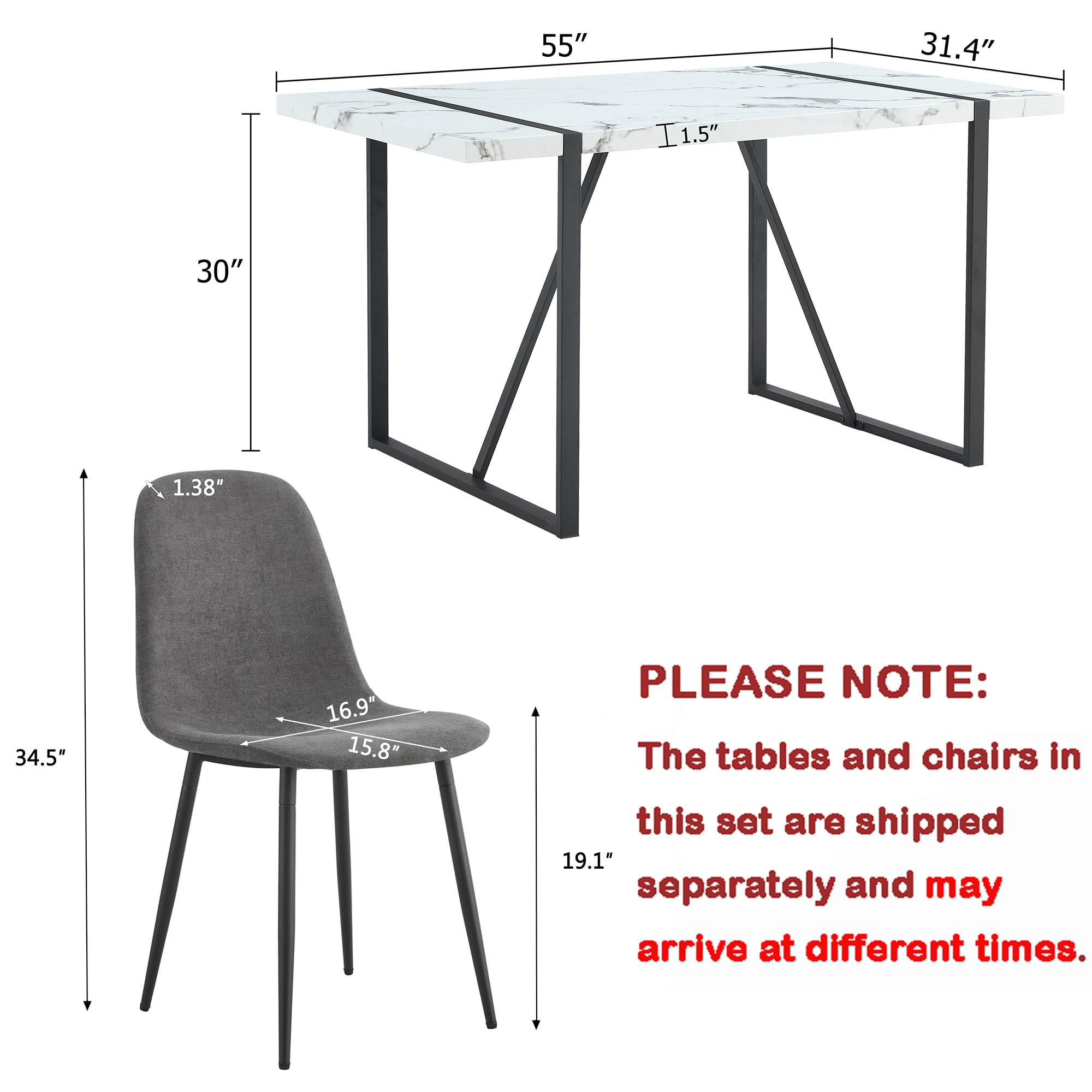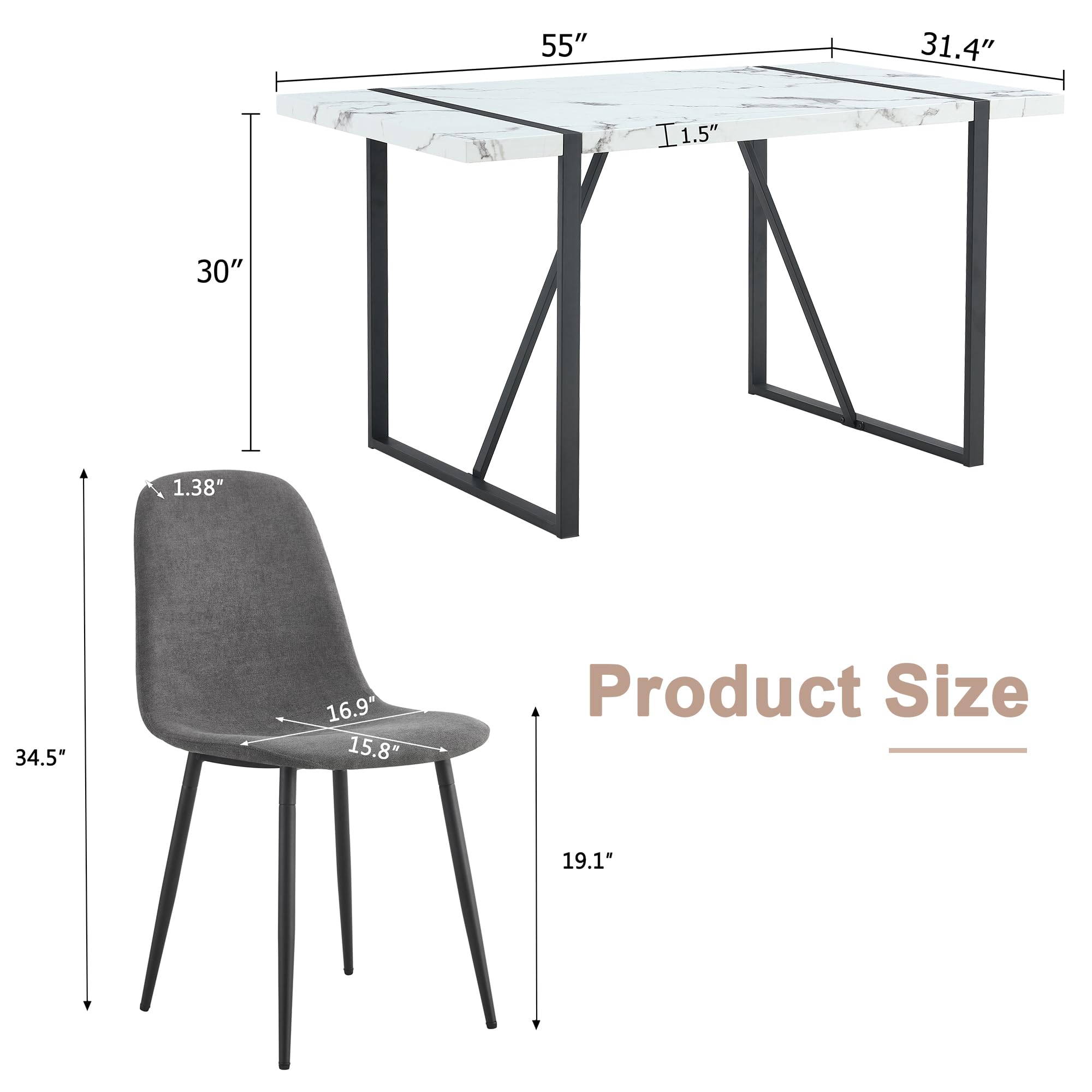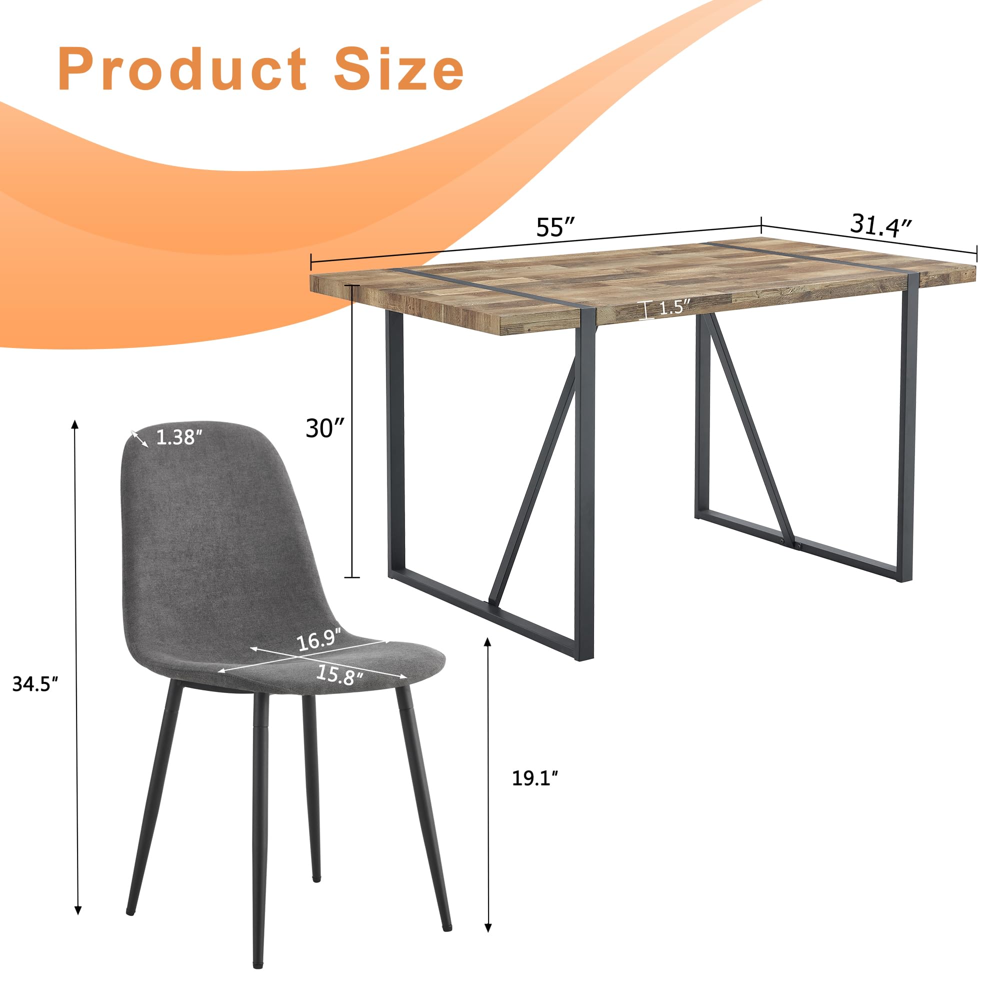 Space-Saving Design: Table Size: 55''(W)*31.4''(D)*29.9''(H) Chair Size: 16.90''(D) x 15.80''(W) x 34.50''(H). Perfect for cozy dining spaces, this set is designed to maximize your room's potential without sacrificing style or functionality. It comfortably seats four, making it ideal for family dinners or gatherings with friends