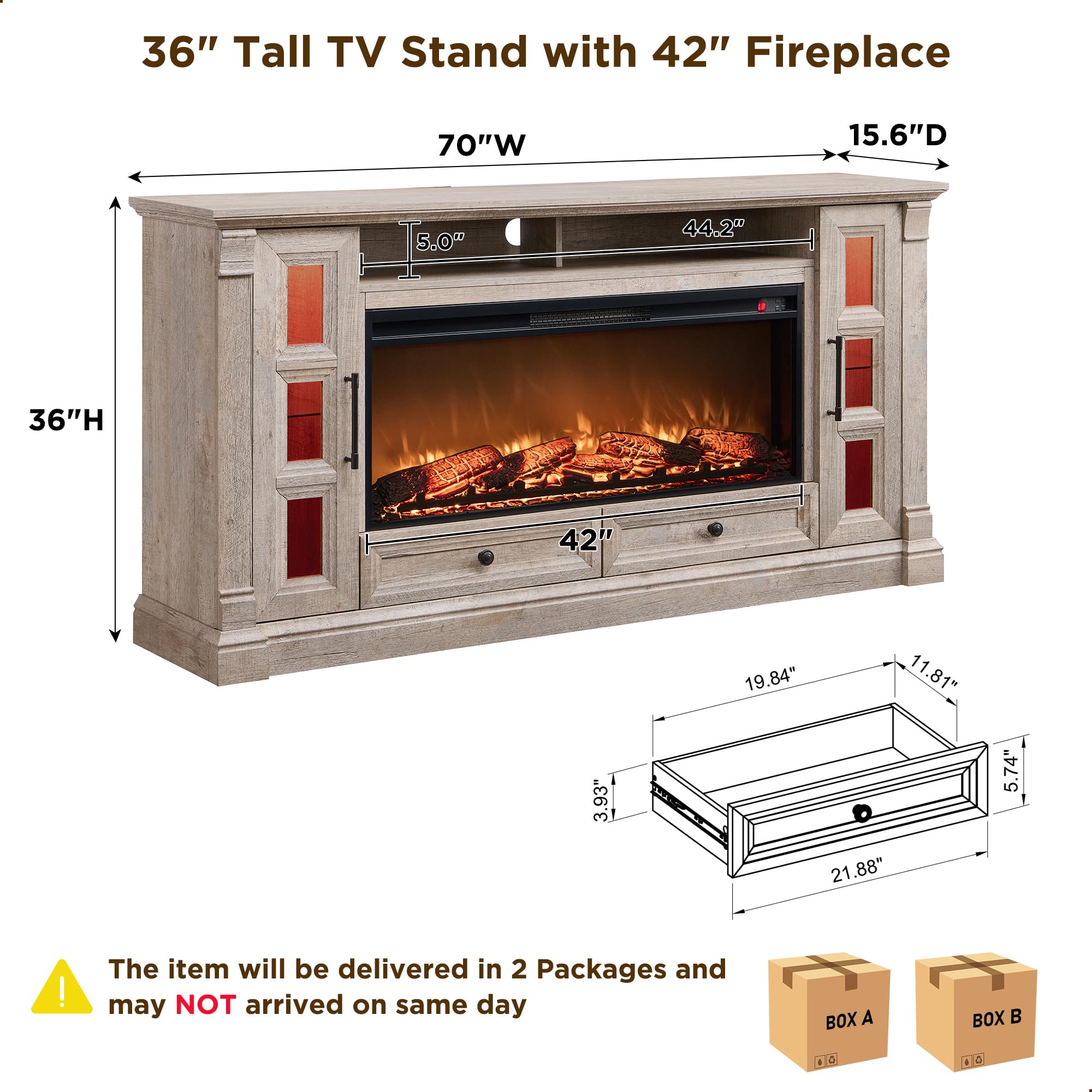 OKD Fireplace TV Stand for up-to-80 TV, Farmhouse 36" Tall Entertainment Center with 42" Electric Fireplace, Media Console with Glass Door Cabinets & Drawers for Living Room, Antique White