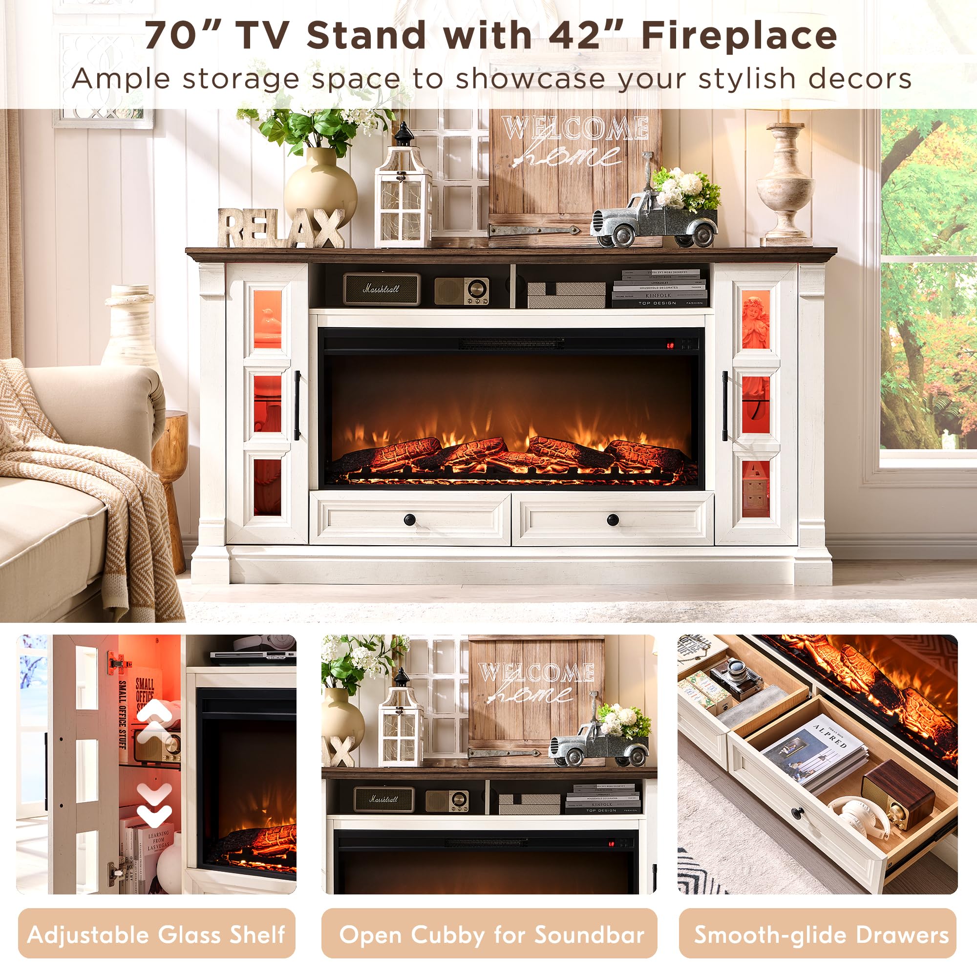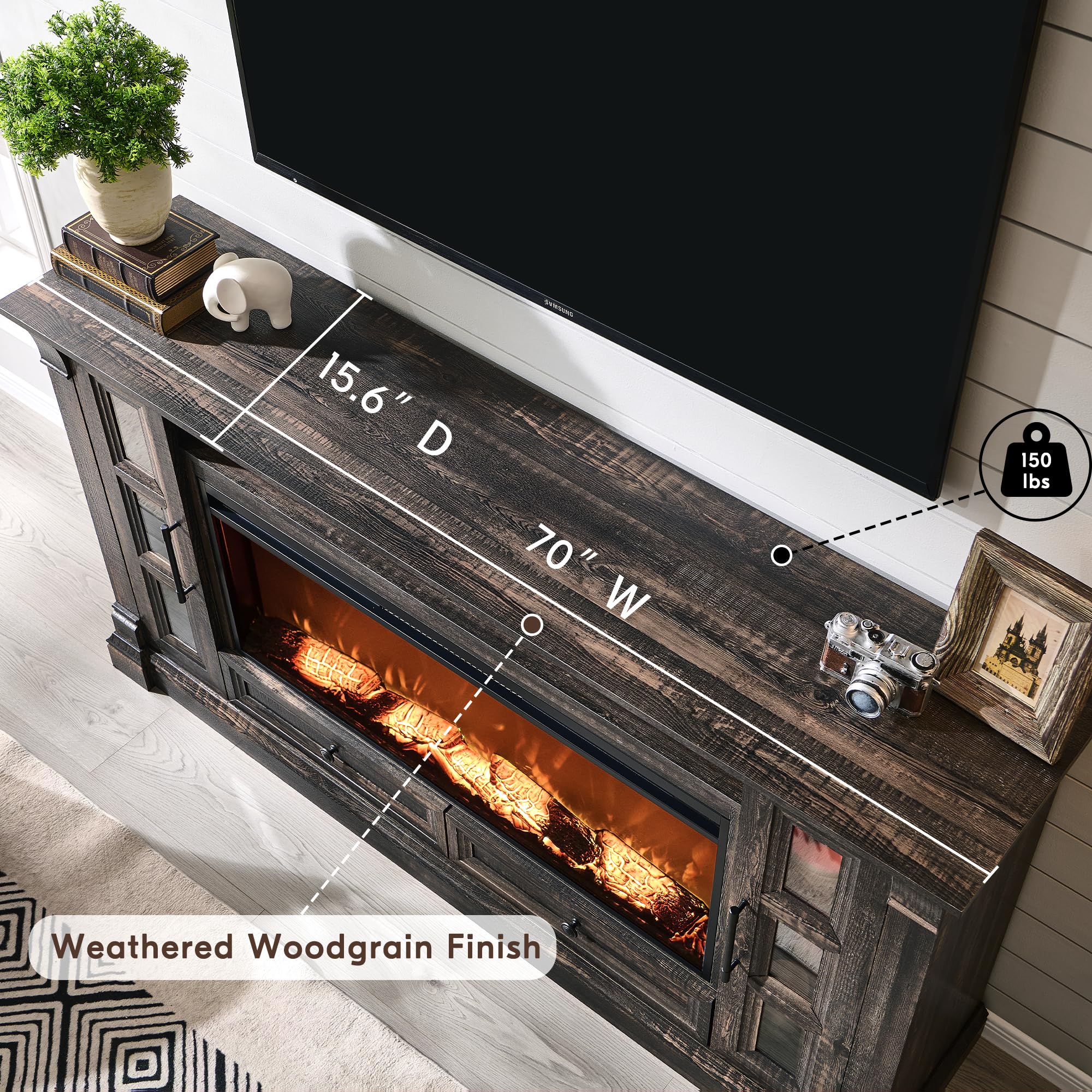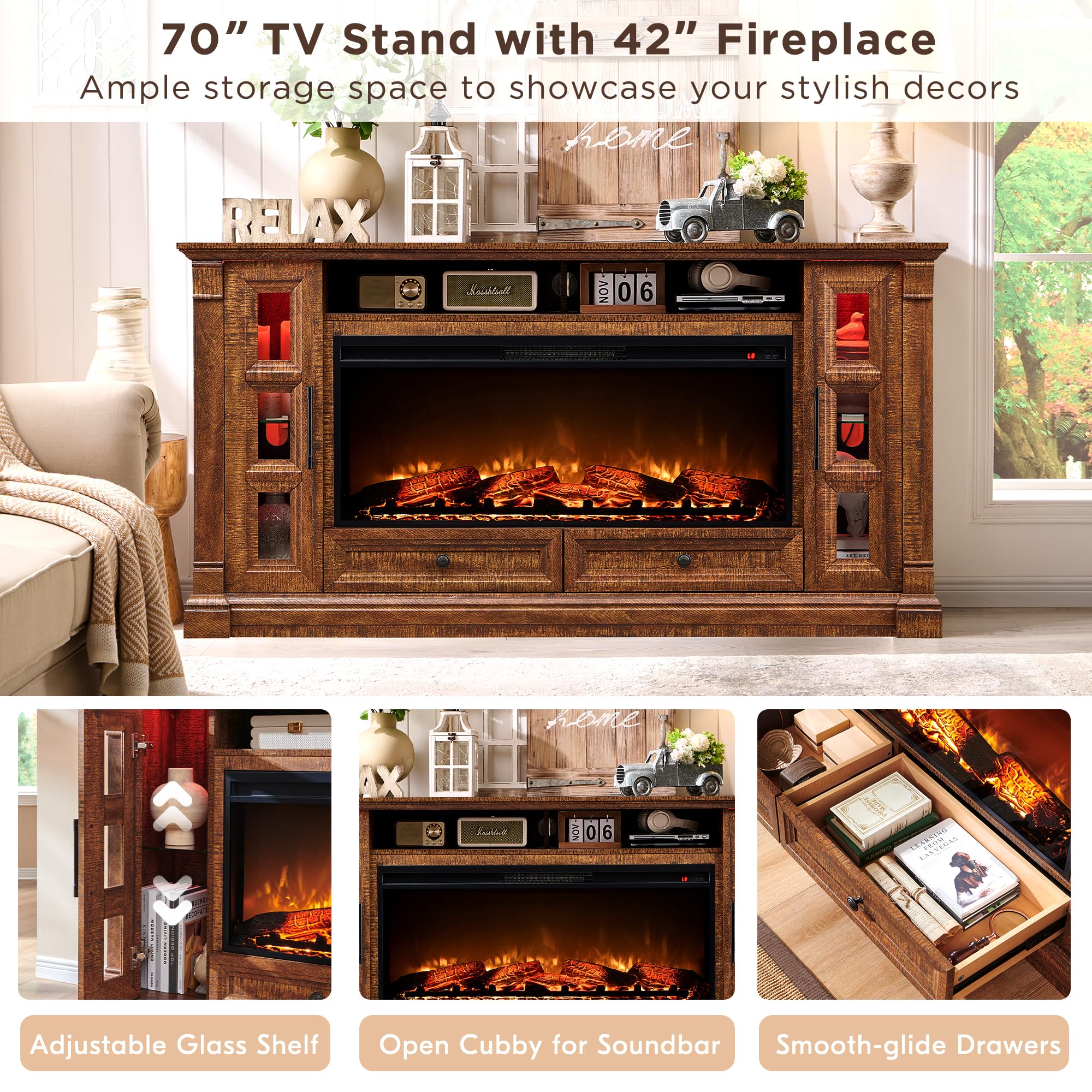 [Rustic Elegance for Your Space]: This 70" fireplace TV stand is your dream room retreat. Decorative corbels and framed fronts with clear glass inset add refinement. The antiqued aesthetic blends with a weathered distressed wood finish for added charm. Enhancing the experience, paired with an upgraded 42" fireplace brings a touch of warmth and beautiful ambiance to your living room. An infusing embodiment of beauty and practicality in your home, it'll entice everyone