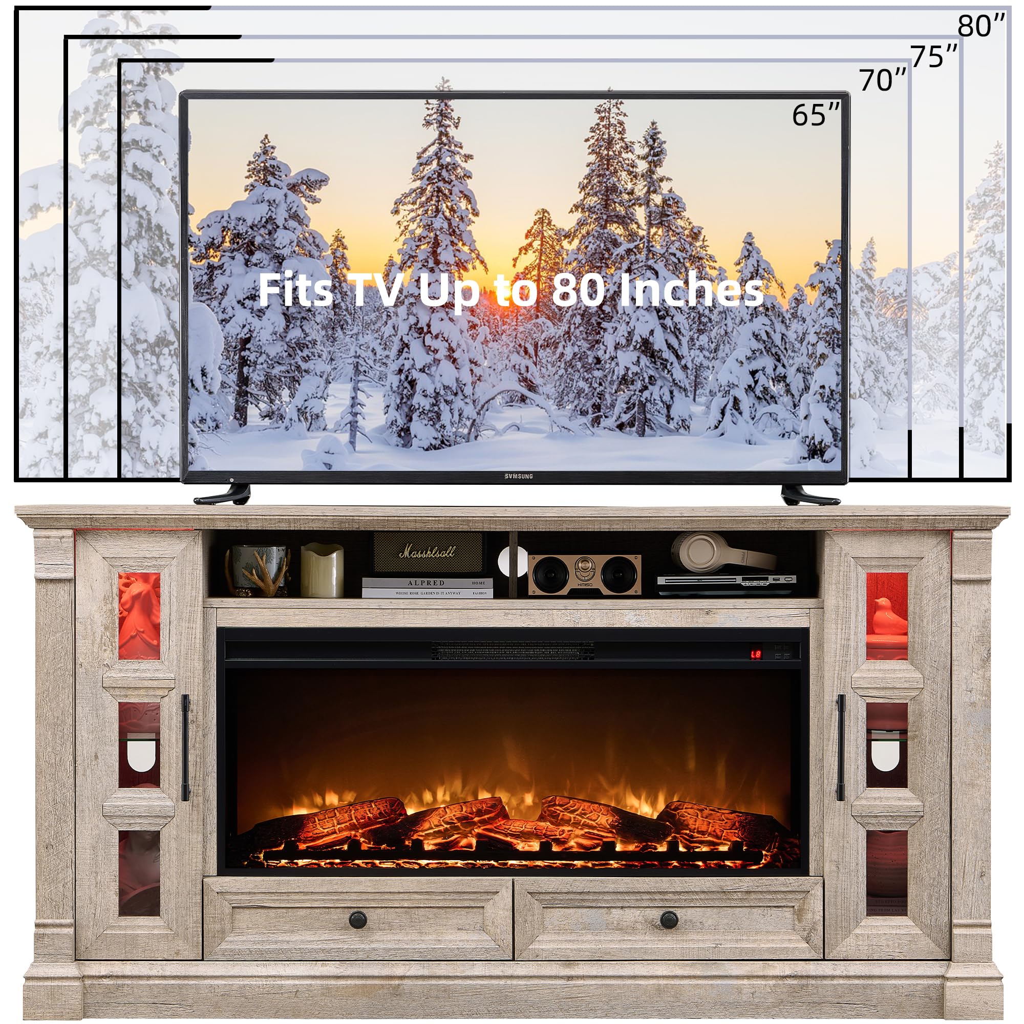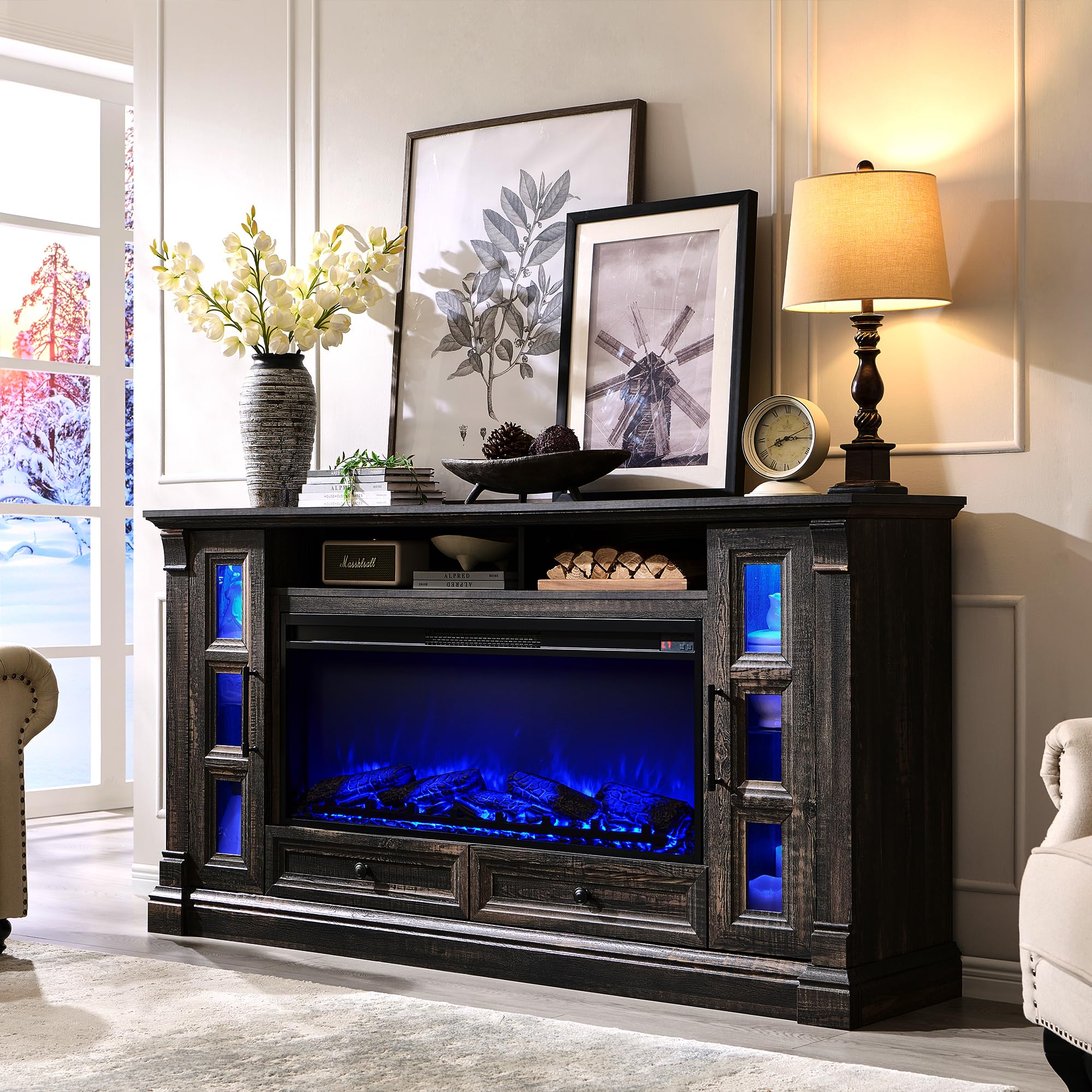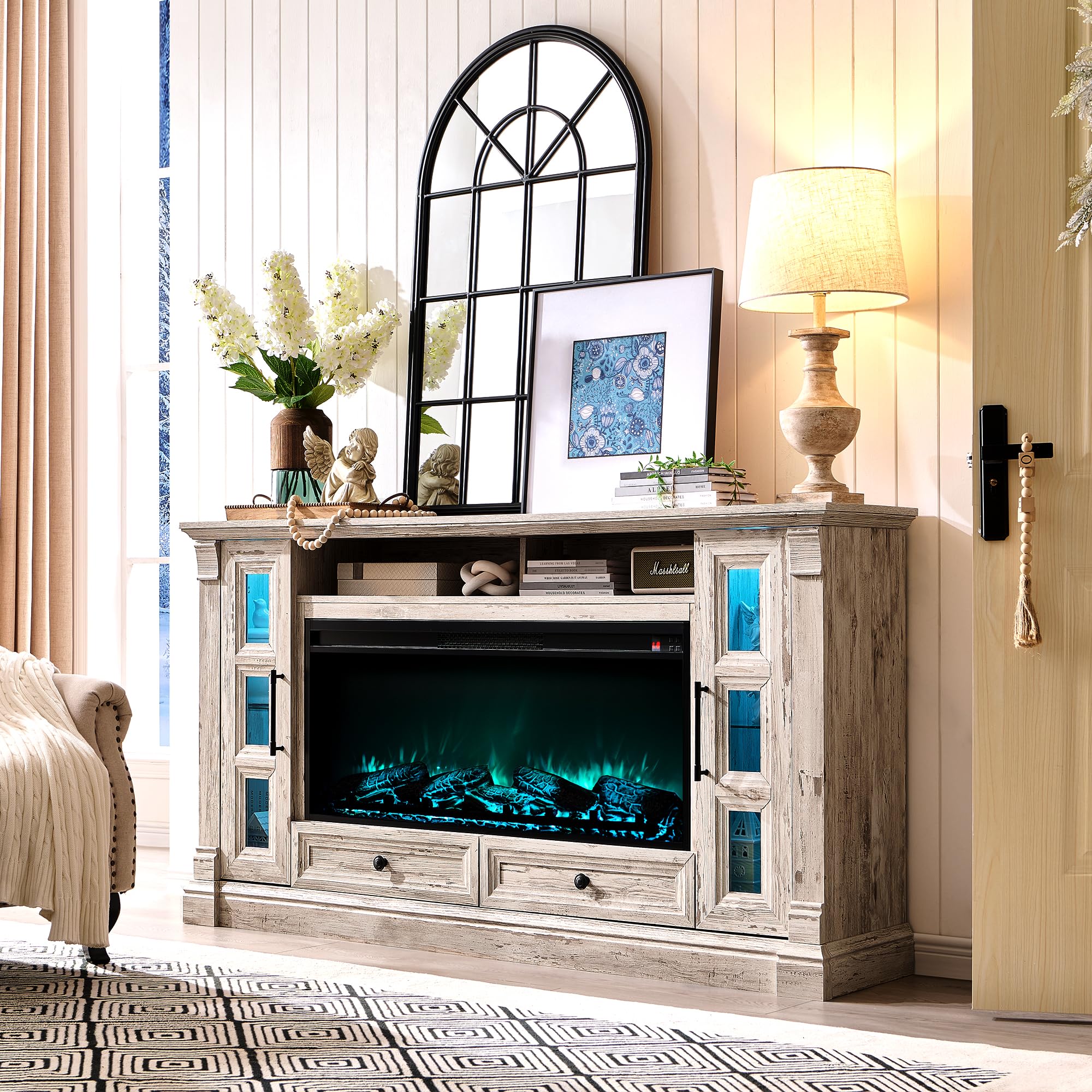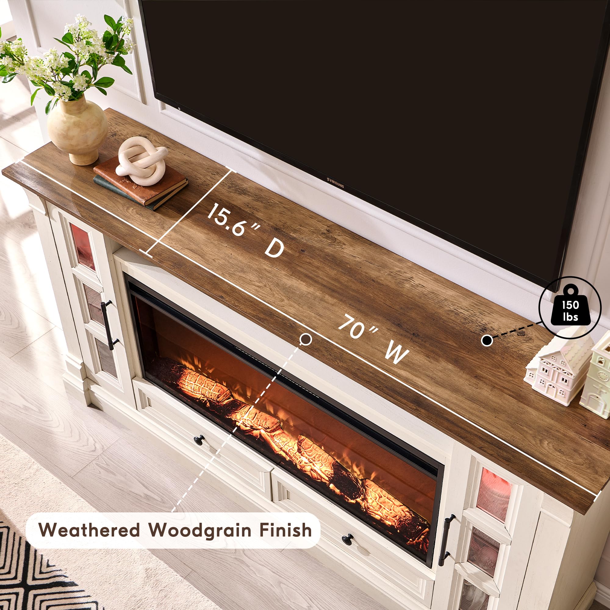 [Rustic Elegance for Your Space]: This 70" fireplace TV stand is your dream room retreat. Decorative corbels and framed fronts with clear glass inset add refinement. The antiqued aesthetic blends with a weathered distressed wood finish for added charm. Enhancing the experience, paired with an upgraded 42" fireplace brings a touch of warmth and beautiful ambiance to your living room. An infusing embodiment of beauty and practicality in your home, it'll entice everyone