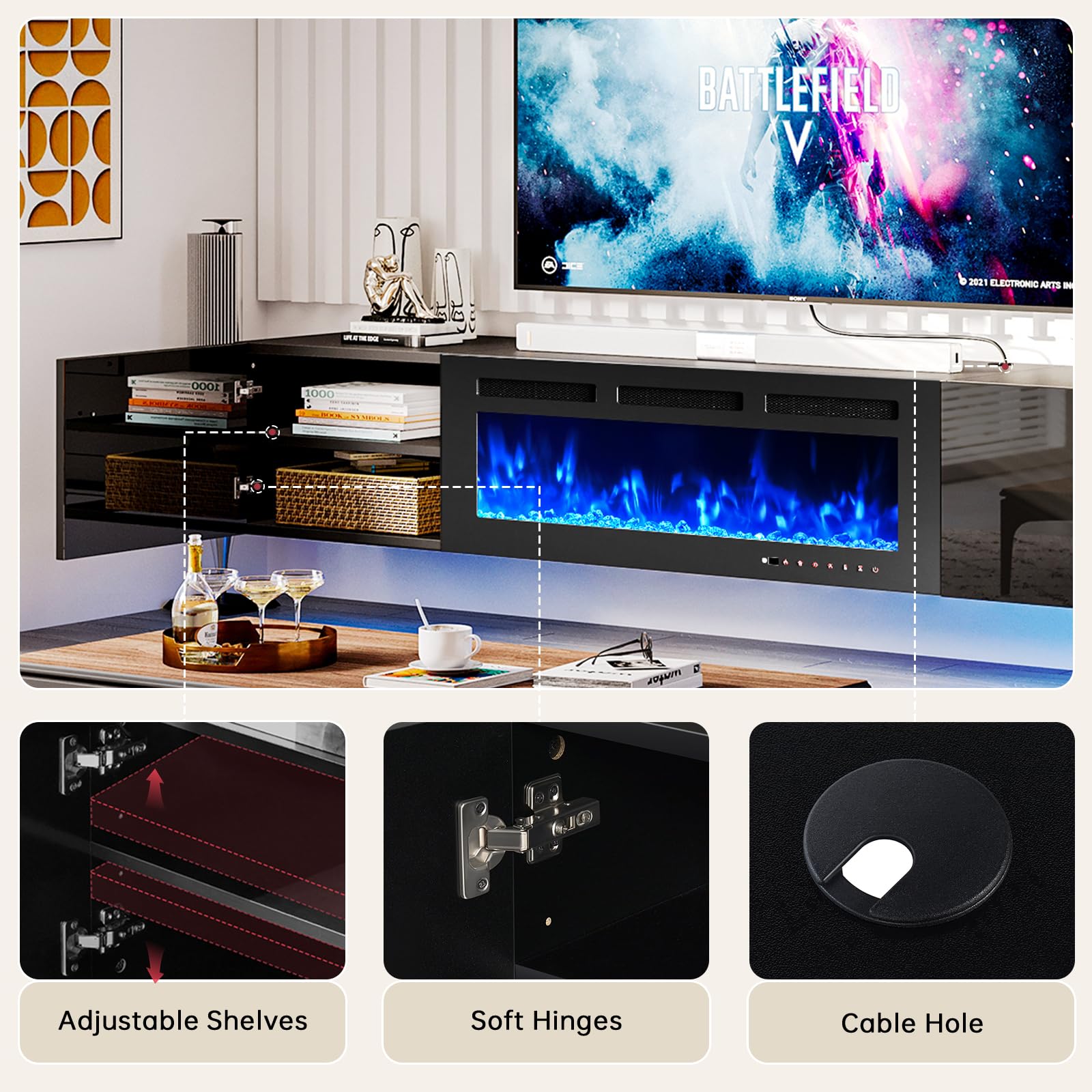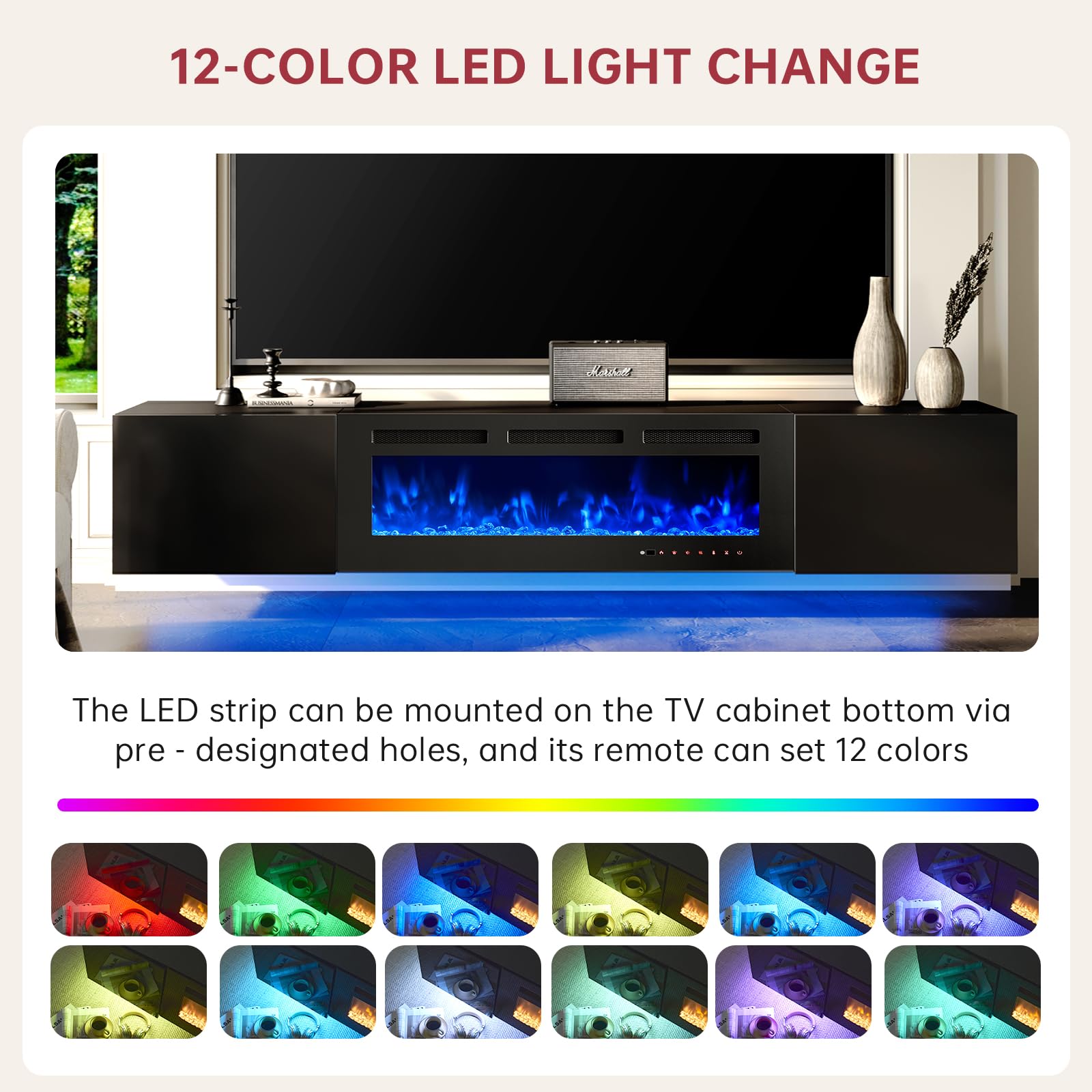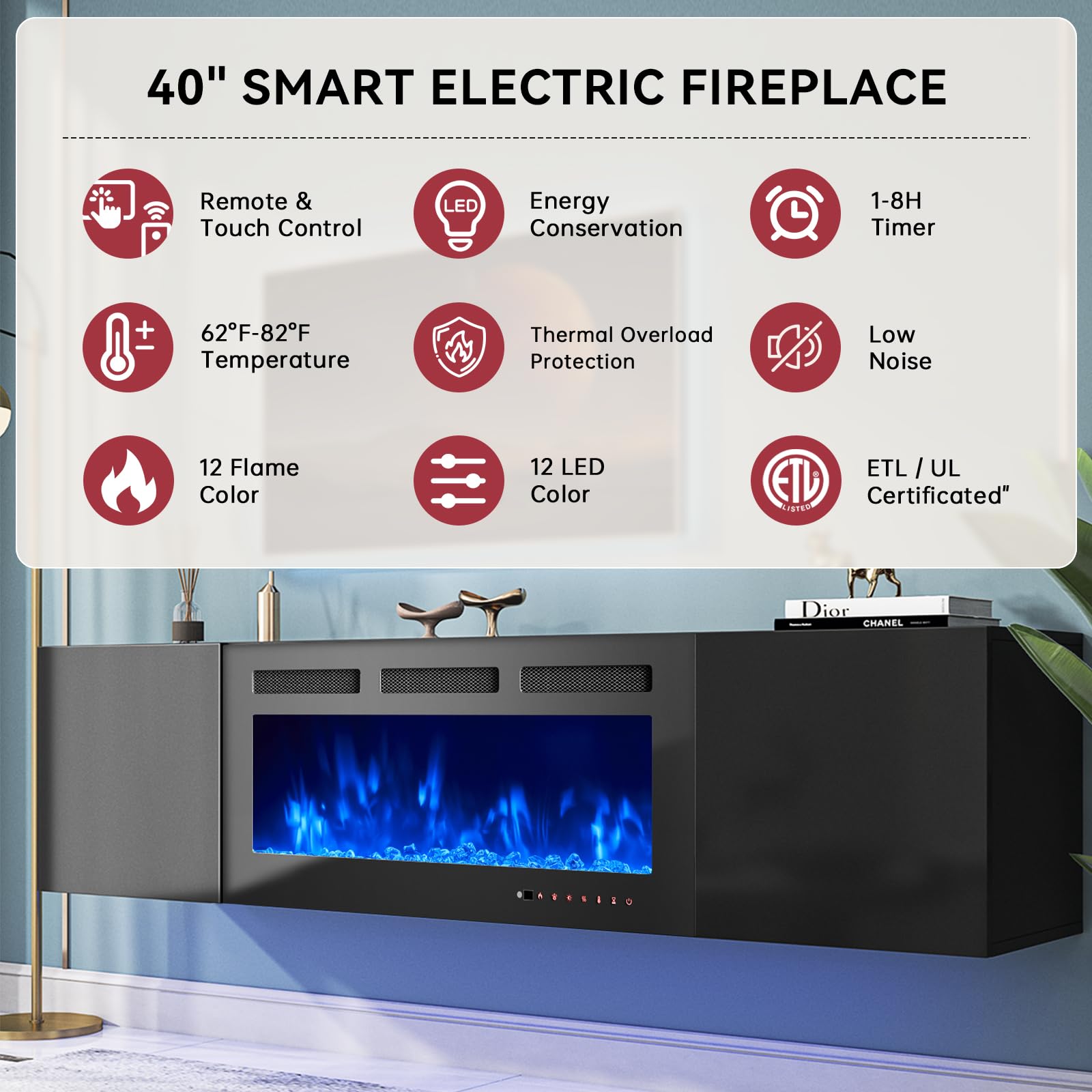 oneinmil 70" Floating TV Stand with 36" Electric Fireplace, Wall Mounted Fireplace Entertainment Center with Storage, Fire Place TV Console for Living Room, All Black