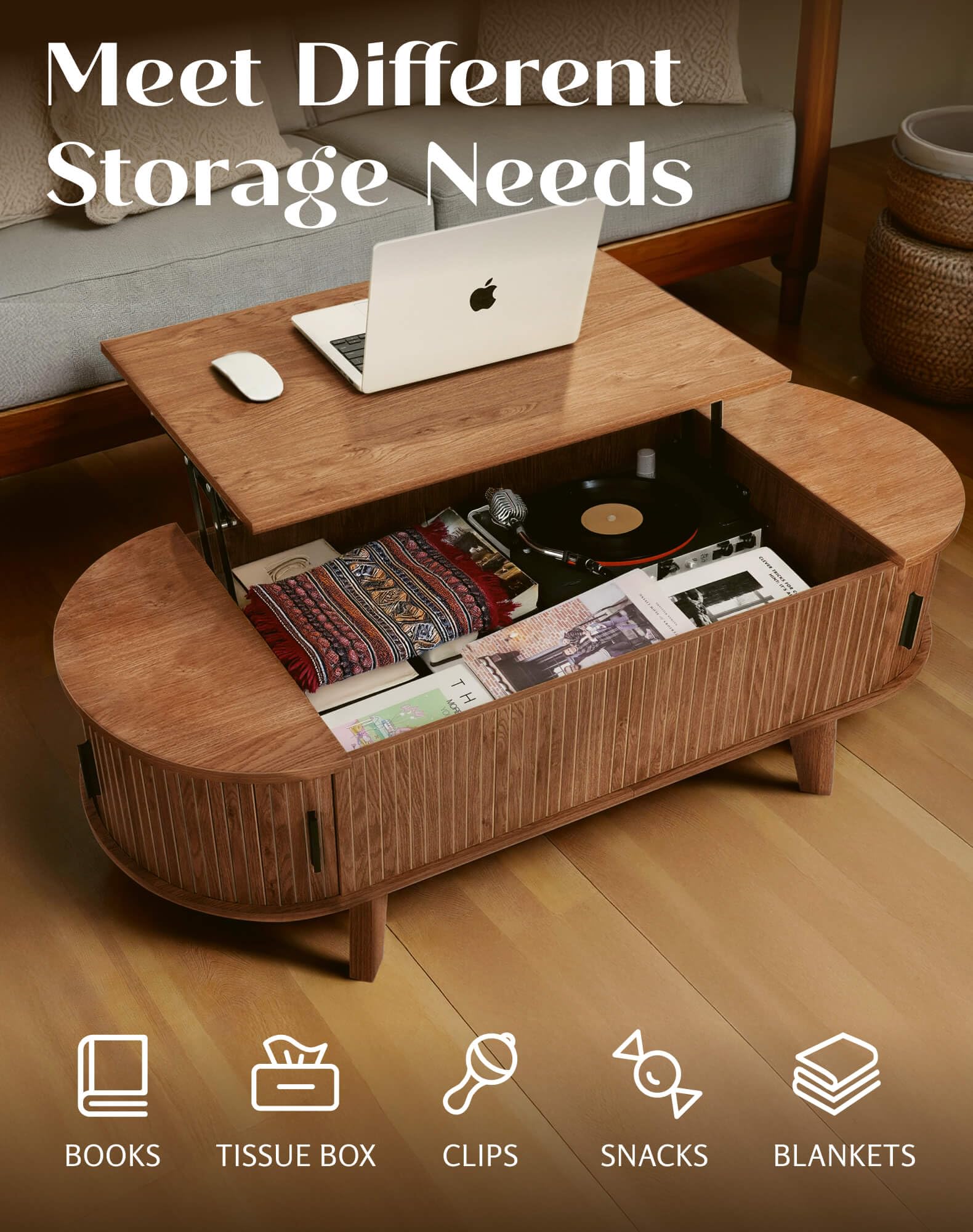Pruchant Oval Lift Top Coffee Table with Storage, 47.2" Mid Century Modern Living Room Center Table with 180° Sliding Tambour Door, Wood Fluted Coffee Table for Home Office, Walnut