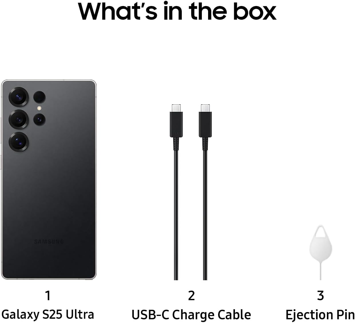 | whats in the box | Quick Start Guide, SIM Tray Ejector, Samsung Galaxy S25 Ultra, Stylus, USB Cable |