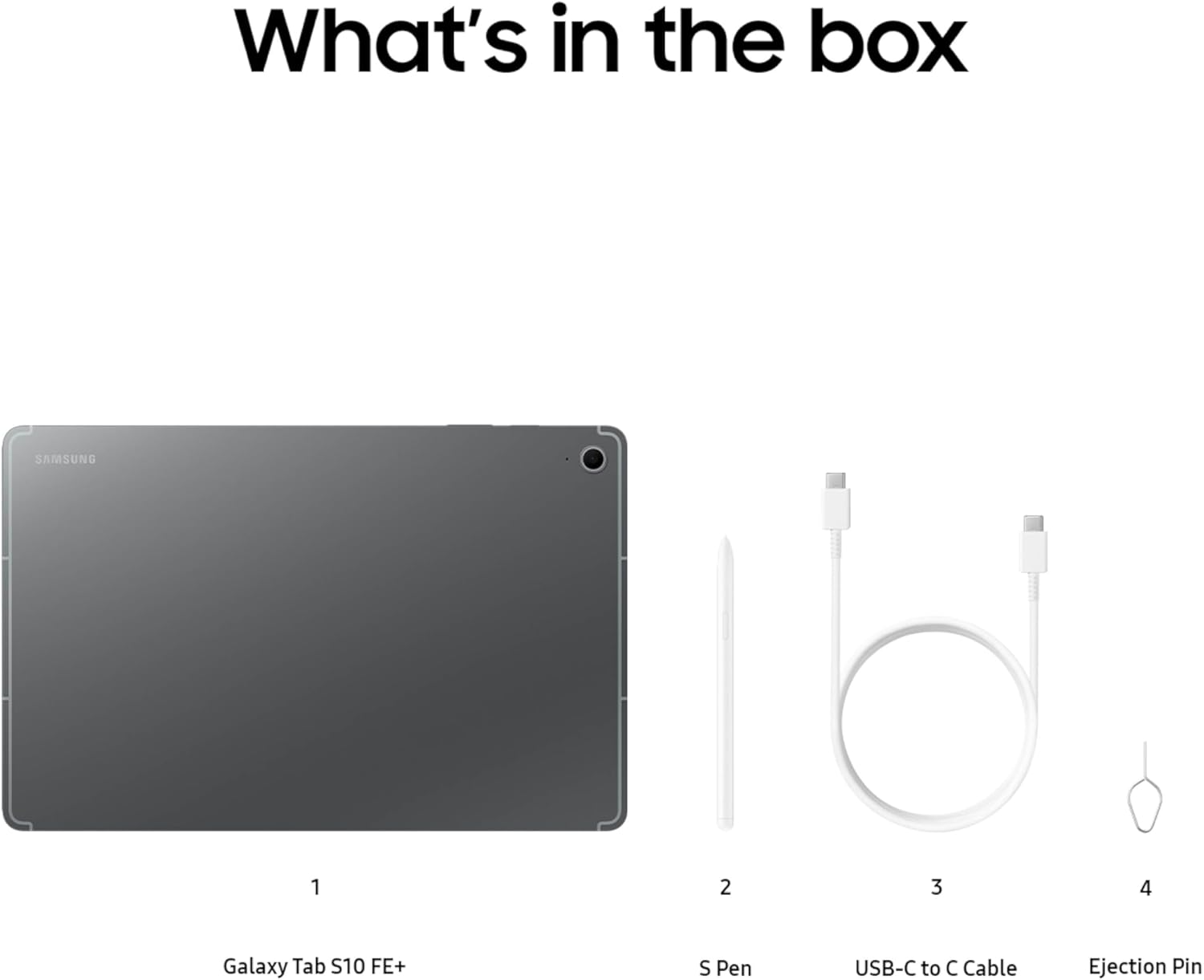 Step up your tablet game with Galaxy Tab S10 FE+. The expansive 13.1” screen¹ brings your favorite content to life with stunning detail, whether you’re catching up on a new series, diving into your next creative project or staying on top of your to-do list. Need to look something up? Circle to Search with Google makes it easy.² Whether you see a stylish jacket in a music video or a mouthwatering dish on your feed, just circle it and let the answers come to you. Its durable IP68-rated design³ is ready for wherever the day takes you, while the included S Pen lets you write, draw and sketch with a natural, pen-on-paper feel. And with a long-lasting,⁴ fast-charging battery,⁵ you can stream, create and explore for hours without slowing down. Discover a tablet that fits your world with Galaxy Tab S10 FE+. ¹Compared to Galaxy Tab S9 FE+. Measured diagonally, the Galaxy Tab S10 FE+ screen size is 13.1” in the full rectangle and 13.0” accounting for the rounded corners. Actual viewable area is less due to the rounded corners. ²Works with compatible apps. Requires internet connection; results may vary by uniqueness, clarity and framing of circled image and related factors. Accuracy of results is not guaranteed. Google is a trademark of Google LLC. ³Consistent with IP68 rating, water resistant is up to 5 feet of water for up to 30 minutes. Rinse residue/dry after wet. ⁴Based on local, 720p resolution video playback, default video player (full screen), 162 nit brightness, earbud volume 7, Wi-Fi and mobile network off. Results vary with settings, usage and other factors. ⁵Requires 45W wall charger (sold separately). Use only Samsung-approved charger and USB-C cable. To avoid injury or damage to your device, do not use incompatible, worn or damaged batteries, chargers or cables.