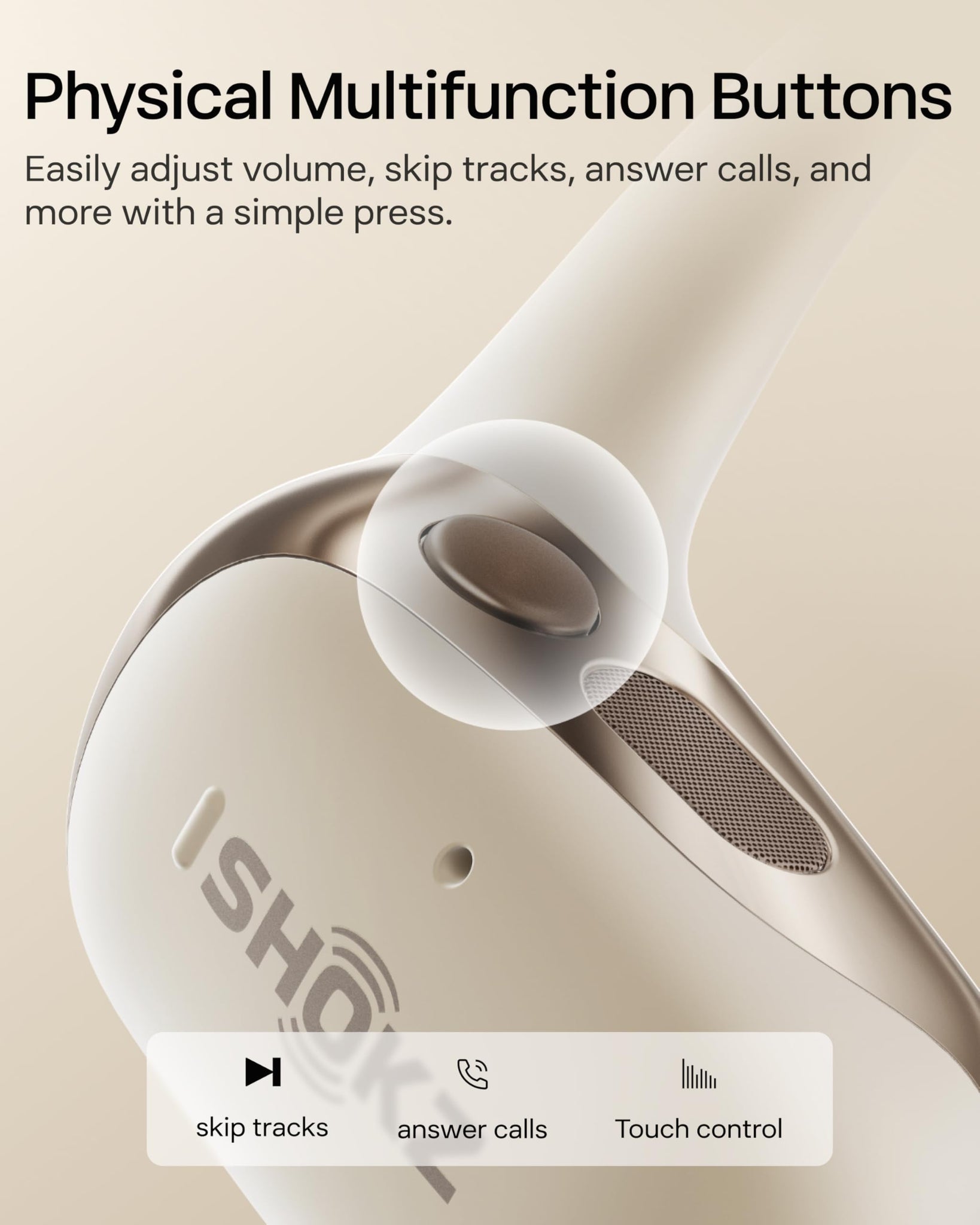 Customise the Way You Like OpenFit 2+ combines physical multifunction buttons with app-enabled customisation for easy, accurate control. Play, pause, adjust volume, or skip tracks with ease. Use the Shokz App to personalise button functions and EQ settings, ensuring your headphones respond exactly how you like in any situation.