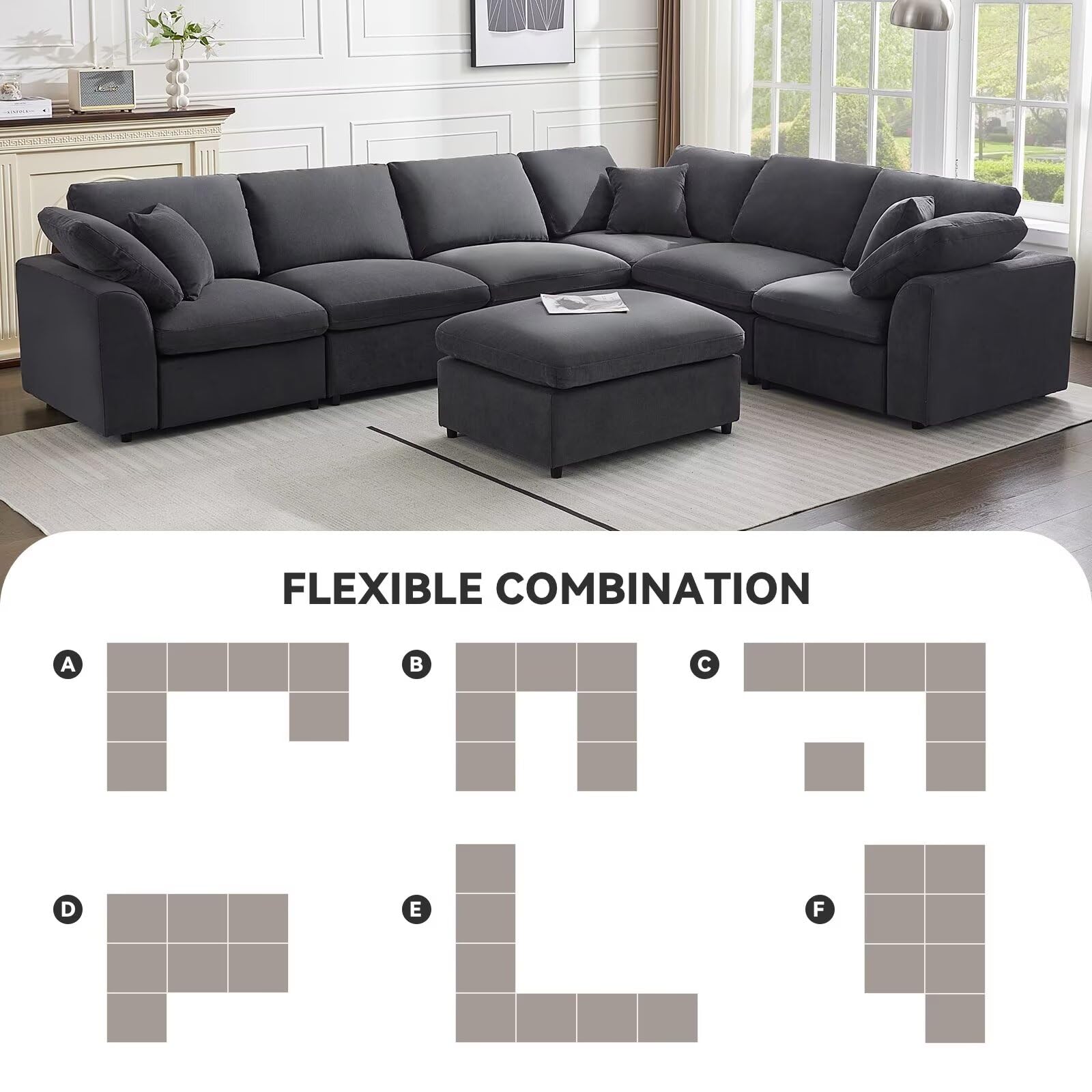 STURDY & DURABLE: Modern 7-seats sofa is built with reinforced wooden frames that ensure long-lasting durability. It will continue to provide lasting support and comfort for years to come. The living room furniture sets includes 3 corner chairs, 3 armless chairs, and 1 ottoman.