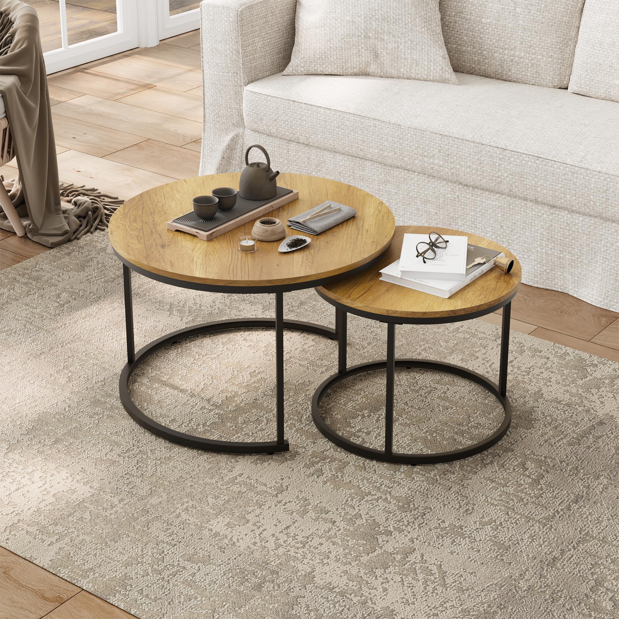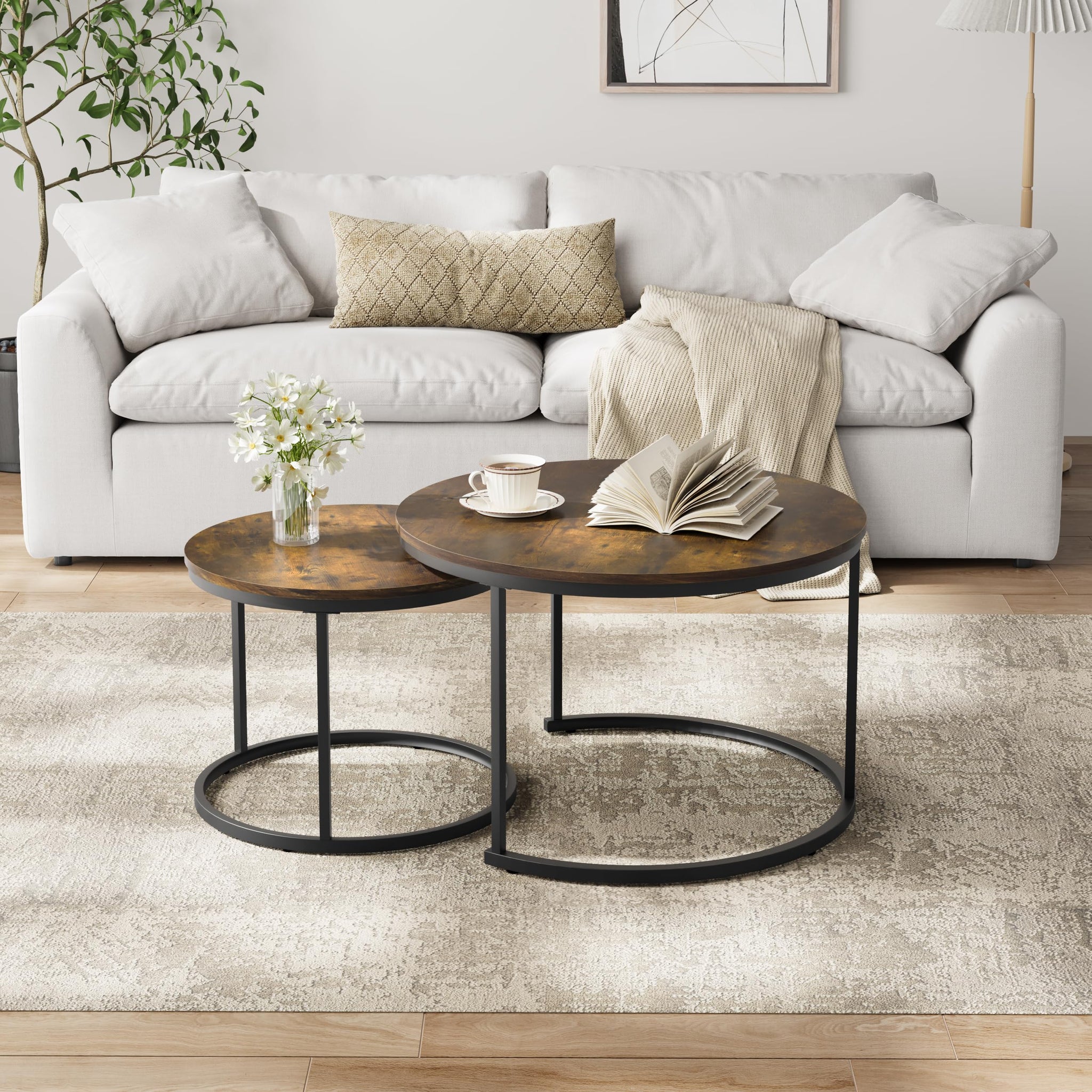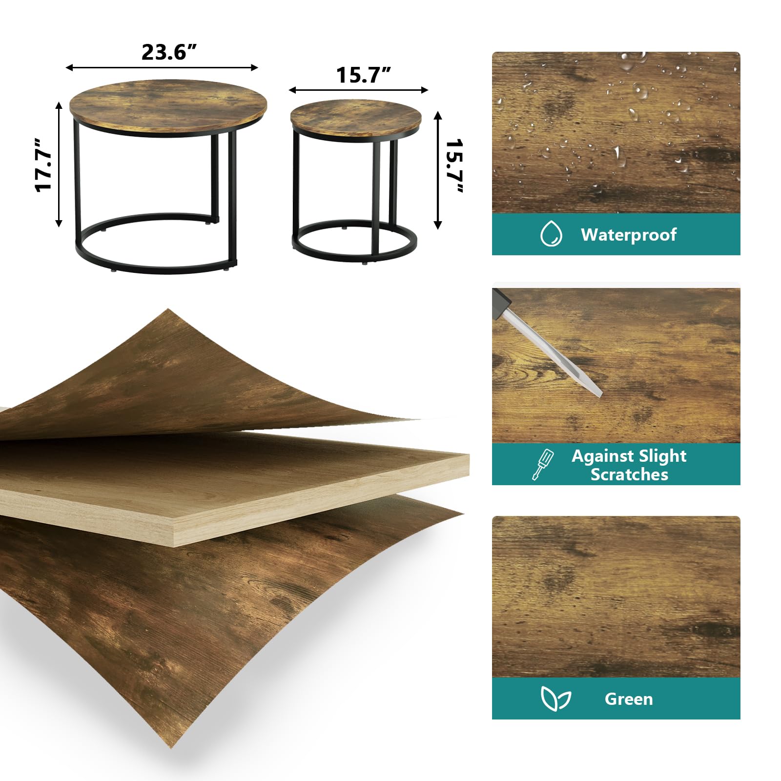 Smuxee Nesting Coffee Table Set of 2, 23.6" Round Coffee Table Wood Grain Top with Adjustable Non-Slip Feet, Industrial End Table Side Tables for Living Room Bedroom Balcony Yard