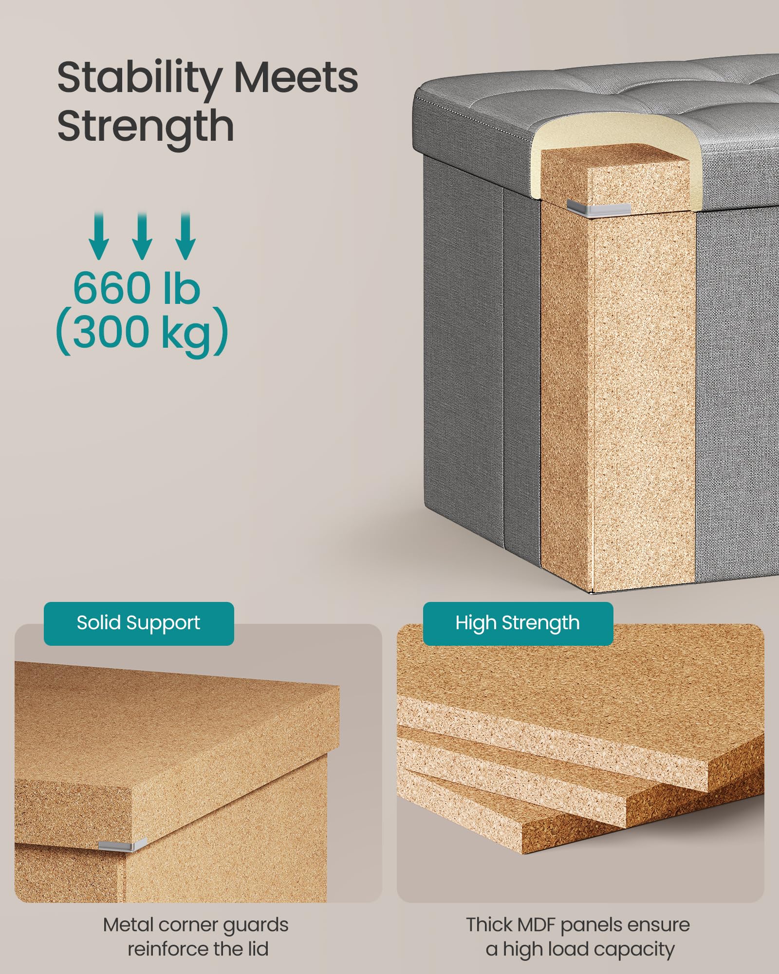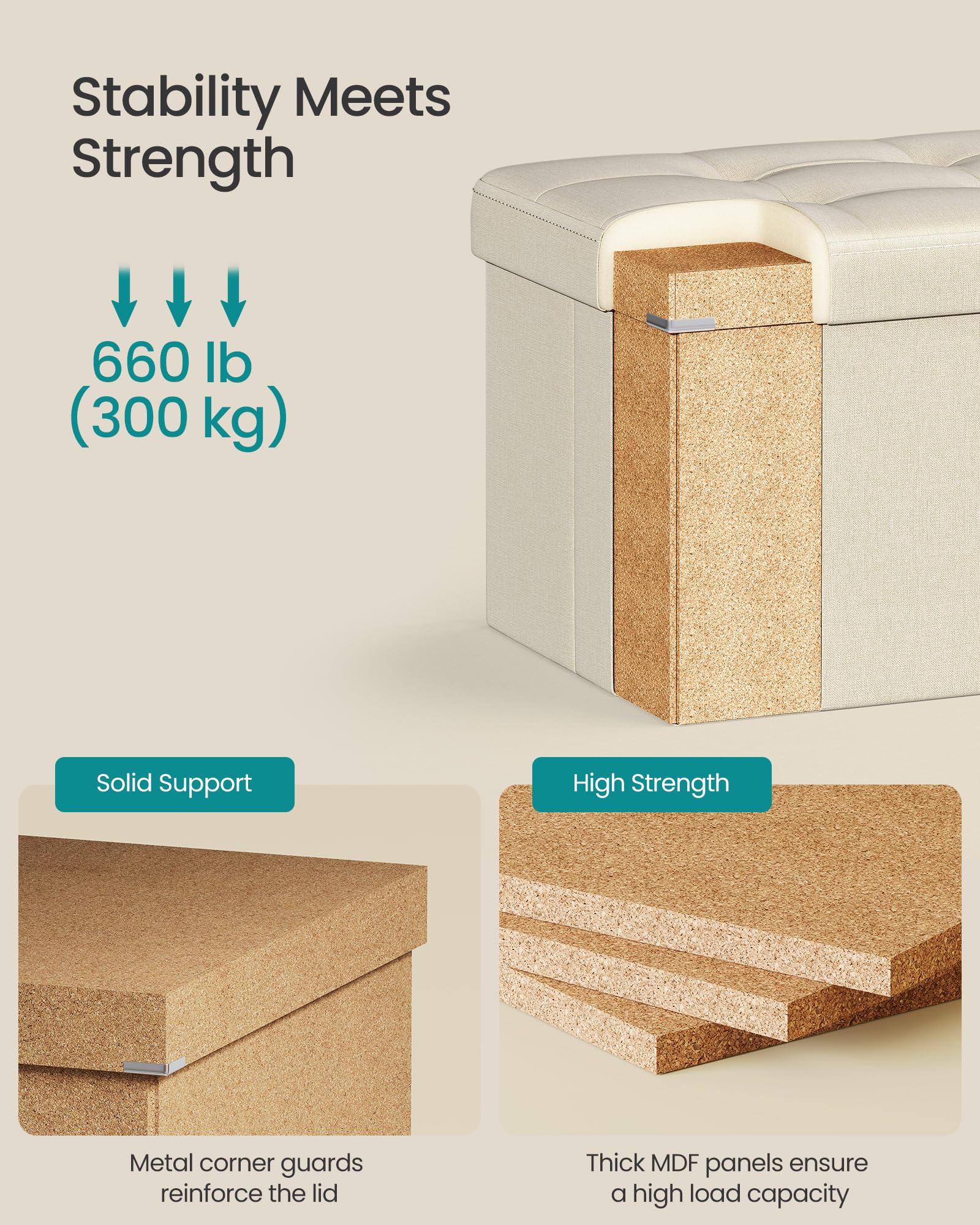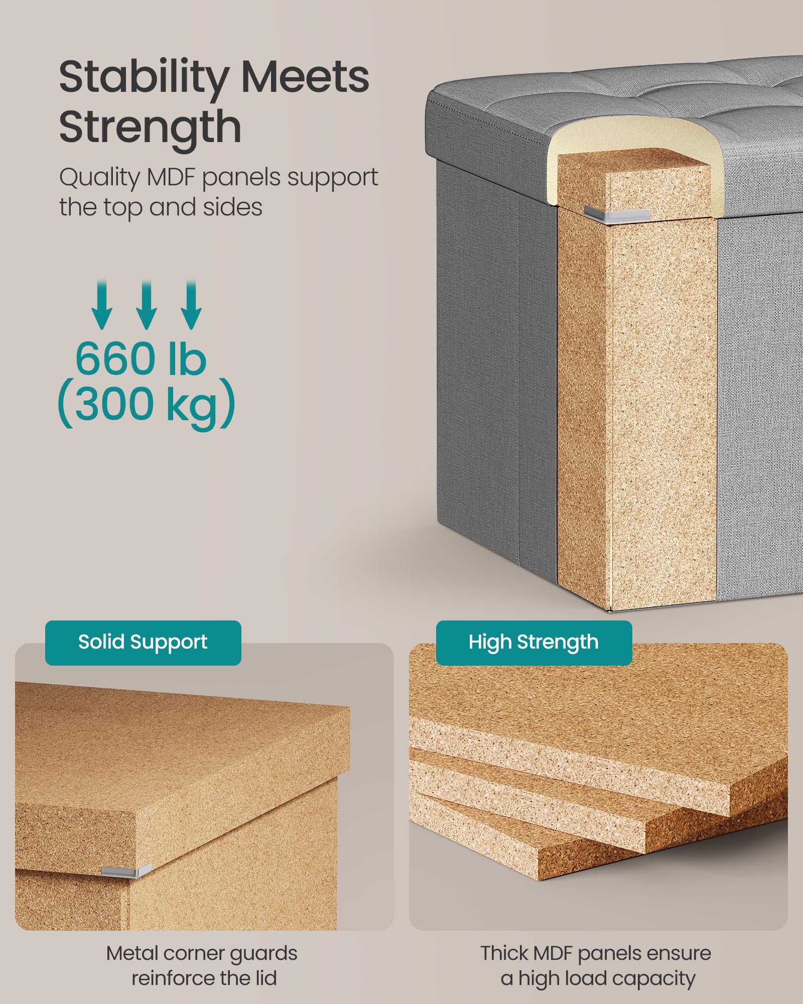 • 【STURDY AND DURABLE】Built with premium MDF panels and reinforced with metal corner guards on the lid, this ottoman is strong enough to support up to 660 lb (300 kg), making it a reliable seating or storage solution that will stand the test of time
