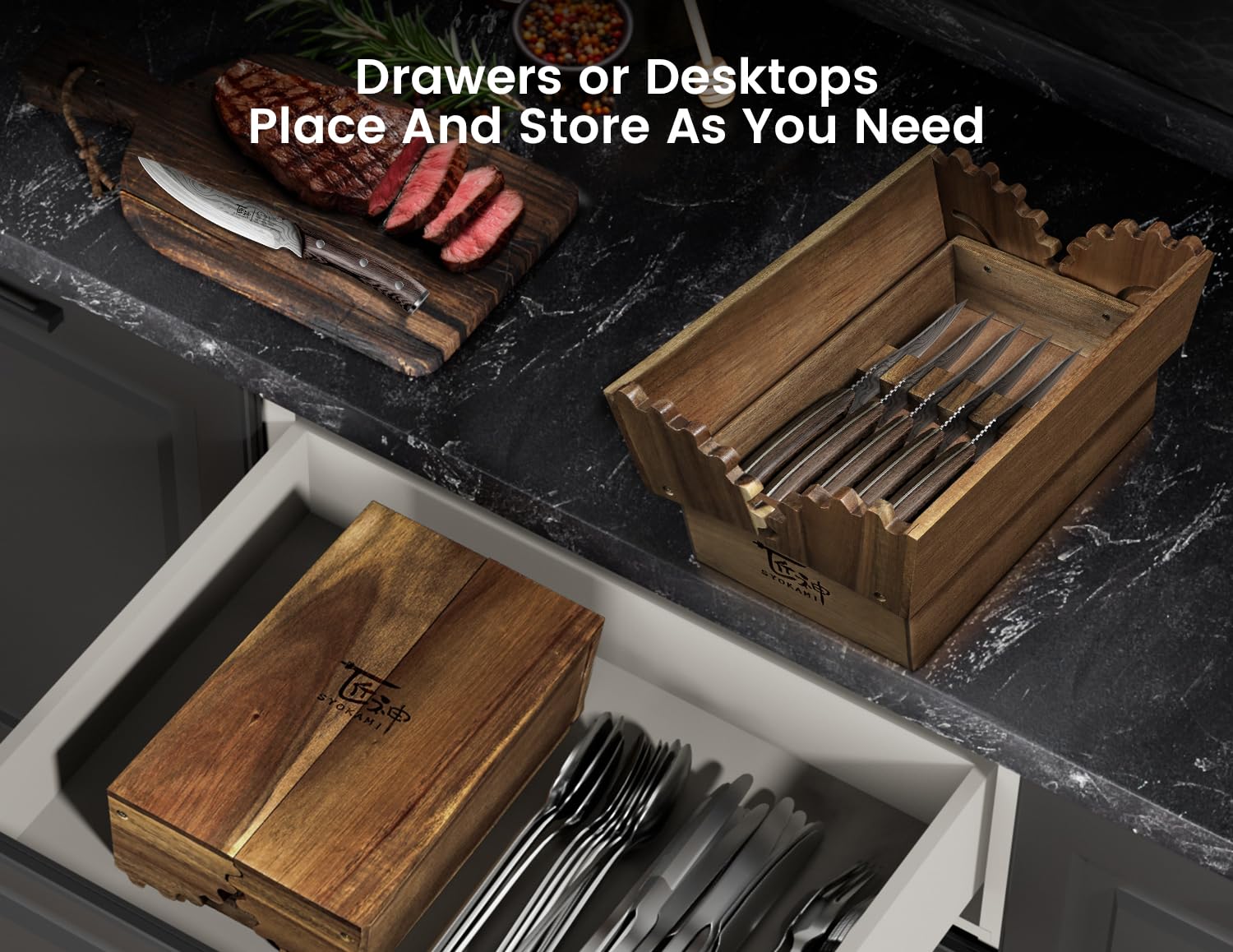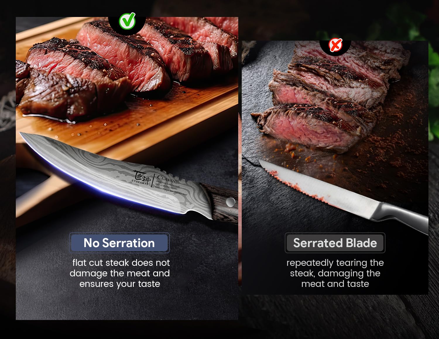 SYOKAMI steak knives are forged to HRC56+ from high quality and safe material Japanese high carbon stainless steel, hand-sharpened to a 15-degree blade angle on each side, offering excellent and durable sharpness. Non-serrated straight-edge blade allows a smooth slice on steaks and will not tear the meat fibers to lock the original flavor and nutrition of the steak
